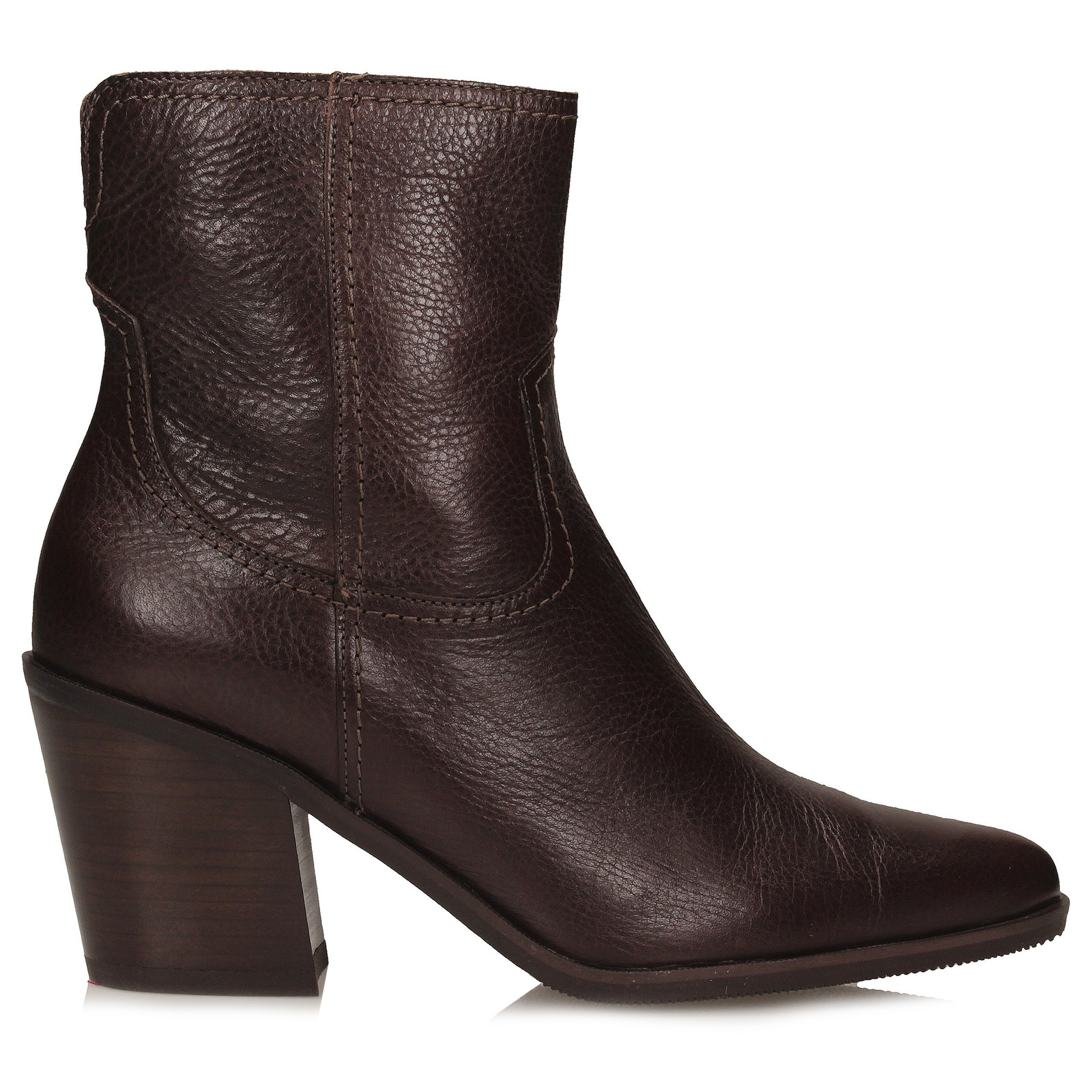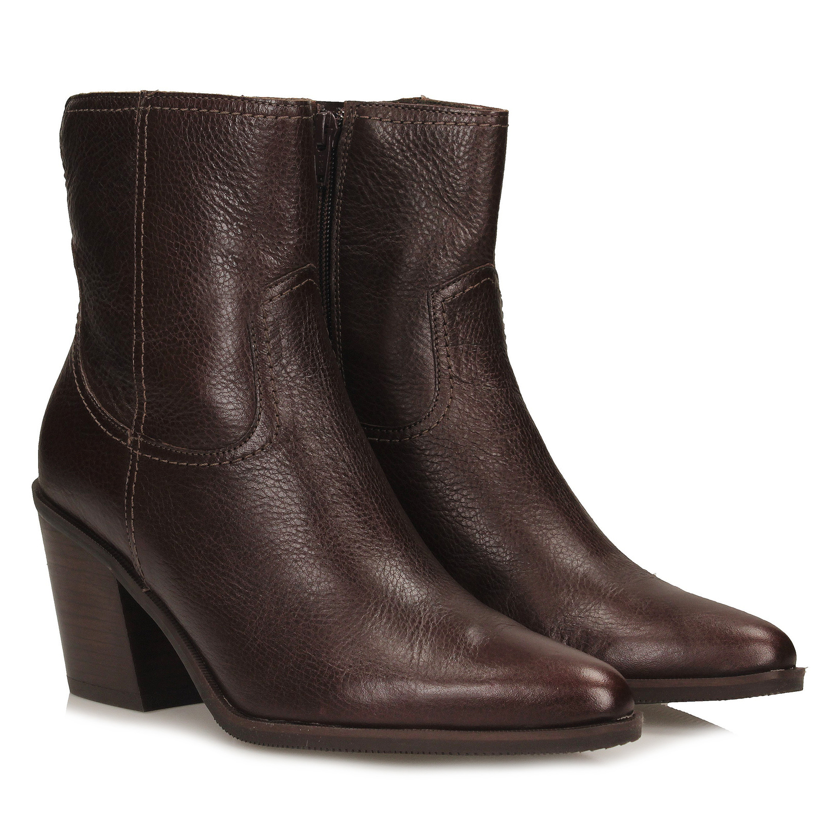 Botki Ryłko w kolorze brązowym to stylowa propozycja typu kowbojki, łącząca nowoczesny design z klasycznymi elementami westernowego stylu. Wykonane z wysokiej jakości skóry naturalnej, wyróżniają się eleganckim wykończeniem oraz charakterystycznym, lekko wydłużonym noskiem w szpic.