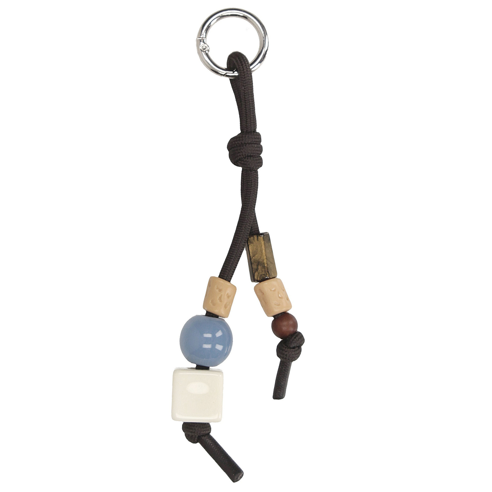 Stylowy brelok do torebki marki Toscanio, wykonany z lekkiego tworzywa sztucznego, ozdobiony koralikami w odcieniach bieli, beżu i brązu. Świetnie sprawdzi się jako elegancka ozdoba do torebki lub kluczy.