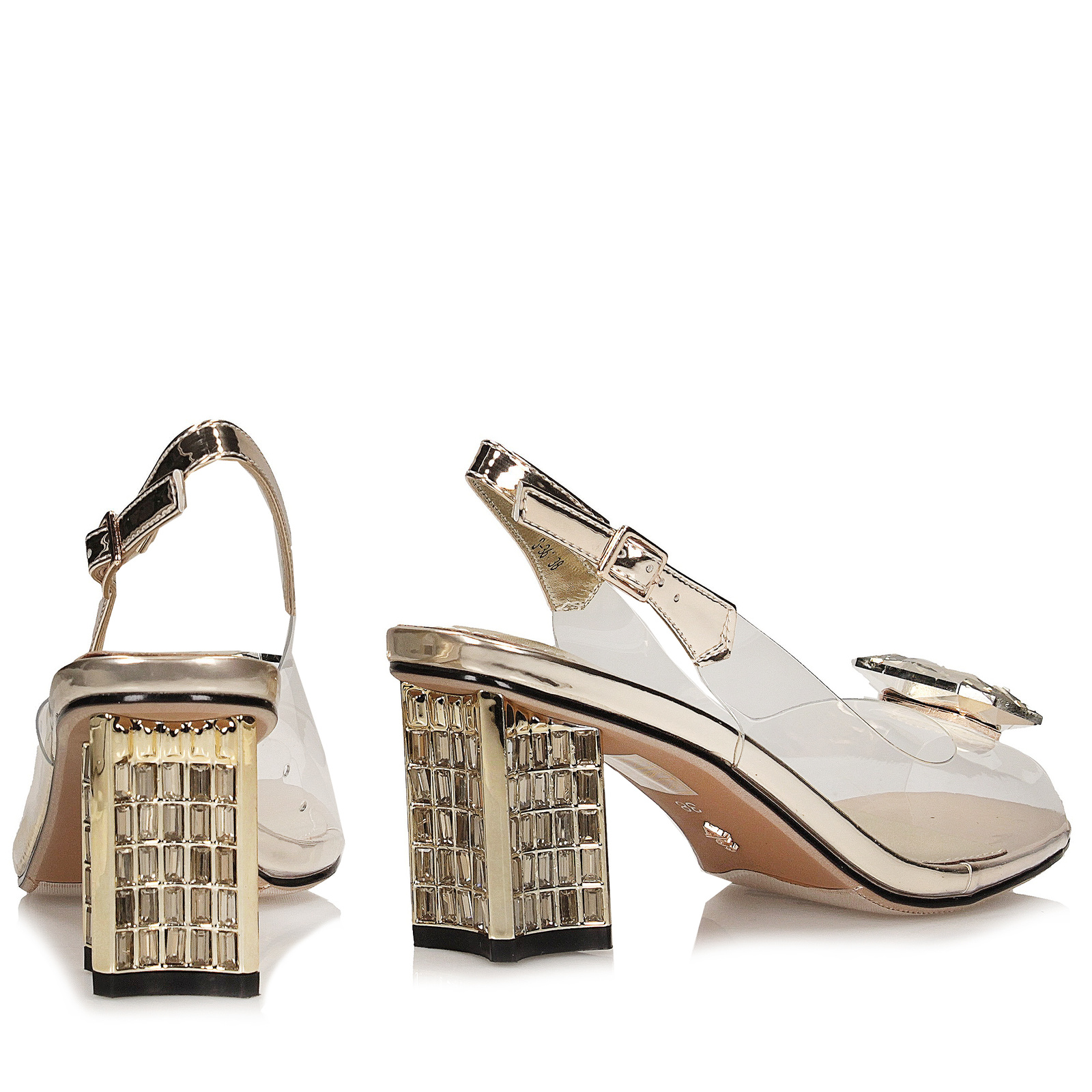 Złote sandały marki Scaviola to efektowny model, który przyciąga wzrok luksusowym wykończeniem i oryginalnym designem. Cholewka wykonana z przezroczystego tworzywa subtelnie eksponuje stopę, a centralna, duża złota cyrkonia umieszczona na przodzie dodaje całości biżuteryjnego charakteru. Stabilny słupek o wysokości 6 cm został pokryty w całości złotym zdobieniem, co nadaje butom elegancji i szyku. Wnętrze wyścielone skórą naturalną zapewnia komfort noszenia, a zapięcie na sprzączkę umożliwia idealne dopasowanie. To idealna propozycja na wieczorne wyjścia lub specjalne okazje, gdzie styl i blask grają główną rolę.