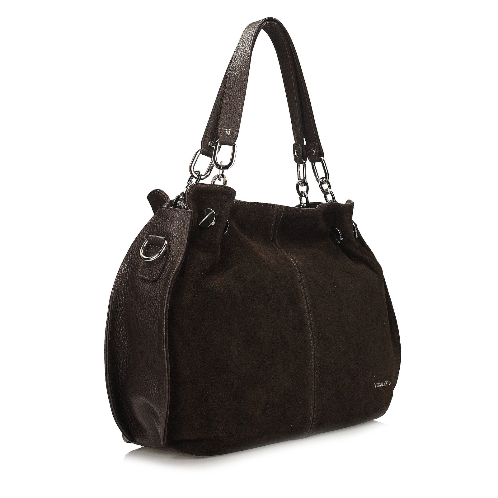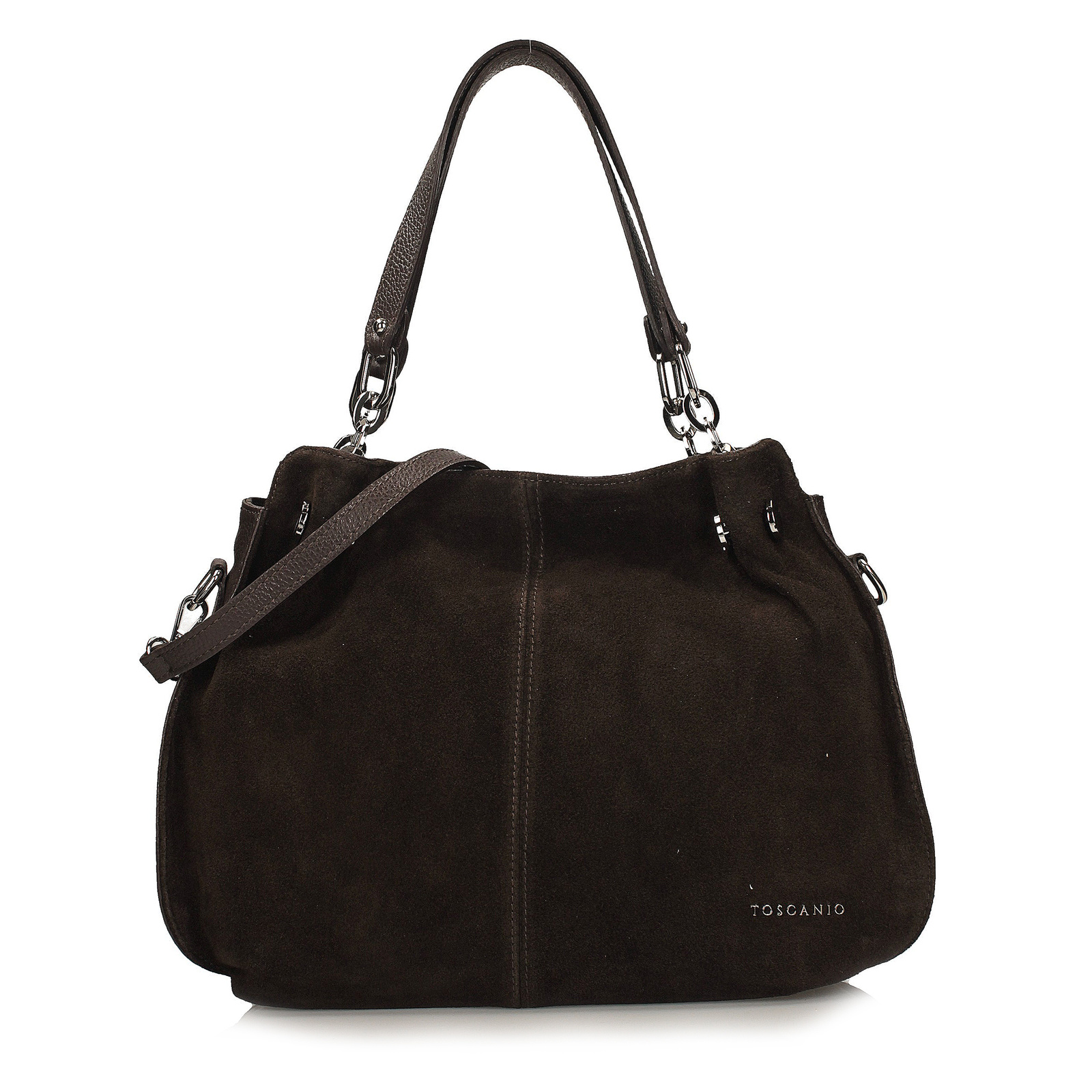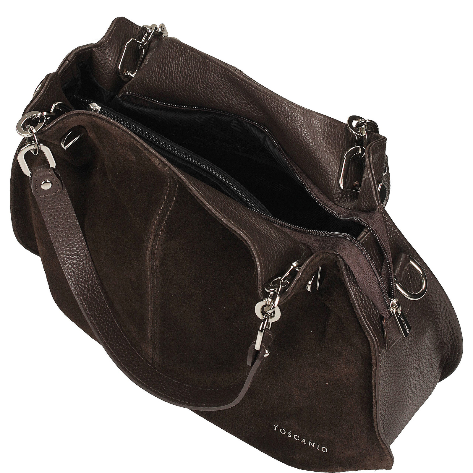 Elegancka torebka damska Toscanio łączy w sobie klasykę, nowoczesne detale i wyjątkową dbałość o wykończenie. Jej przód wykonany jest z miękkiej skóry zamszowej, która nadaje całości subtelnej głębi i szlachetnego charakteru, natomiast pozostała część powstała z naturalnej skóry licowej o groszkowej fakturze. Takie zestawienie materiałów sprawia, że model prezentuje się niezwykle stylowo, a jednocześnie zachowuje trwałość i elegancję na lata.