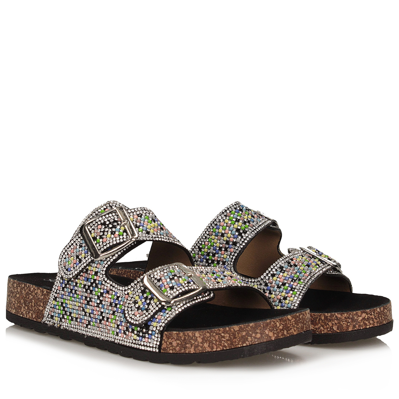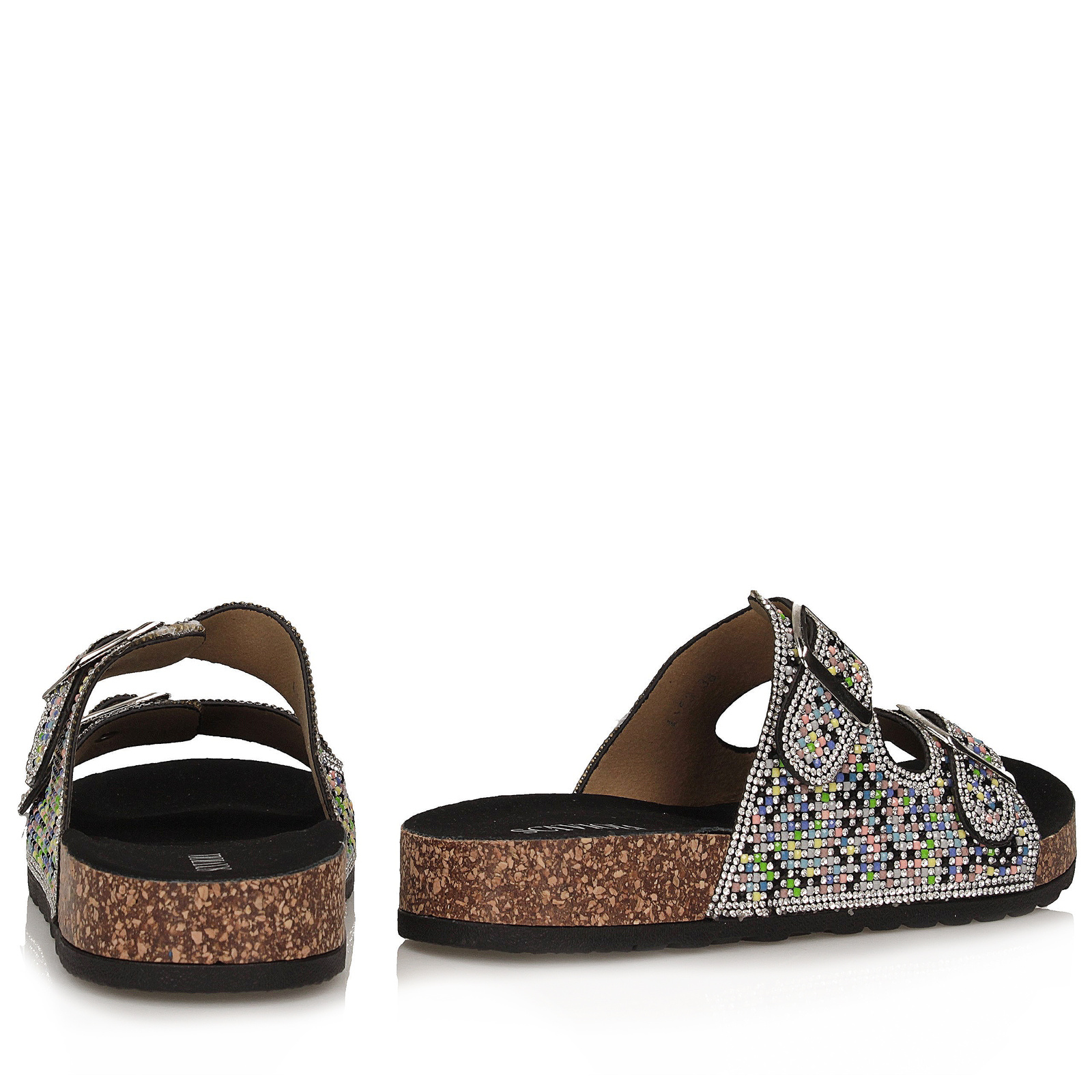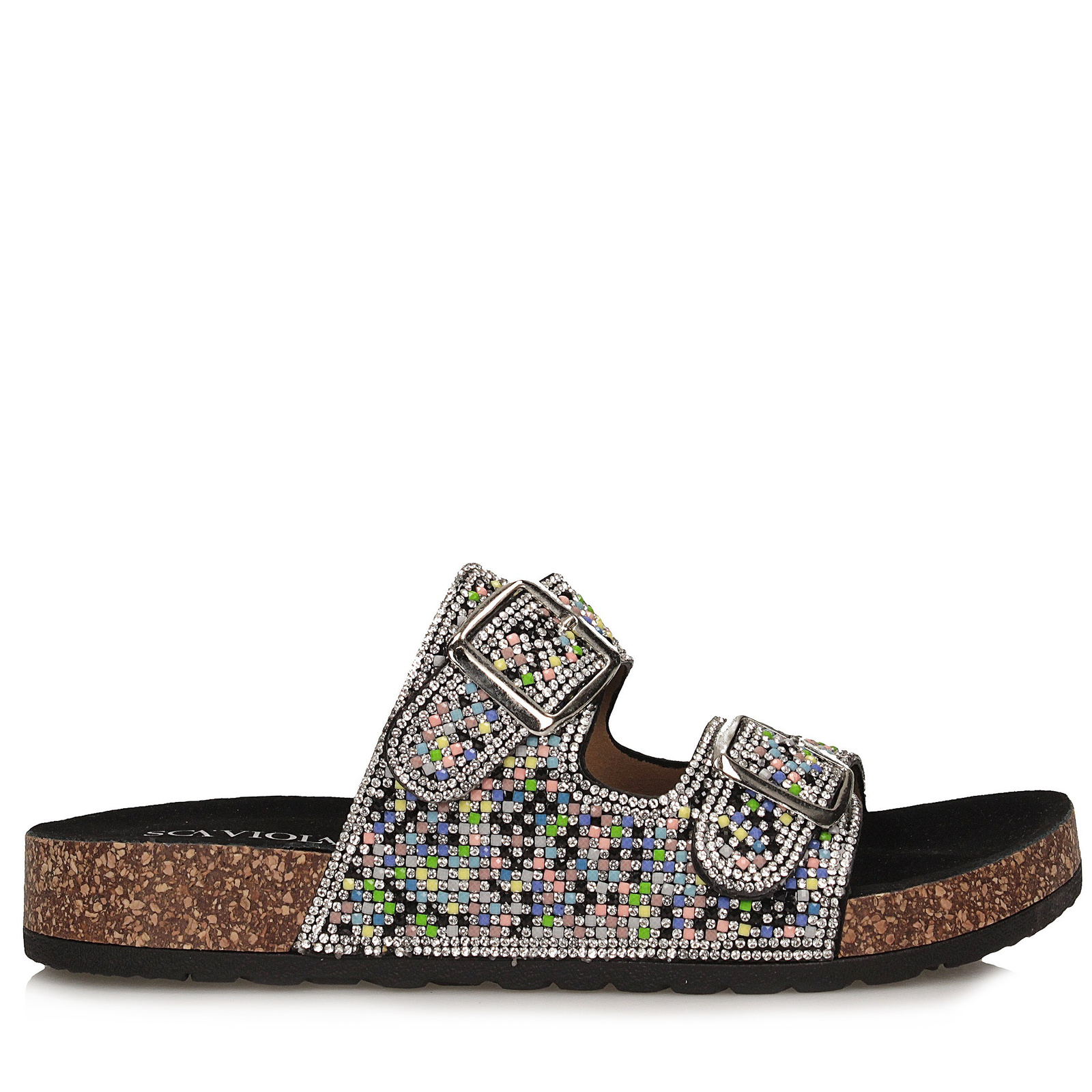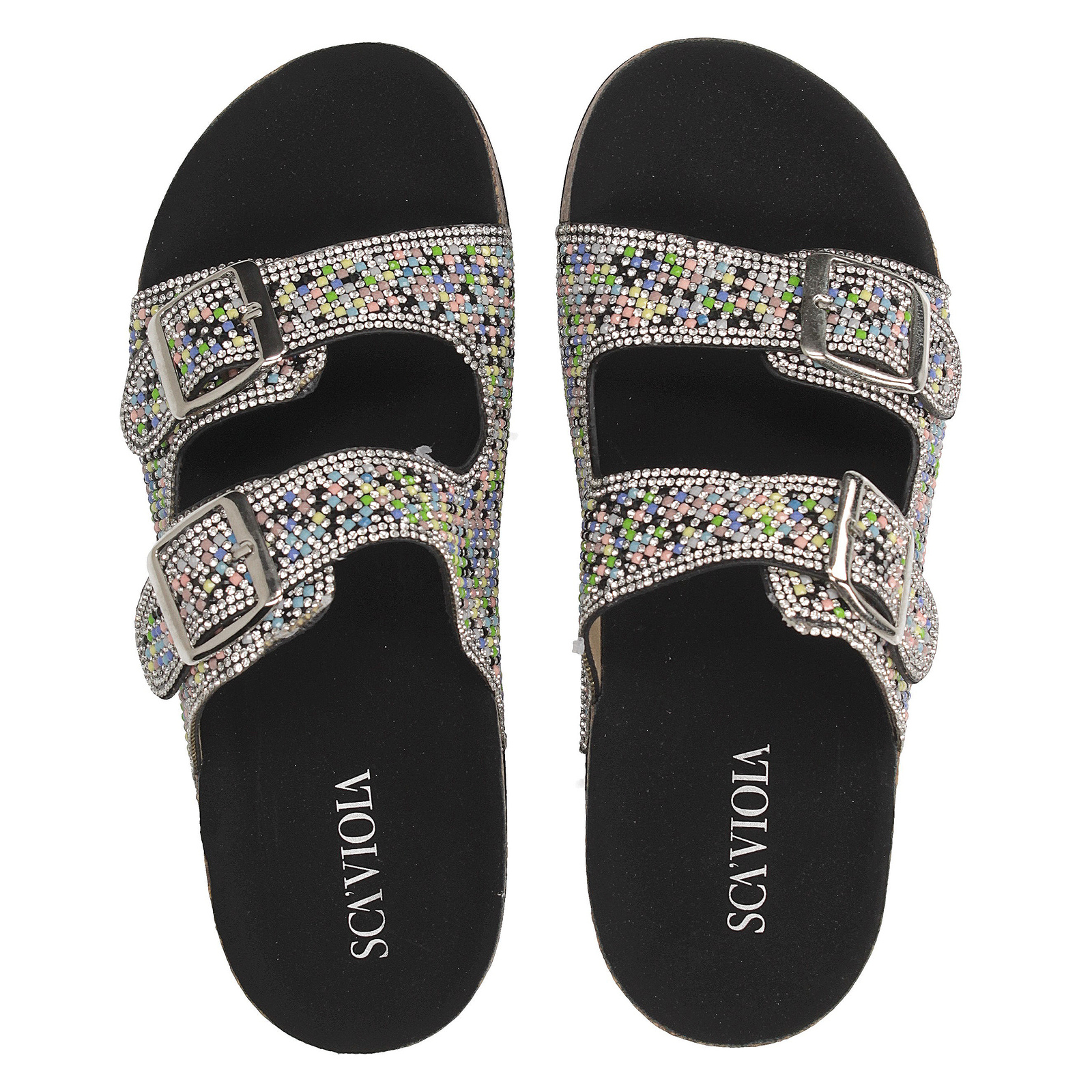 Damskie klapki Scaviola to połączenie komfortu i spektakularnego blasku. Model wsuwany na płaskim obcasie (wysokość: 3 cm) wykonany został z tworzywa sztucznego o czarnej bazie, którą efektownie pokrywają połyskujące cyrkonie w odcieniach srebra, różu i błękitu. Migdałowy nosek i smukły kształt podkreślają kobiecy charakter butów, a subtelne profilowanie zapewnia wygodę noszenia. To propozycja idealna zarówno na letnie wyjścia, jak i na specjalne okazje, gdzie liczy się nie tylko komfort, ale i wyrazisty styl.