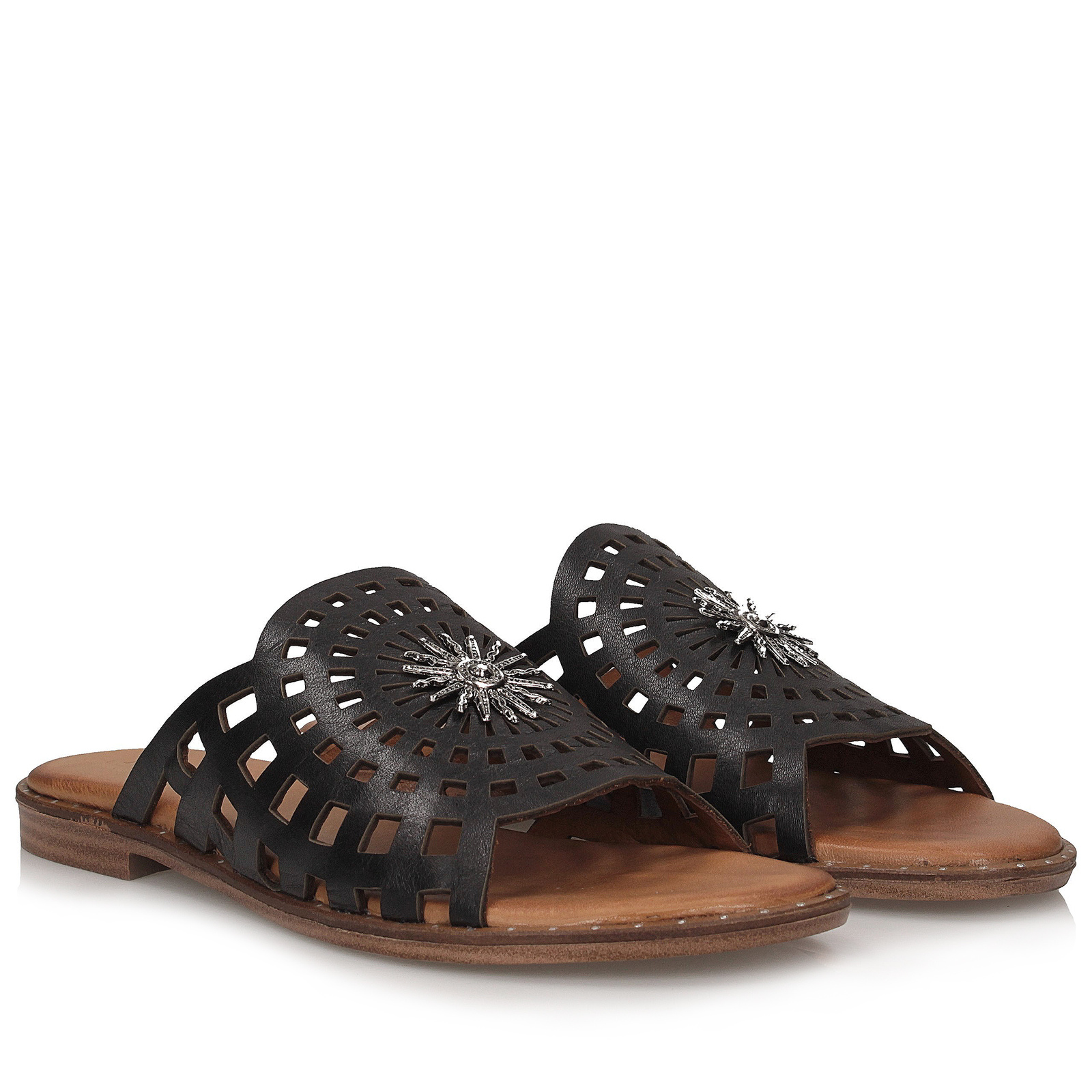 Model osadzony jest na niskim, 1-centymetrowym obcasie, co sprawia, że klapki idealnie nadają się do codziennego użytku – zarówno w domu, jak i podczas letnich spacerów czy miejskich stylizacji. Okrągły nosek dodaje im klasycznego charakteru, a czarny kolor czyni je uniwersalnym dodatkiem do niemal każdej garderoby.