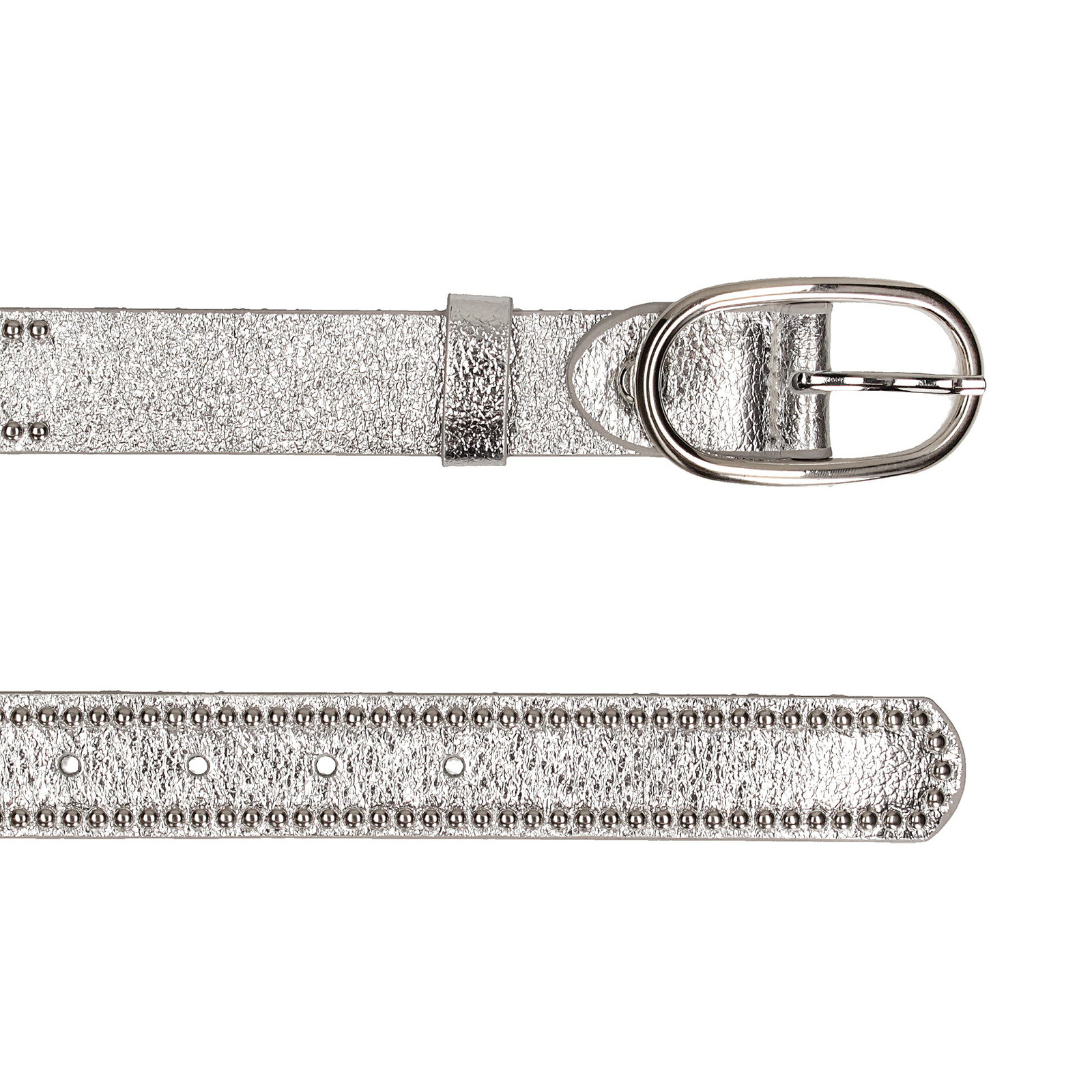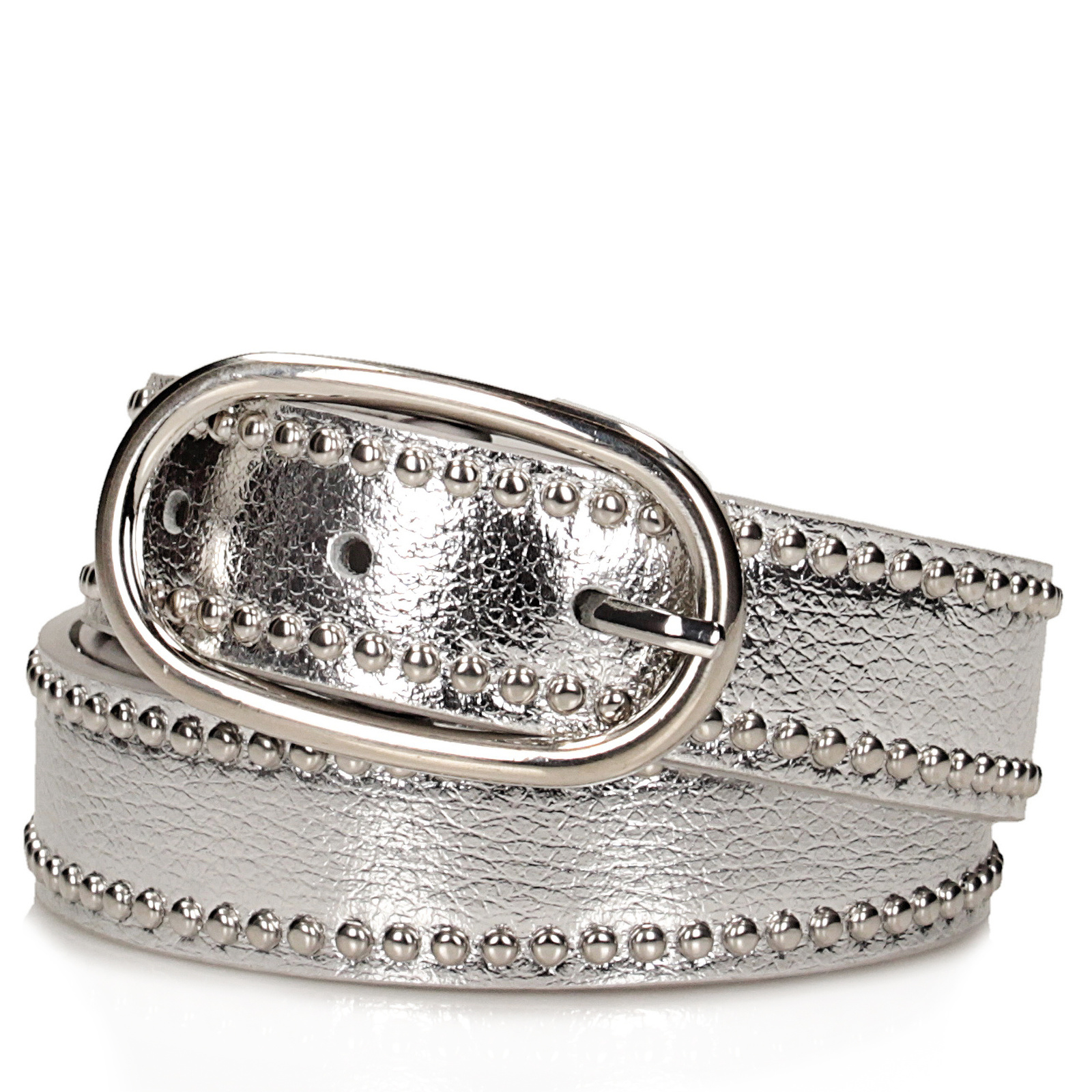 Elegancki pasek damski marki Toscanio wykonany z wysokiej jakości skóry naturalnej w metalicznym srebrnym odcieniu. Ma szerokość 3 cm, dzięki czemu doskonale pasuje do spodni i spódnic z klasycznymi szlufkami. Jego ozdobą są drobne dżety rozmieszczone na całej długości oraz stylowa, owalna klamra w kolorze srebrnym, która nadaje całości nowoczesnego i wyrazistego charakteru. Idealny dodatek do stylizacji z nutą rockowej elegancji.