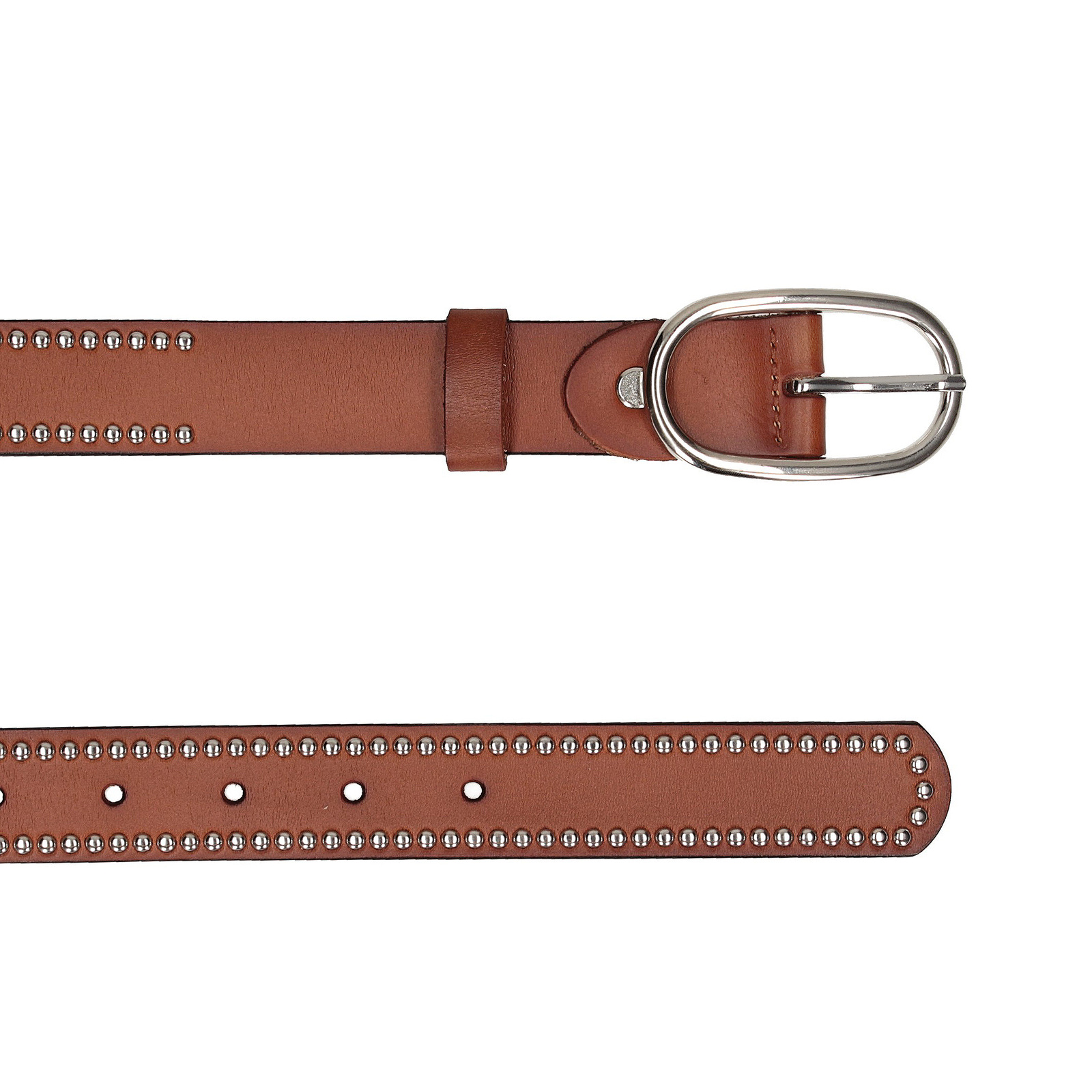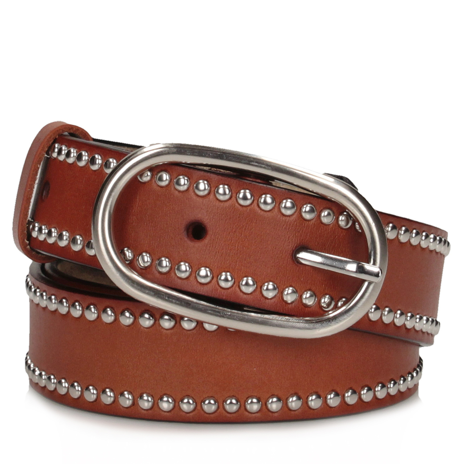 Stylowy pasek damski marki Toscanio wykonany z wysokiej jakości skóry naturalnej w rudym kolorze. Model ozdobiony błyszczącymi dżetami, które dodają charakteru i przyciągają wzrok. Wyposażony w efektowną, owalną klamrę w srebrnym kolorze, idealnie dopełniającą całość. Pasek o szerokości 3 cm sprawdzi się zarówno do jeansów, jak i eleganckich spodni czy sukienek. To wyrazisty dodatek, który podkreśli styl każdej stylizacji.
