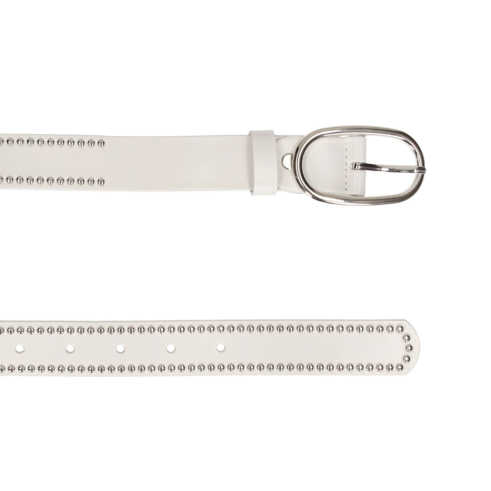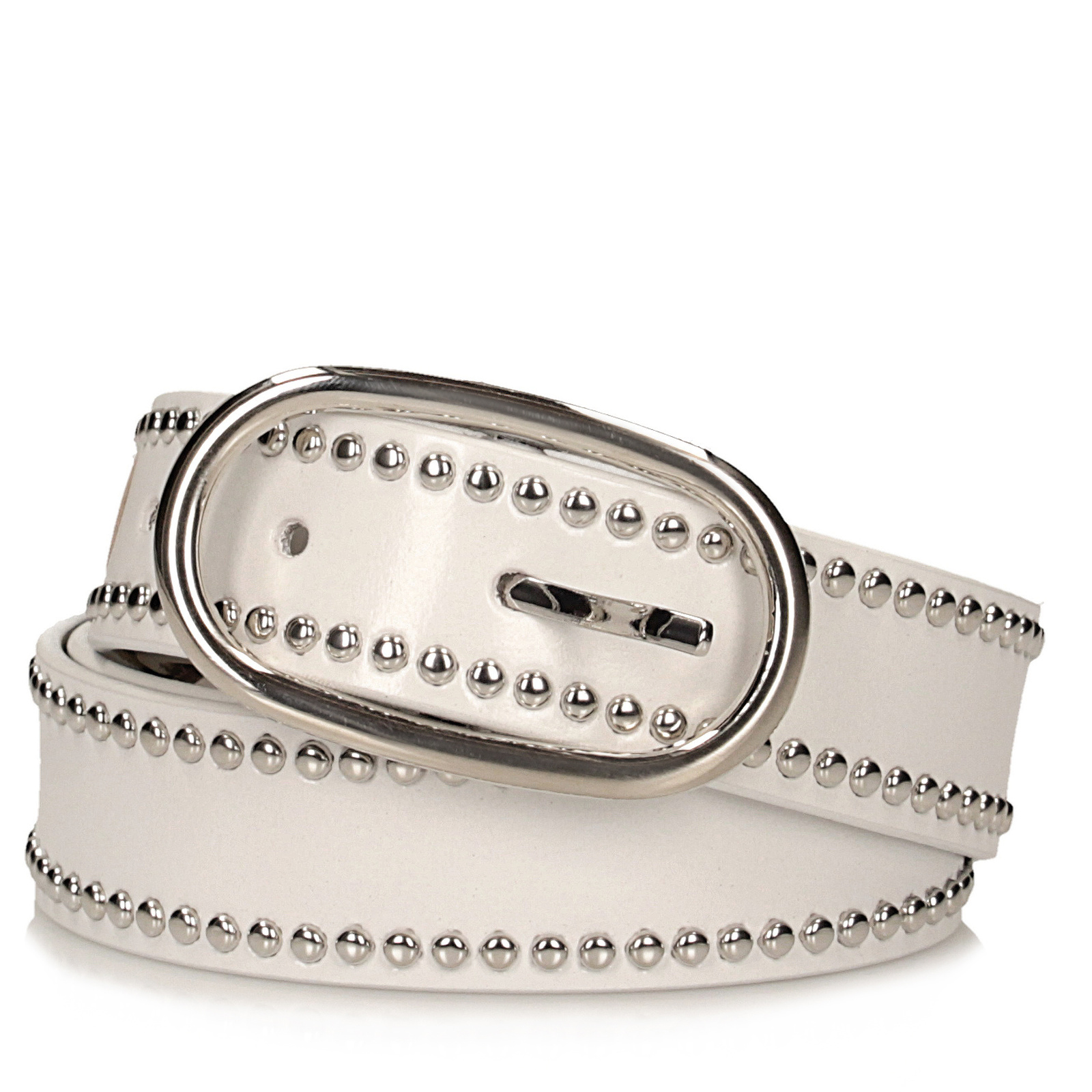 Elegancki i stylowy pasek do spodni od Toscanio wykonany z wysokiej jakości naturalnej skóry w klasycznym białym kolorze. Model wyróżnia się subtelnymi dżetami, które dodają mu charakteru, oraz ozdobną, owalną klamrą w srebrnym kolorze. Szerokość 3 cm sprawia, że idealnie pasuje zarówno do jeansów, jak i do eleganckich spodni. Pasek nie tylko podkreśla talię, ale również stanowi efektowny dodatek do wielu stylizacji.