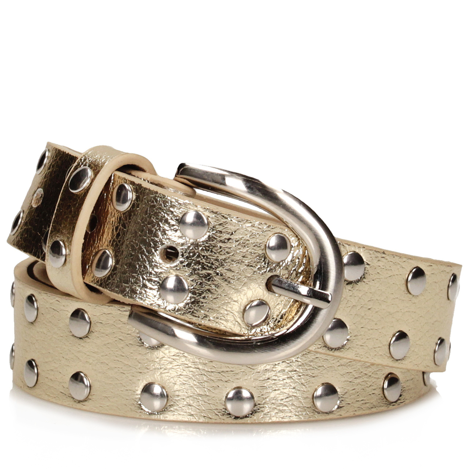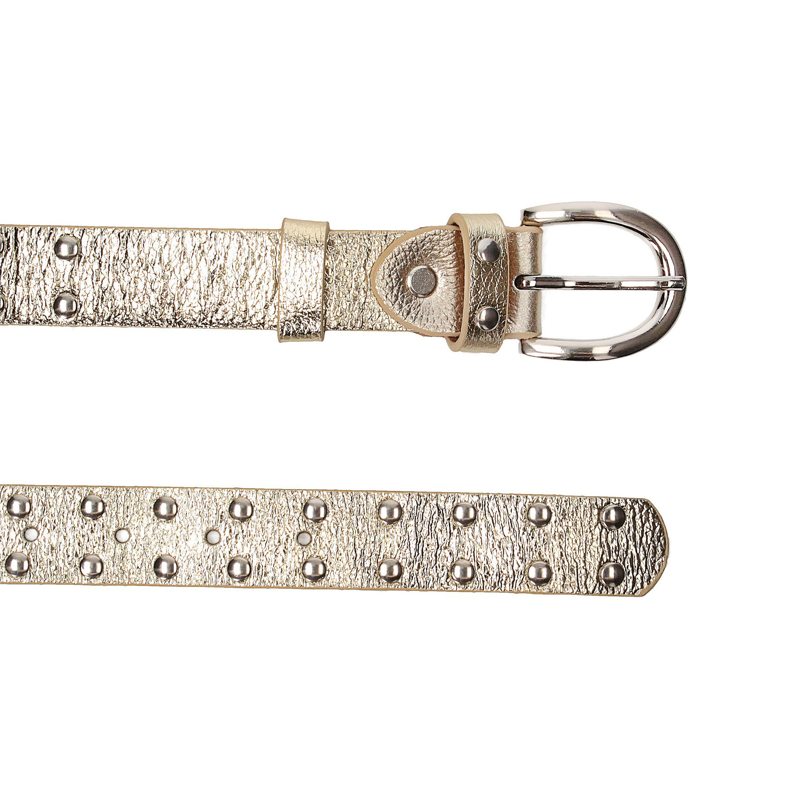 Złoty pasek damski marki Toscanio to propozycja dla kobiet, które lubią stylowe akcenty w codziennych stylizacjach. Wykonany z wysokiej jakości skóry naturalnej, został ozdobiony subtelnymi dżetami na całej długości, które przyciągają wzrok i dodają charakteru. Pasek ma szerokość 2 cm, co sprawia, że idealnie pasuje do większości szlufek w spodniach. Wykończony srebrną klamrą, łączy w sobie elegancję z nutą rockowego pazura. Doskonały dodatek zarówno do jeansów, jak i bardziej kobiecych stylizacji.