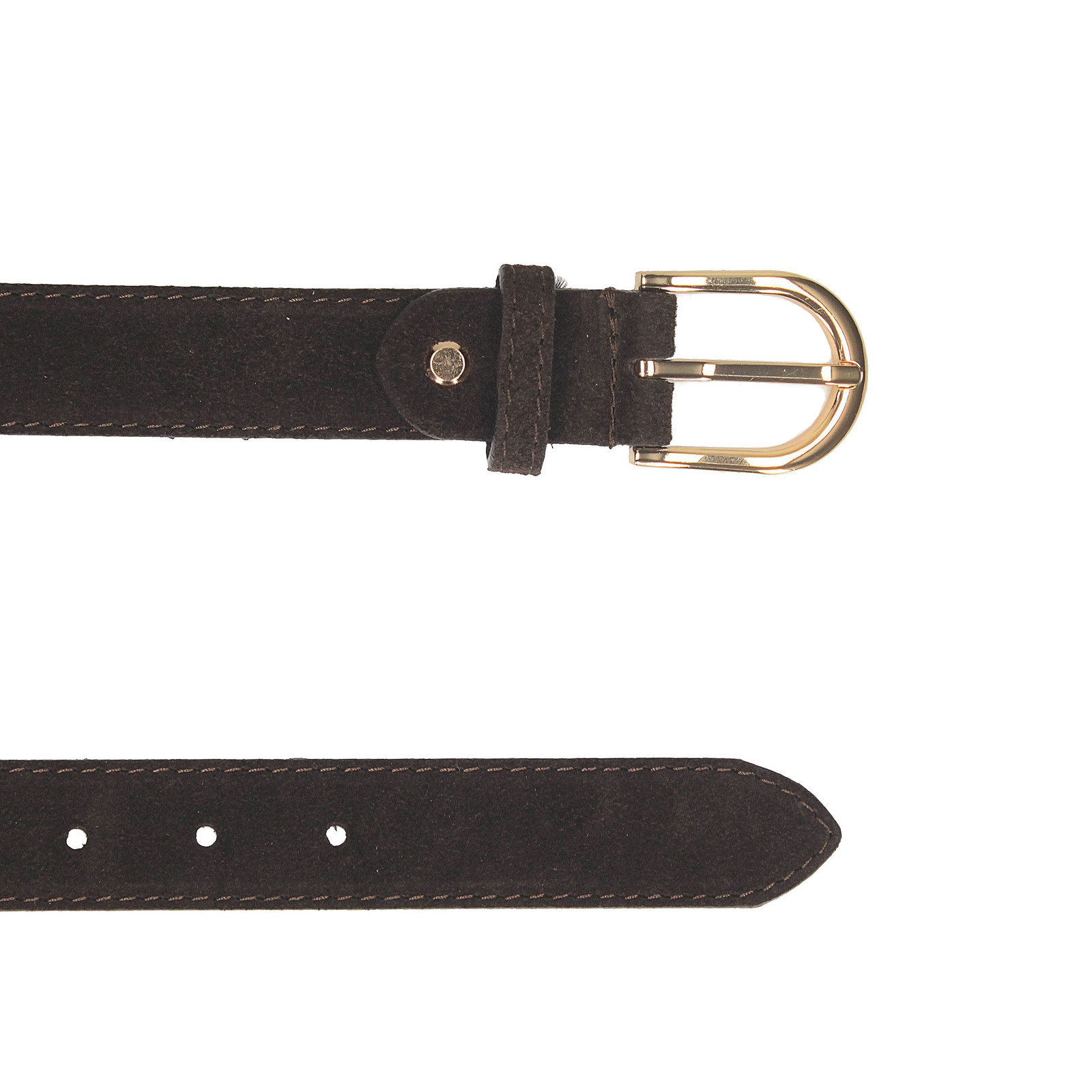 Model ma szerokość 3 cm, dzięki czemu doskonale sprawdza się w sukienkach, spodniach i spódnicach, subtelnie podkreślając talię lub dopełniając całość stroju. Złota klamra dodaje mu eleganckiego wykończenia i stanowi delikatny, biżuteryjny akcent, który harmonijnie współgra z brązowym zamszem.