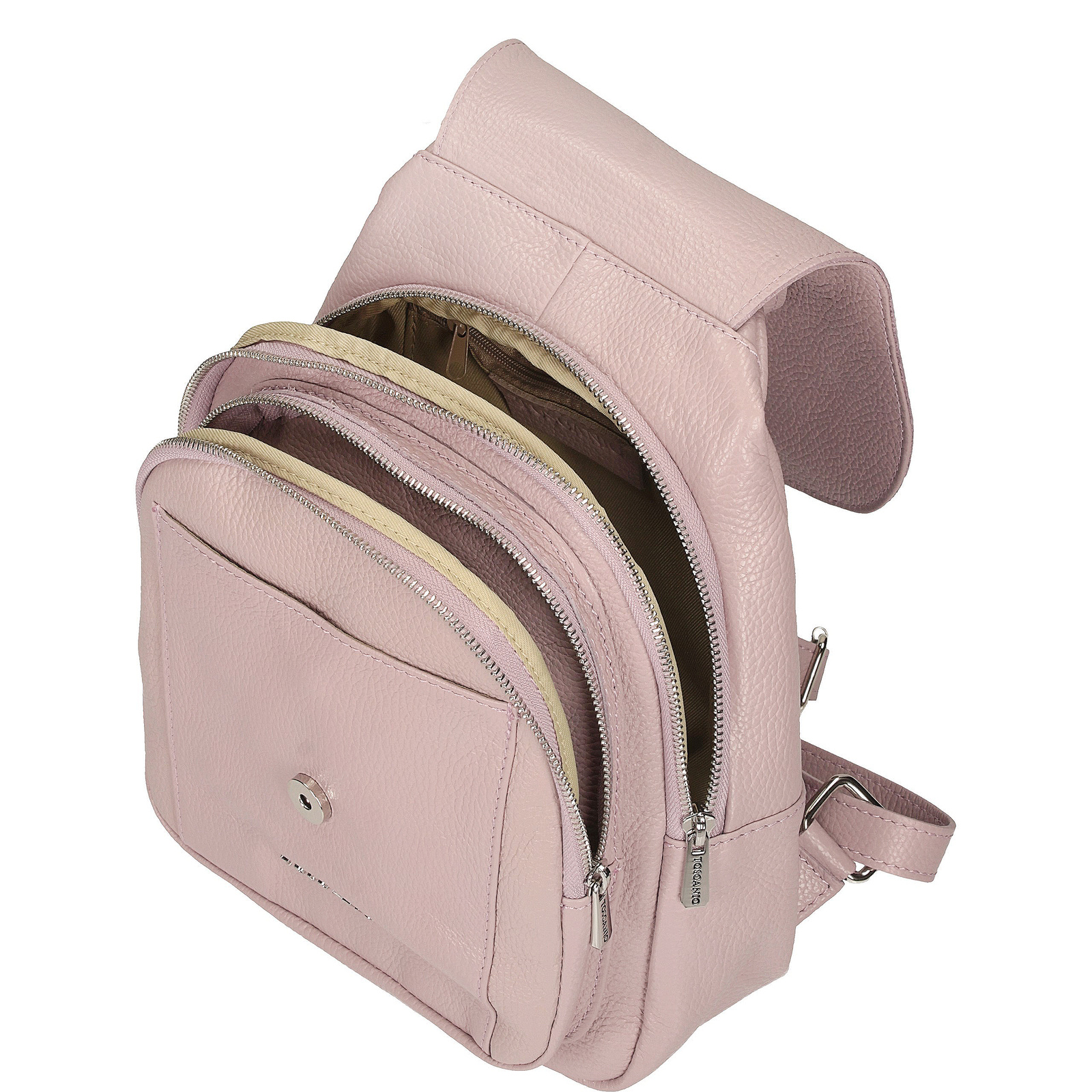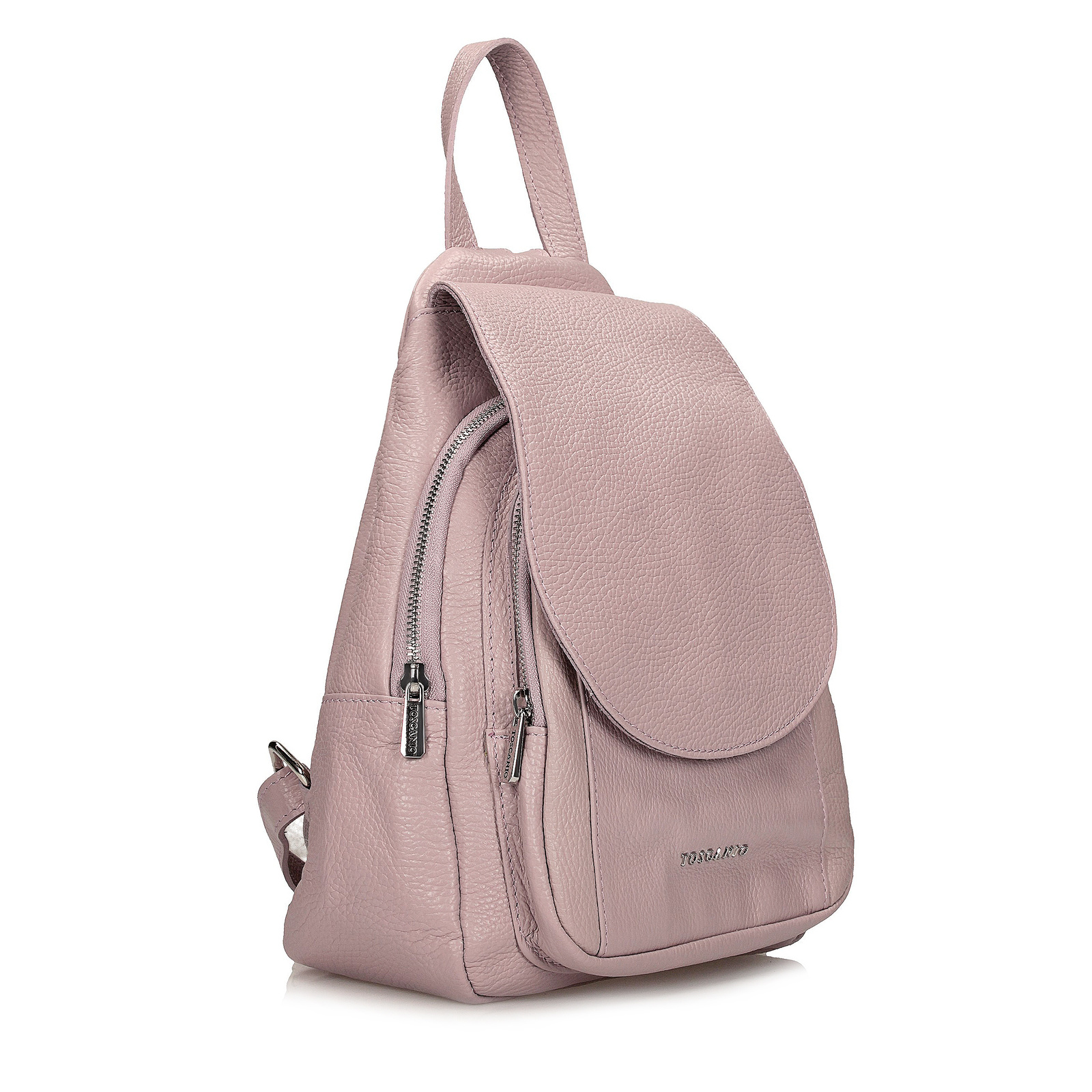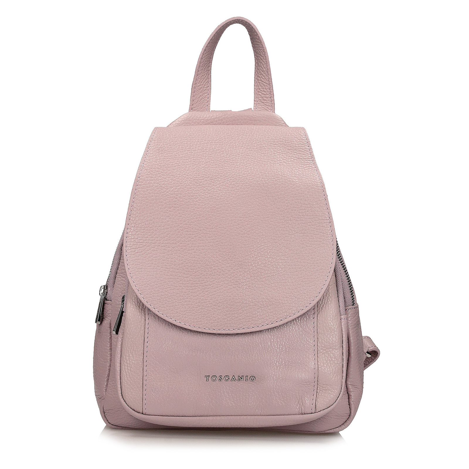 Solidny, wykonany z naturalnej, groszkowej skóry plecak, zawieszony na dwóch paskach i uchu,