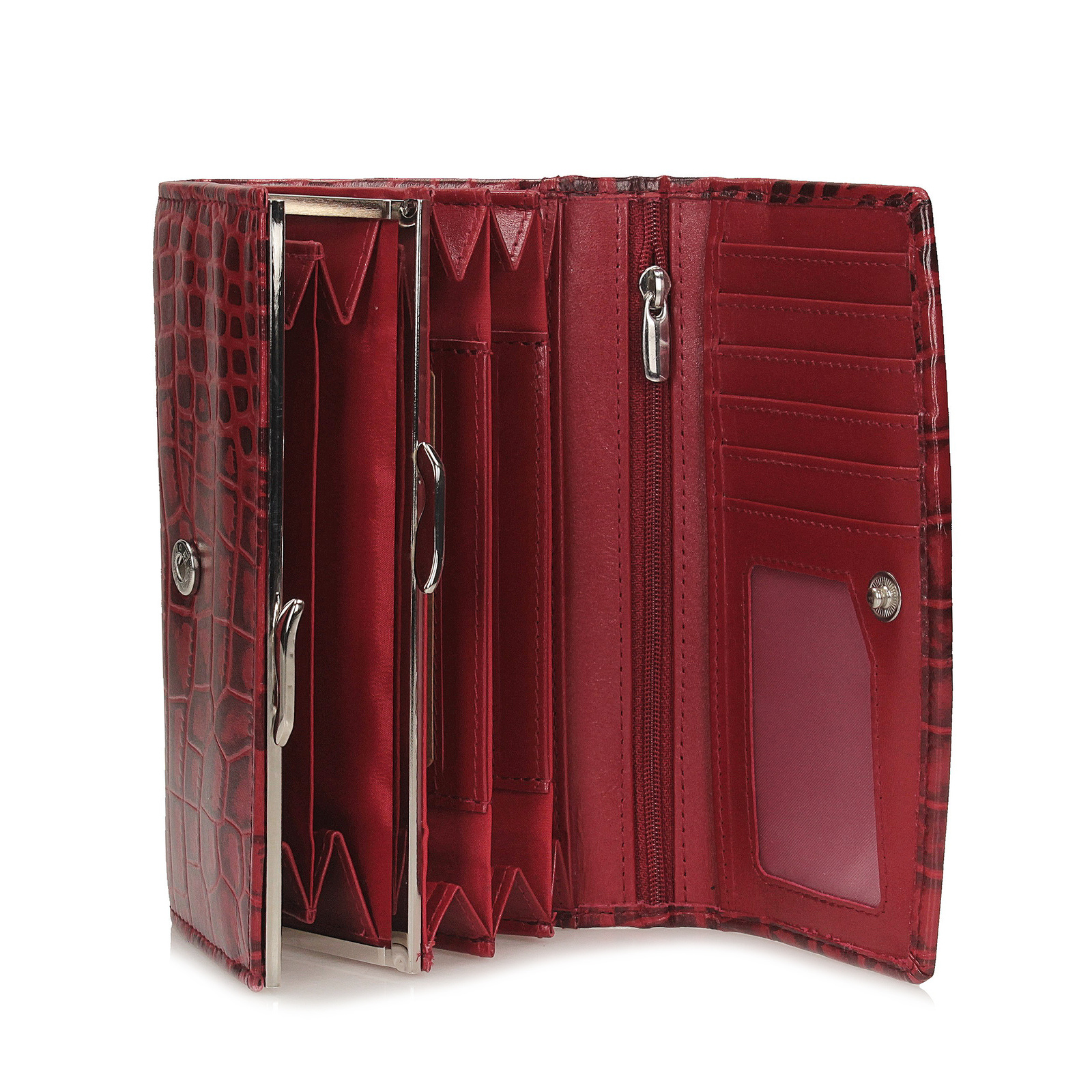 Wnętrze wykończone naturalną skórą zostało zaprojektowane z myślą o maksymalnej funkcjonalności. W środku znajdują się trzy komory oraz aż trzynaście kieszonek, które pozwalają uporządkować karty, dokumenty i drobne notatki. Dodatkowe miejsce na monety ułatwia przechowywanie bilonu, a zewnętrzna kieszeń zwiększa wygodę użytkowania. Model zapinany jest na solidny metalowy zatrzask w kolorze srebra, który stanowi elegancki i subtelny akcent całości.