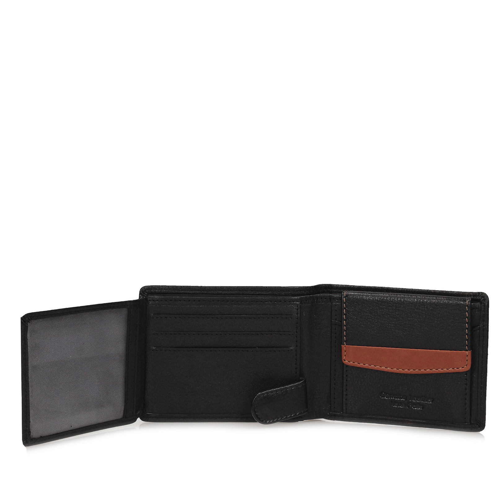 Czarny portfel Toscanio został wykonany w całości z miękkiej, naturalnej skóry, dzięki czemu prezentuje się elegancko i jest przyjemny w codziennym użytkowaniu. W środku znajdują się dwie komory oraz osiem praktycznych kieszonek, które wygodnie mieszczą karty i dokumenty. Model ma również wydzielone miejsce na monety, co znacznie ułatwia zachowanie porządku. Skórzane wykończenie z zewnątrz i wewnątrz podkreśla jego solidność, a minimalistyczna konstrukcja bez dodatkowego zapięcia nadaje mu nowoczesnego charakteru. To portfel idealny dla osób ceniących jakość i funkcjonalną prostotę.