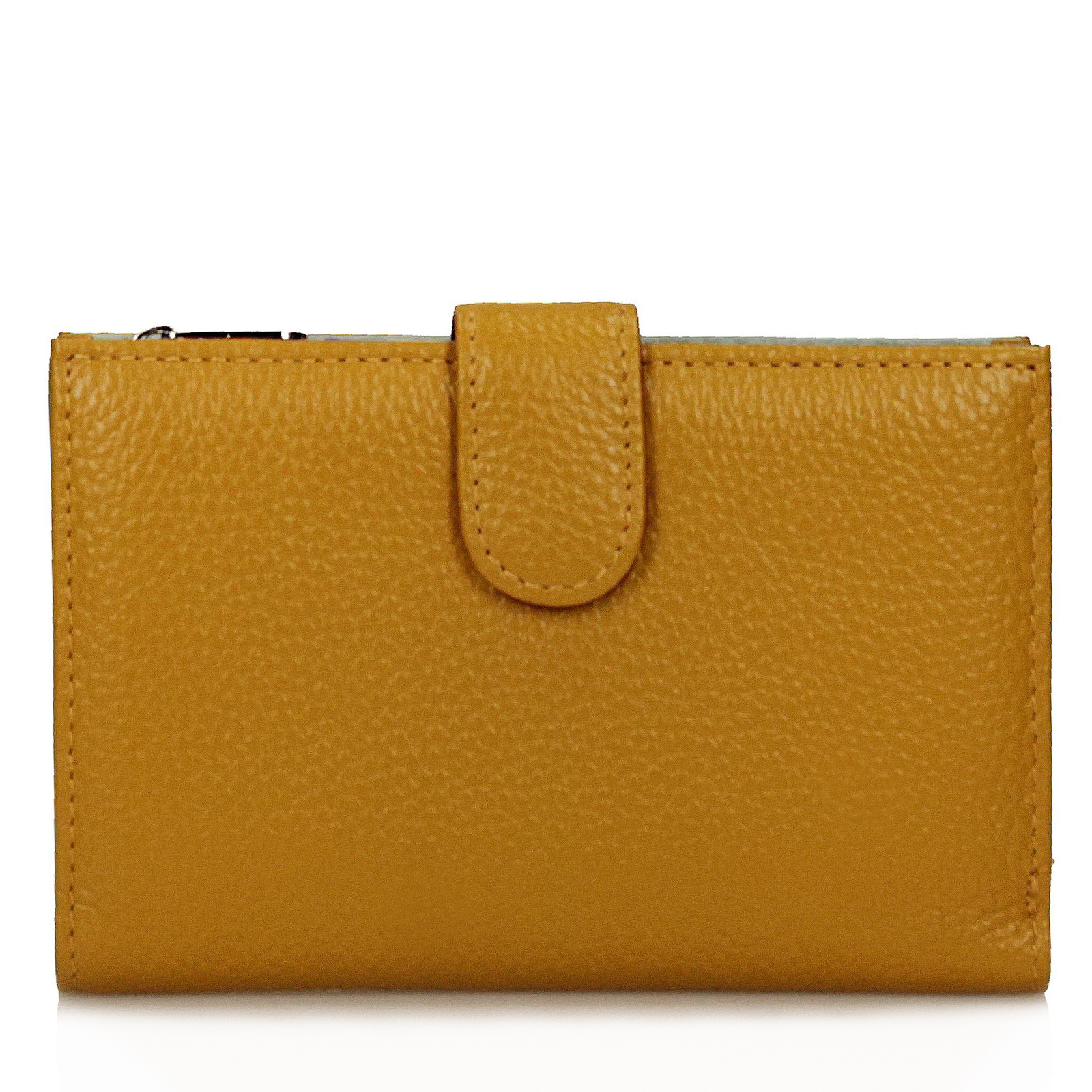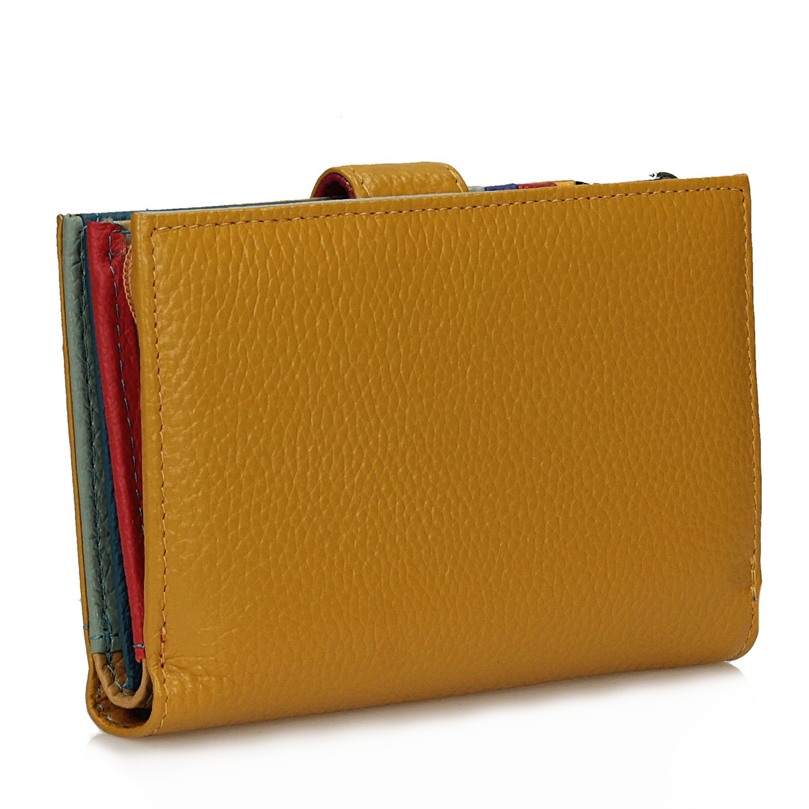 Portfel damski wykonany z naturalnej, groszkowej skóry, wyposażony w dwie główne komory, jedna