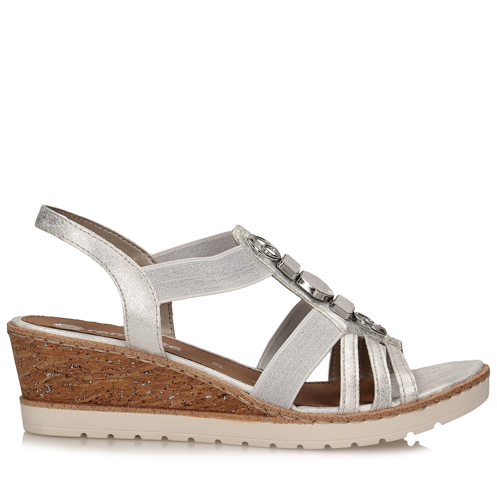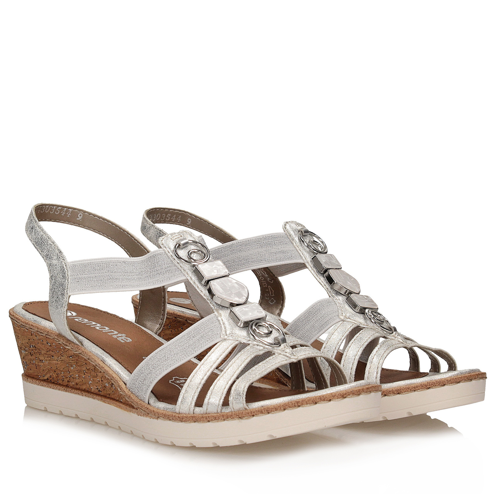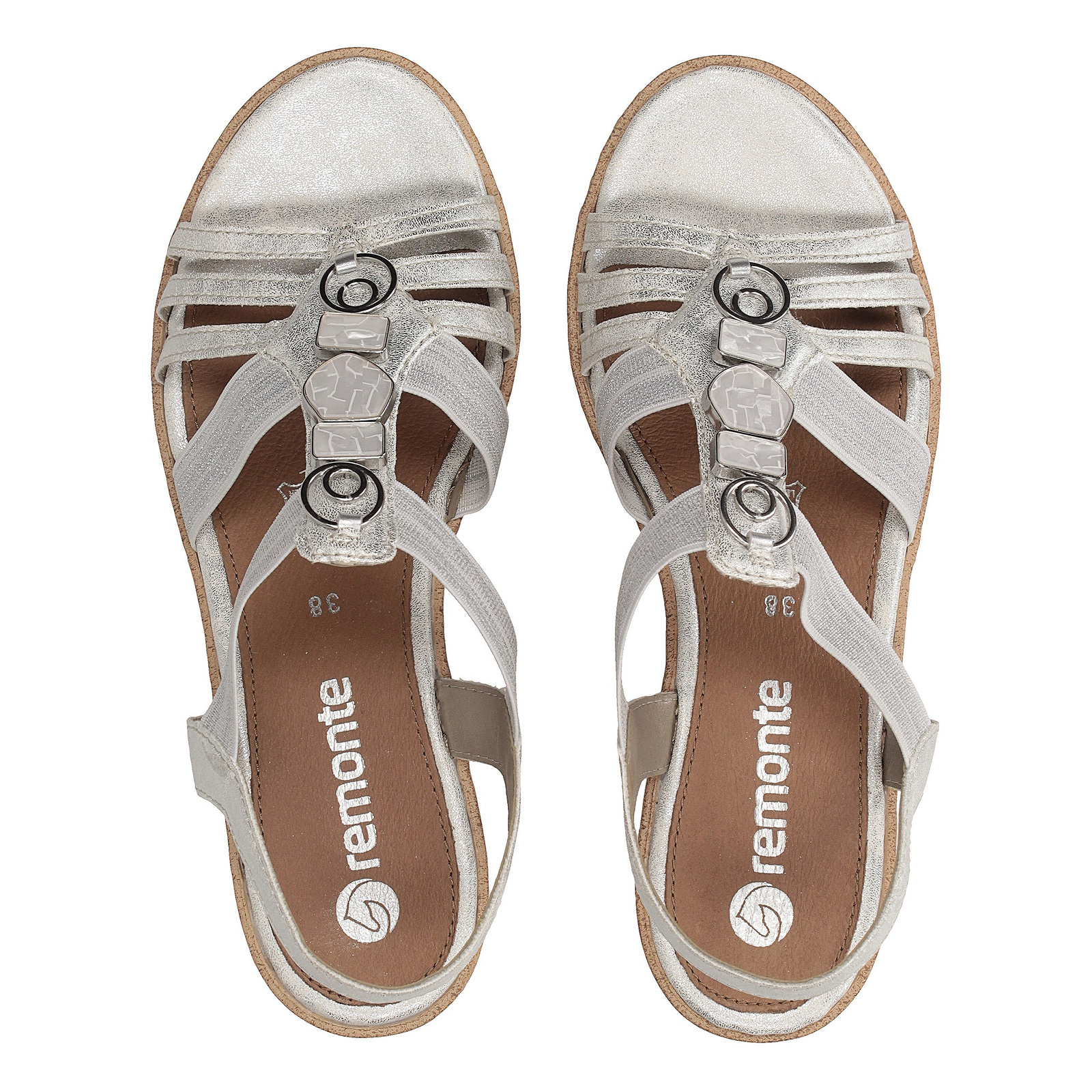 Stylowe sandały damskie marki Remonte wykonane z lekkiego tworzywa sztucznego w eleganckim srebrnym kolorze. Wnętrze buta wykończone zostało miękką skórą naturalną, co zapewnia komfort noszenia nawet przez wiele godzin. Model wsuwany, osadzony na wygodnym 5-centymetrowym koturnie, idealnie sprawdzi się na co dzień i na specjalne okazje. Centralnym elementem sandałów jest dekoracyjny pasek z błyszczącymi kamieniami, który dodaje im blasku i wyjątkowego charakteru.