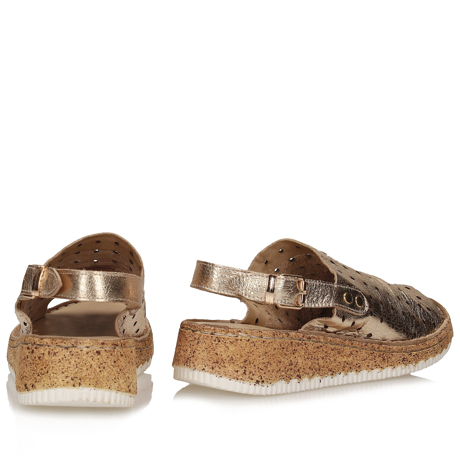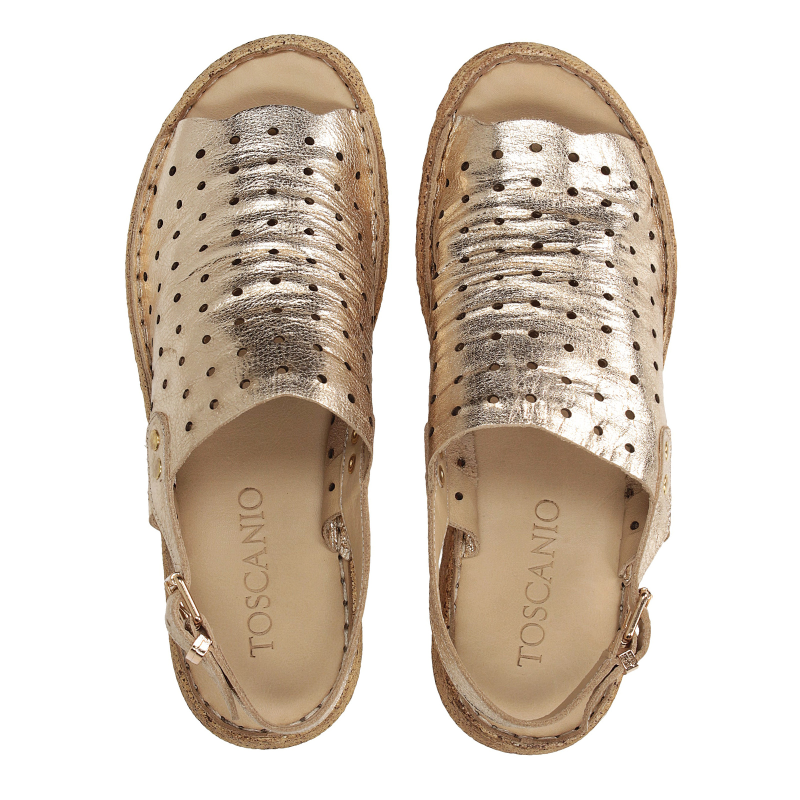 Złote klapki damskie Toscanio to połączenie letniego luzu z eleganckim akcentem. Model wykonany został z wysokiej jakości skóry naturalnej, która zachwyca złotym wykończeniem i ozdobnymi, laserowo wycinanymi dziurkami na cholewce. Klapki osadzone są na lekkiej, korkowej platformie o wysokości 3 cm, która dodaje nieco wysokości, a jednocześnie pozostaje bardzo wygodna w codziennym noszeniu. Naturalne materiały i otwarty fason sprawiają, że są idealne na ciepłe dni – świetnie sprawdzą się zarówno do sukienki, jak i do luźnych spodni czy szortów.