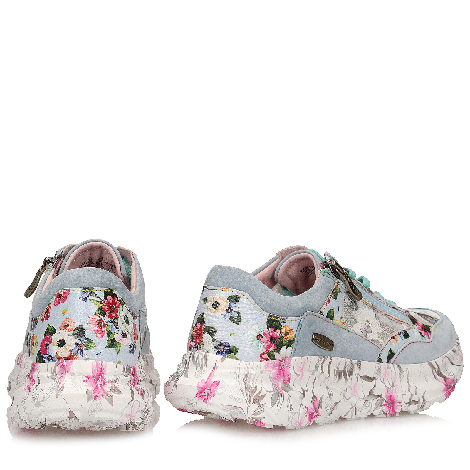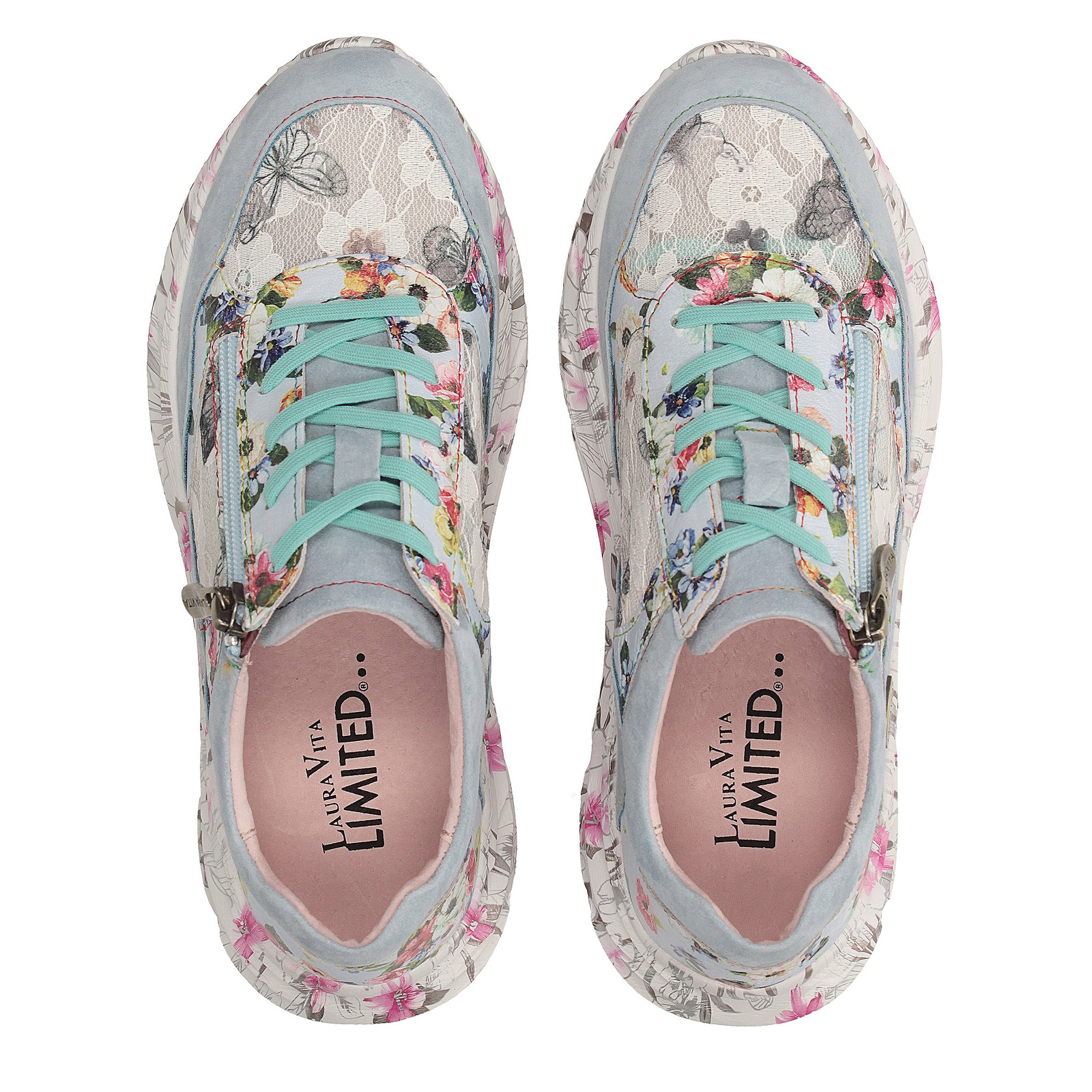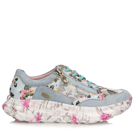 Sneakersy wyróżniają się bogatymi, kwiatowymi zdobieniami w różnorodnych wzorach, które tworzą efektowną, artystyczną kompozycję i są charakterystycznym znakiem stylu marki Laura Vita. Niebieska kolorystyka w połączeniu z florystycznymi motywami sprawia, że model doskonale ożywia codzienne stylizacje, dodając im świeżości, koloru i niepowtarzalnego charakteru.
