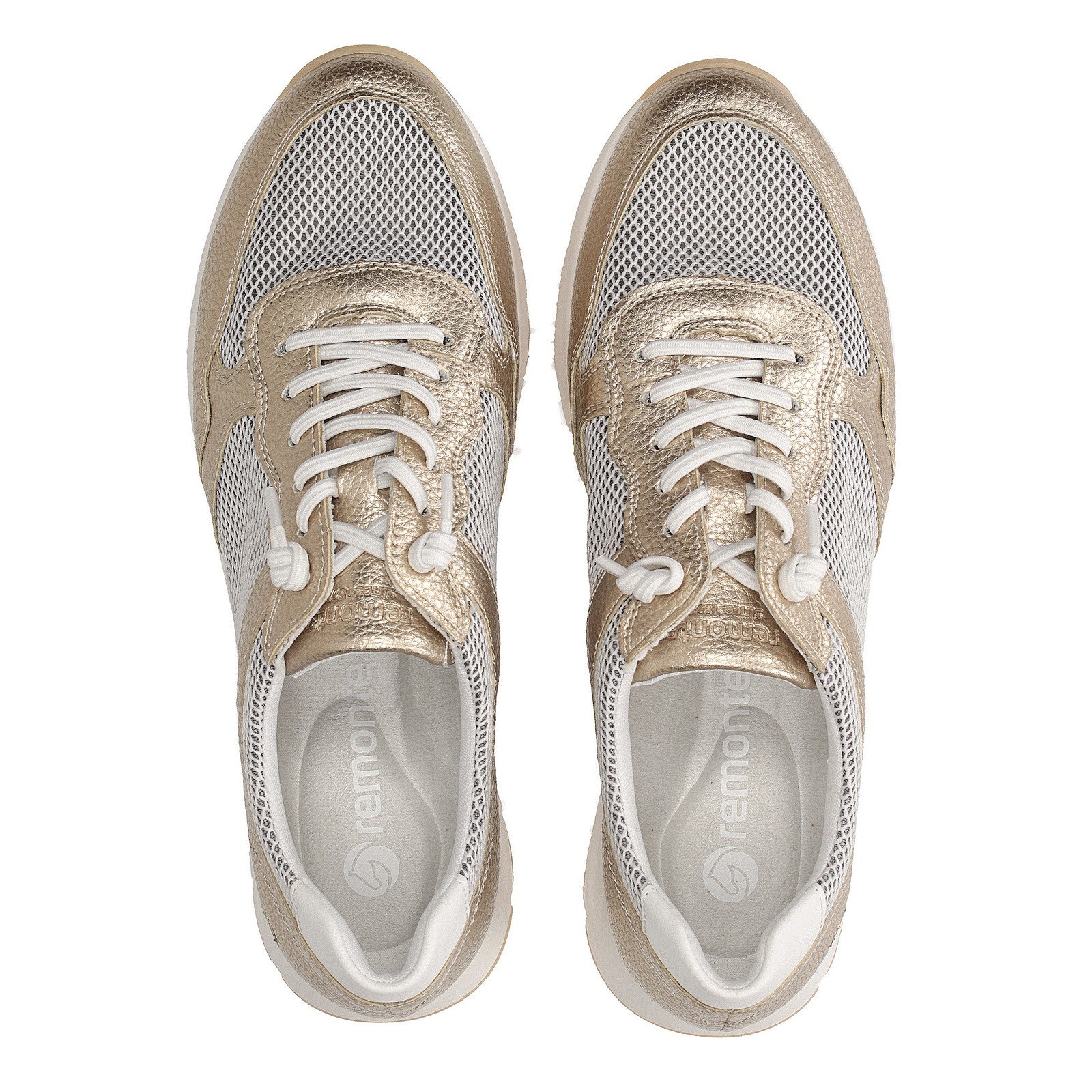 Sneakersy marki Remonte to doskonałe połączenie komfortu i elegancji. Cholewka wykonana została z połączenia skóry naturalnej i tkaniny w efektownym zestawieniu bieli ze złotymi akcentami. Model opiera się na wygodnej 3-centymetrowej platformie, która subtelnie dodaje wzrostu i podkreśla sylwetkę. Dzięki skórzanej wyściółce buty zapewniają odpowiednią cyrkulację i komfort noszenia przez cały dzień. Okrągły nosek i klasyczne sznurowanie nadają im ponadczasowy charakter, a detale w kolorze złota dodają kobiecego blasku.