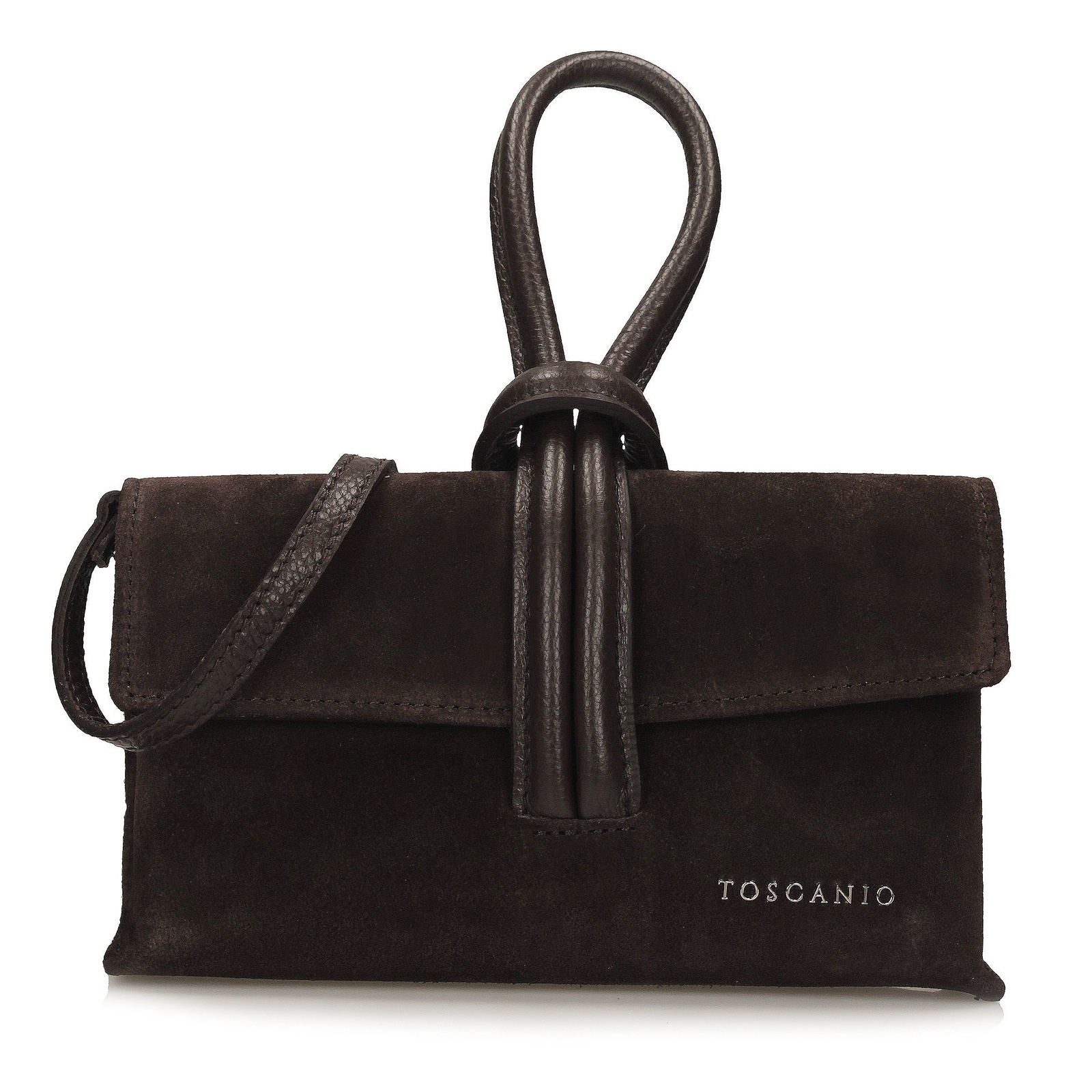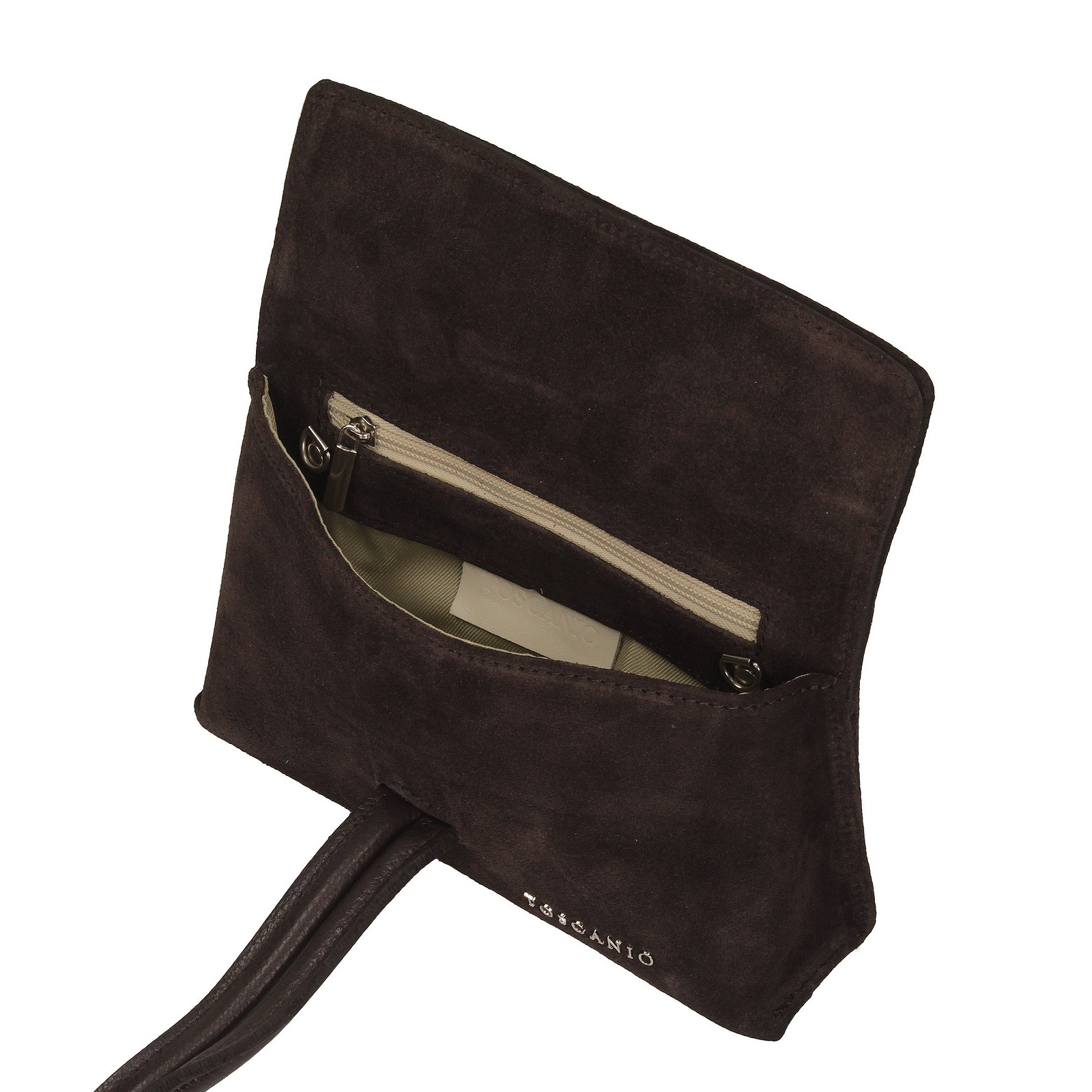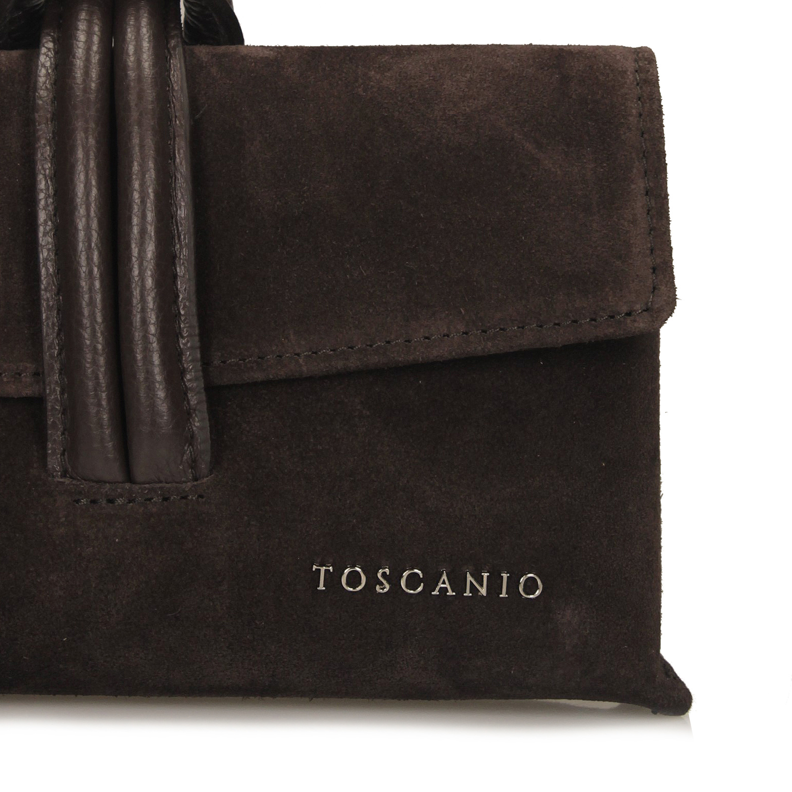 Ciemnobrązowa kopertówka Toscanio to doskonały wybór dla kobiet ceniących połączenie ponadczasowej elegancji i praktyczności. Wykonana w całości z miękkiego, wysokiej jakości zamszu, zachwyca przyjemną w dotyku fakturą i subtelnym, szlachetnym wykończeniem. Krótki uchwyt oraz długi pasek o długości 125 cm wykonano ze skóry licowej, co dodaje modelowi trwałości i kontrastowego akcentu elegancji.