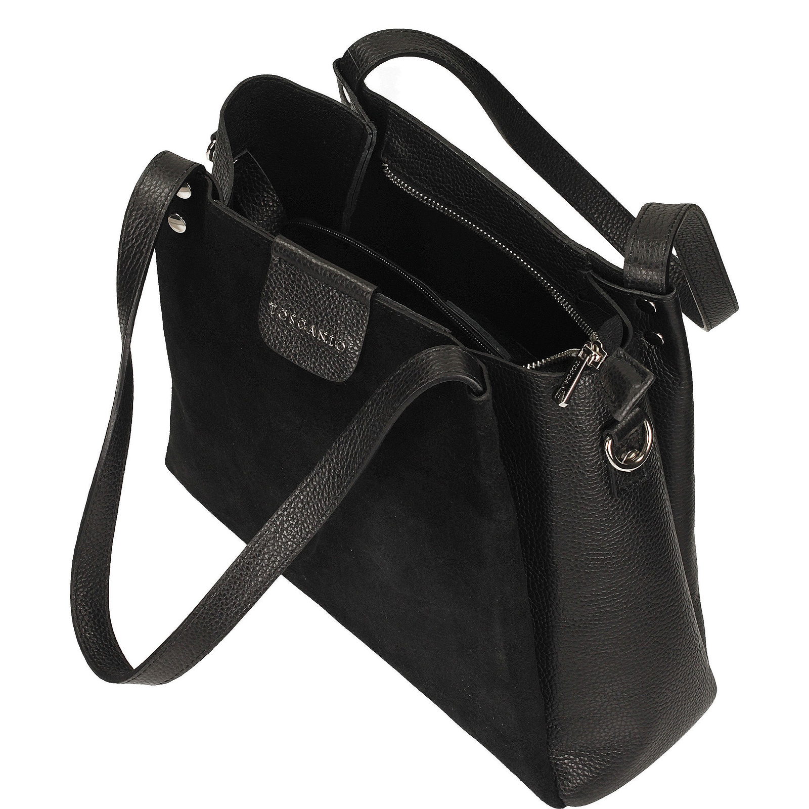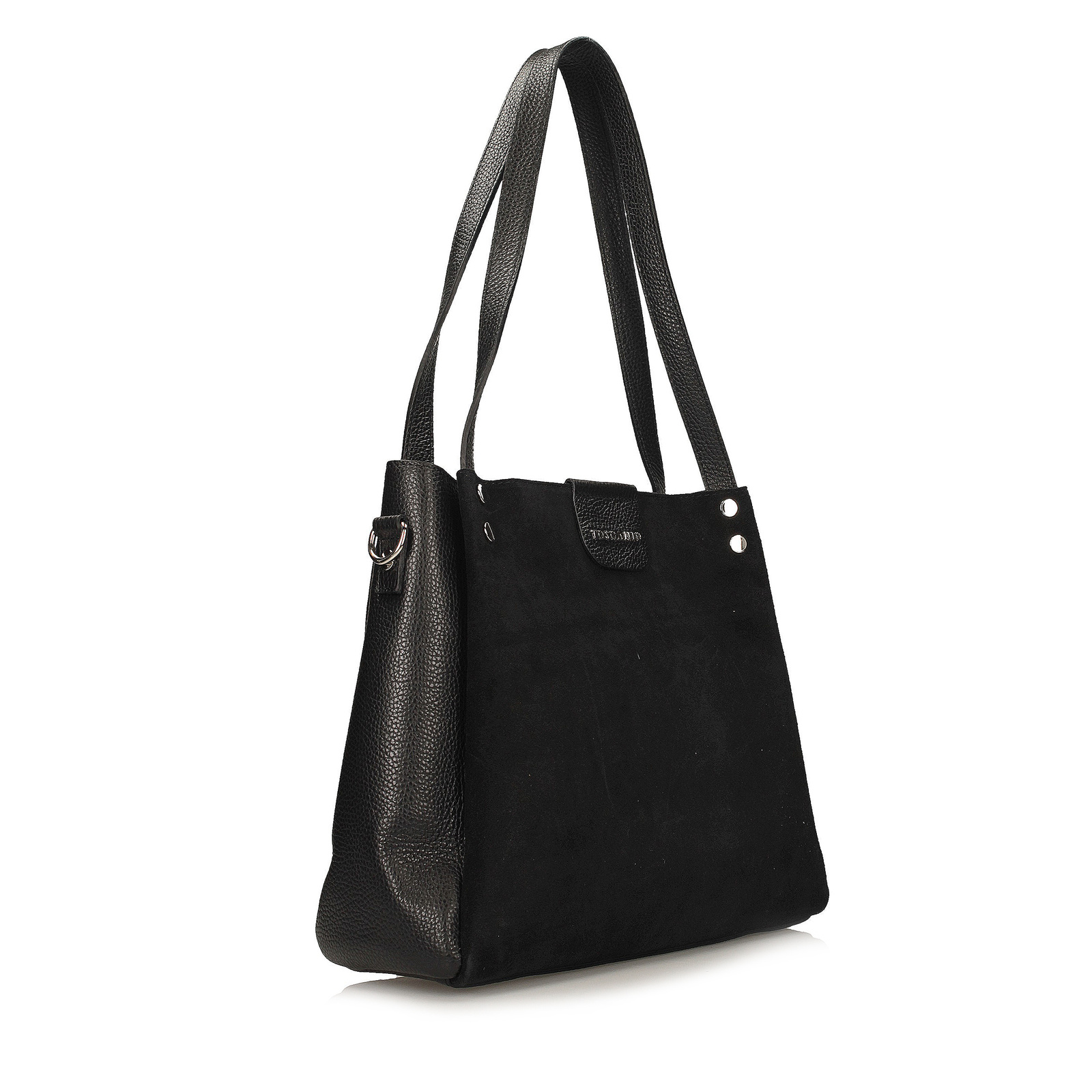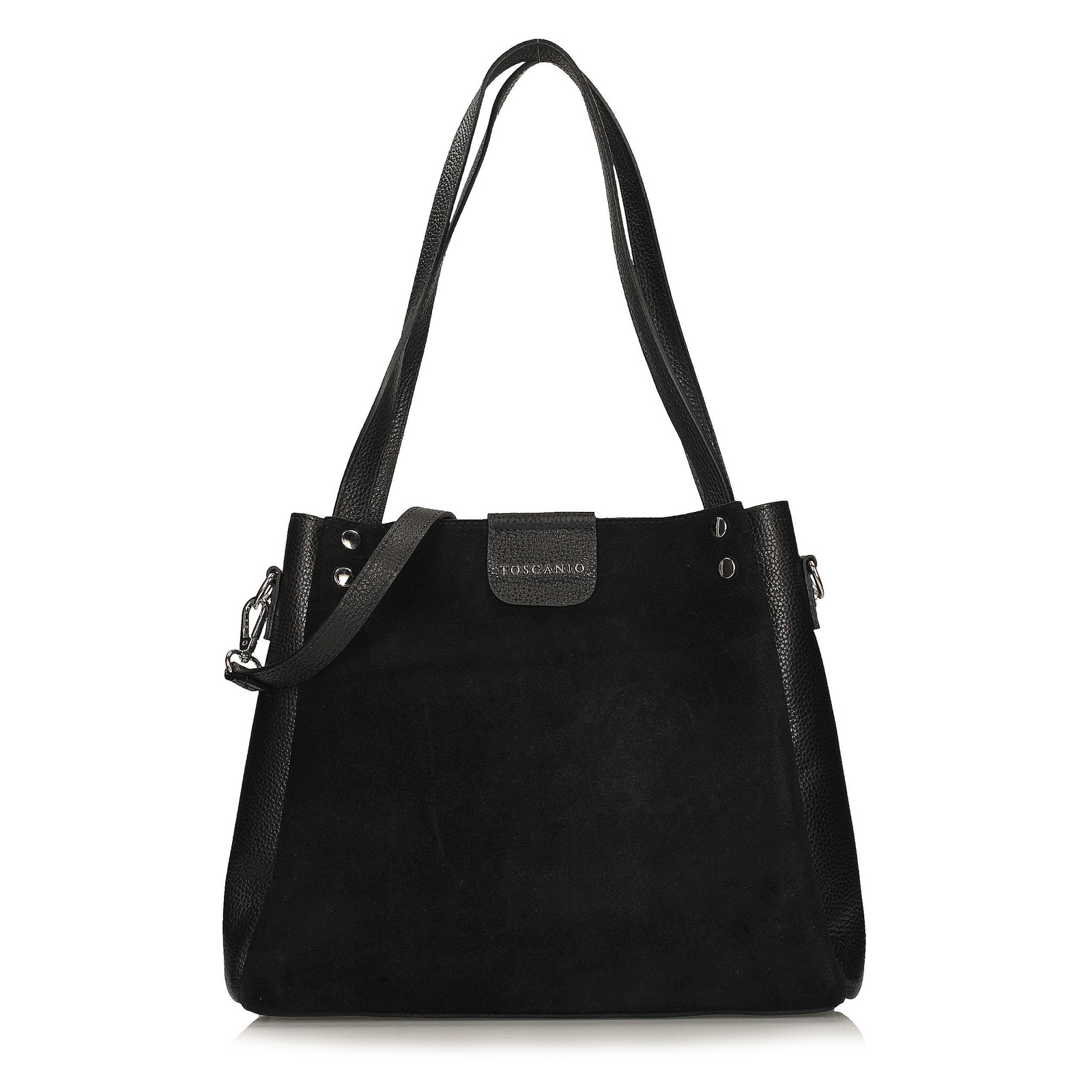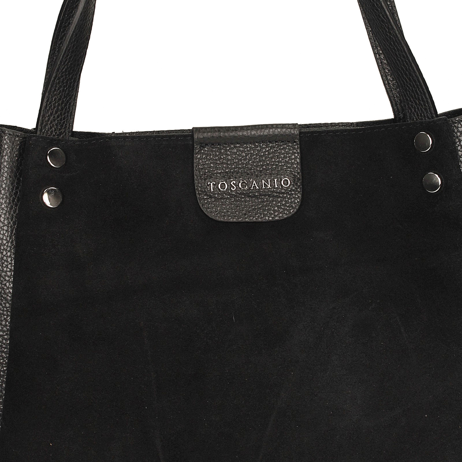 Elegancka torebka damska Toscanio w kolorze czarnym to połączenie klasyki i nowoczesnego designu w doskonałym wydaniu. Model wyróżnia się połączeniem dwóch rodzajów skóry — licowej i zamszowej — co nadaje jej wyjątkowego charakteru i głębi. Sztywniejsza konstrukcja sprawia, że torebka zachowuje kształt, prezentując się zawsze elegancko i schludnie.