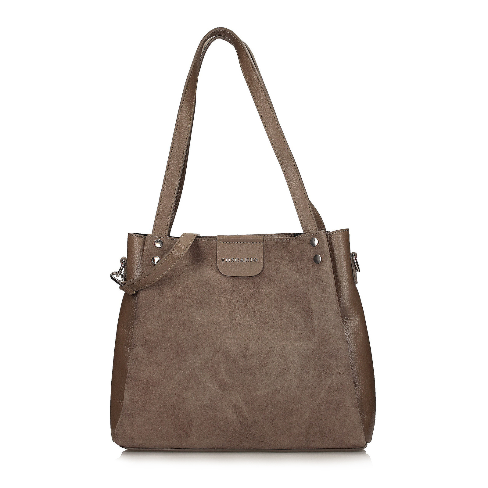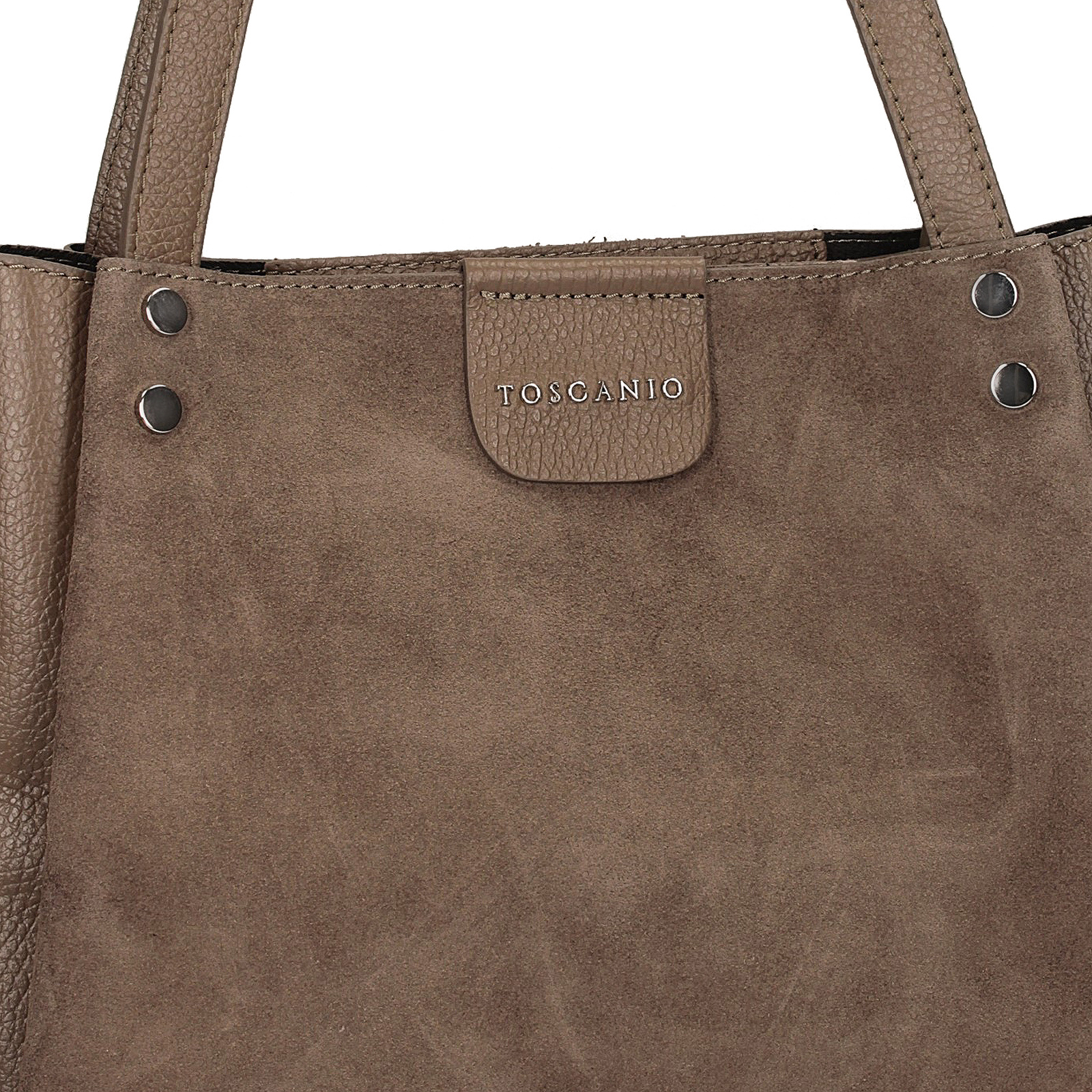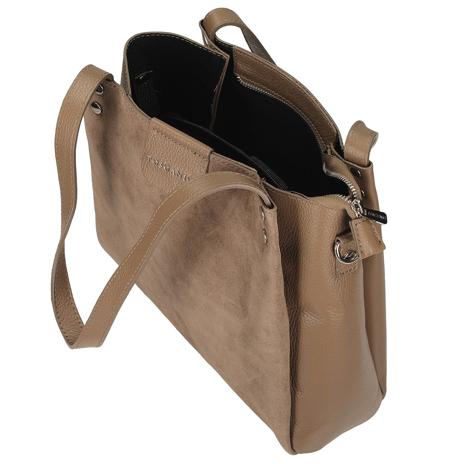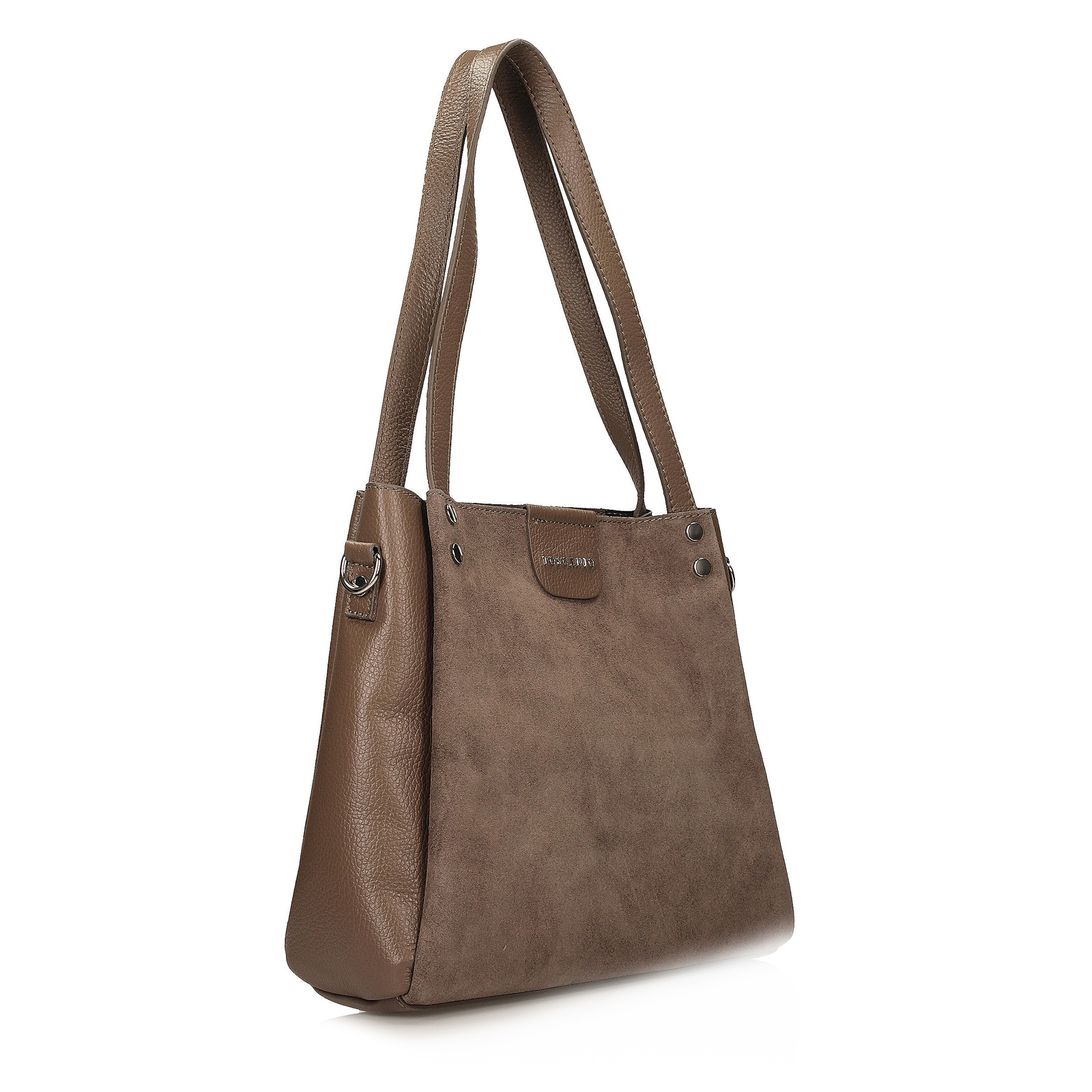Elegancka torebka damska Toscanio w kolorze ciemnego beżu to połączenie klasyki i nowoczesnego designu w doskonałym wydaniu. Model wyróżnia się połączeniem dwóch rodzajów skóry — licowej i zamszowej — co nadaje jej wyjątkowego charakteru i głębi. Sztywniejsza konstrukcja sprawia, że torebka zachowuje kształt, prezentując się zawsze elegancko i schludnie.