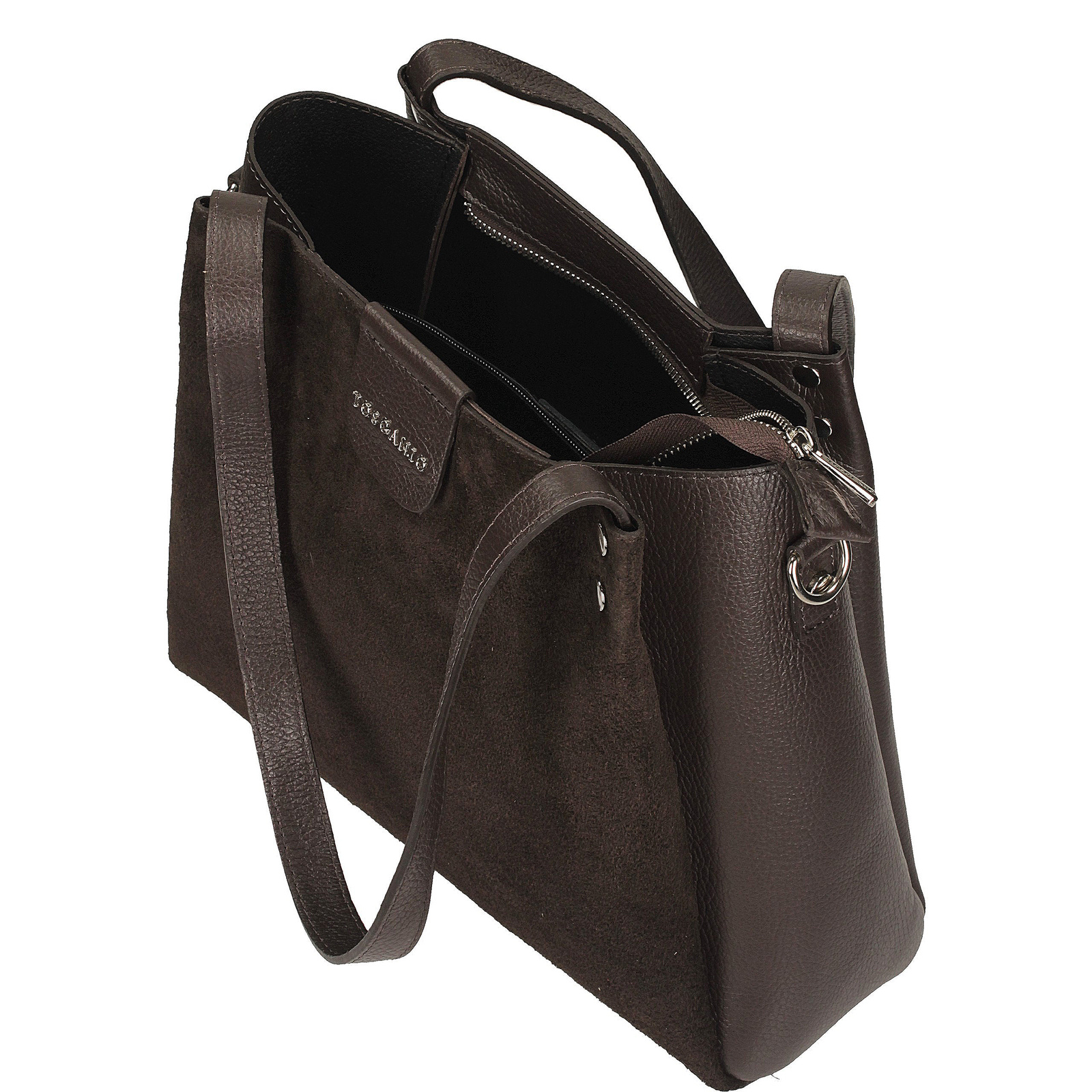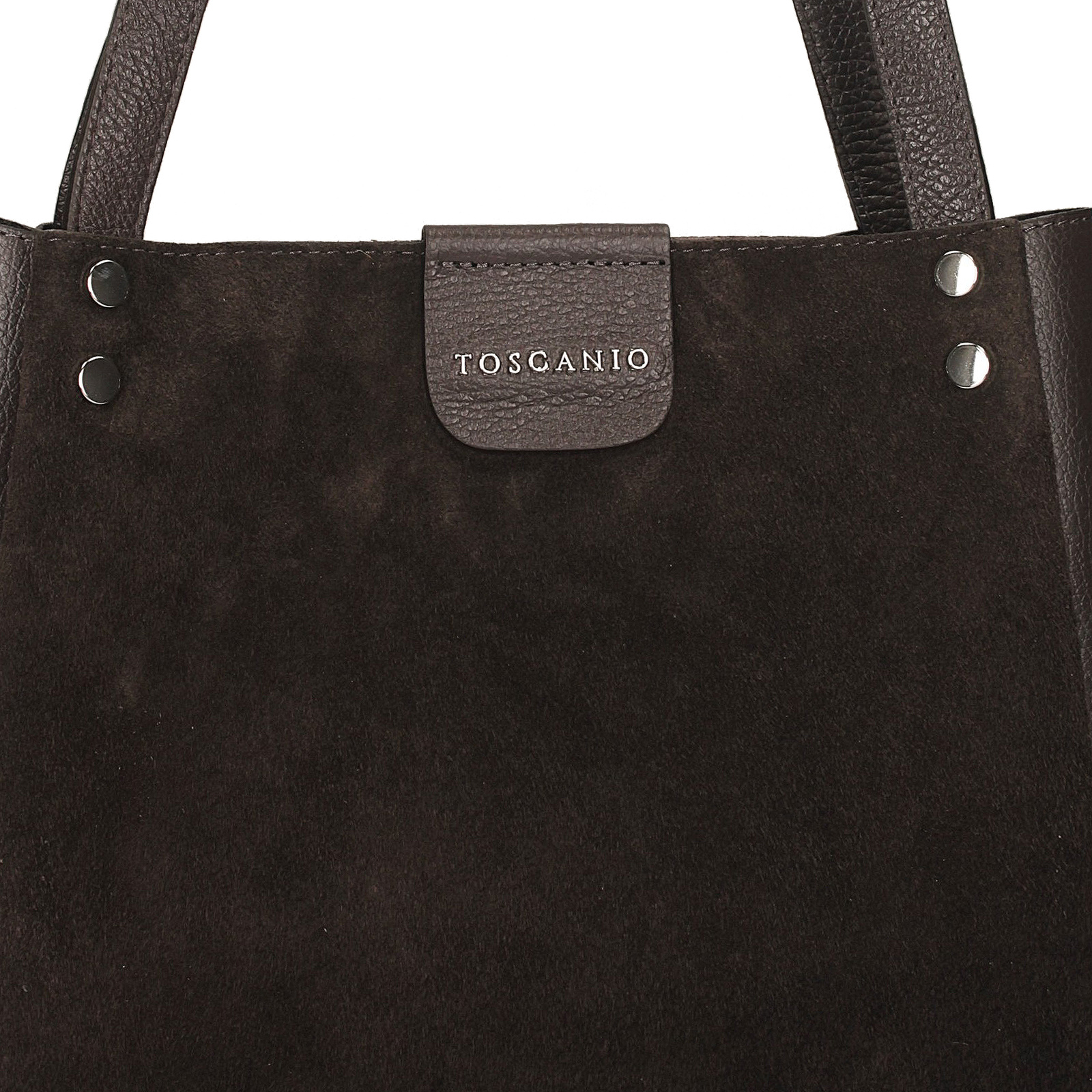 Elegancka torebka damska Toscanio w kolorze ciemnego brązu to wyjątkowe połączenie klasyki i nowoczesnego designu. Wykonana z naturalnej skóry, łączy dwa rodzaje wykończenia — zamszowe i licowe — co nadaje jej wyrafinowanego, a zarazem niepowtarzalnego charakteru. Sztywniejsza forma sprawia, że torebka zachowuje elegancki kształt i doskonale się prezentuje.