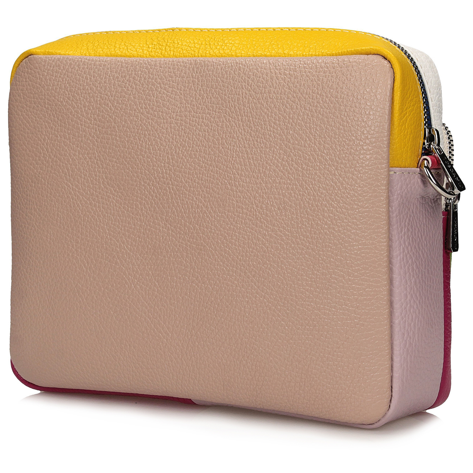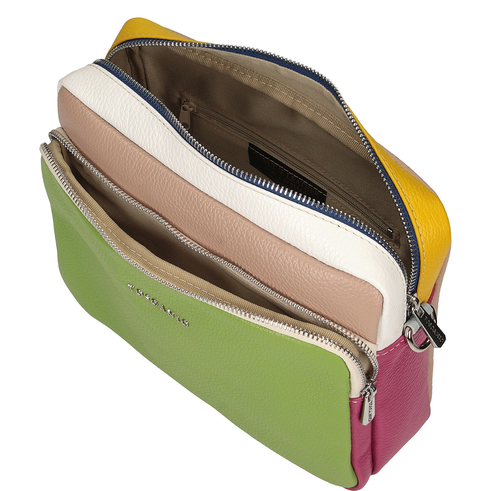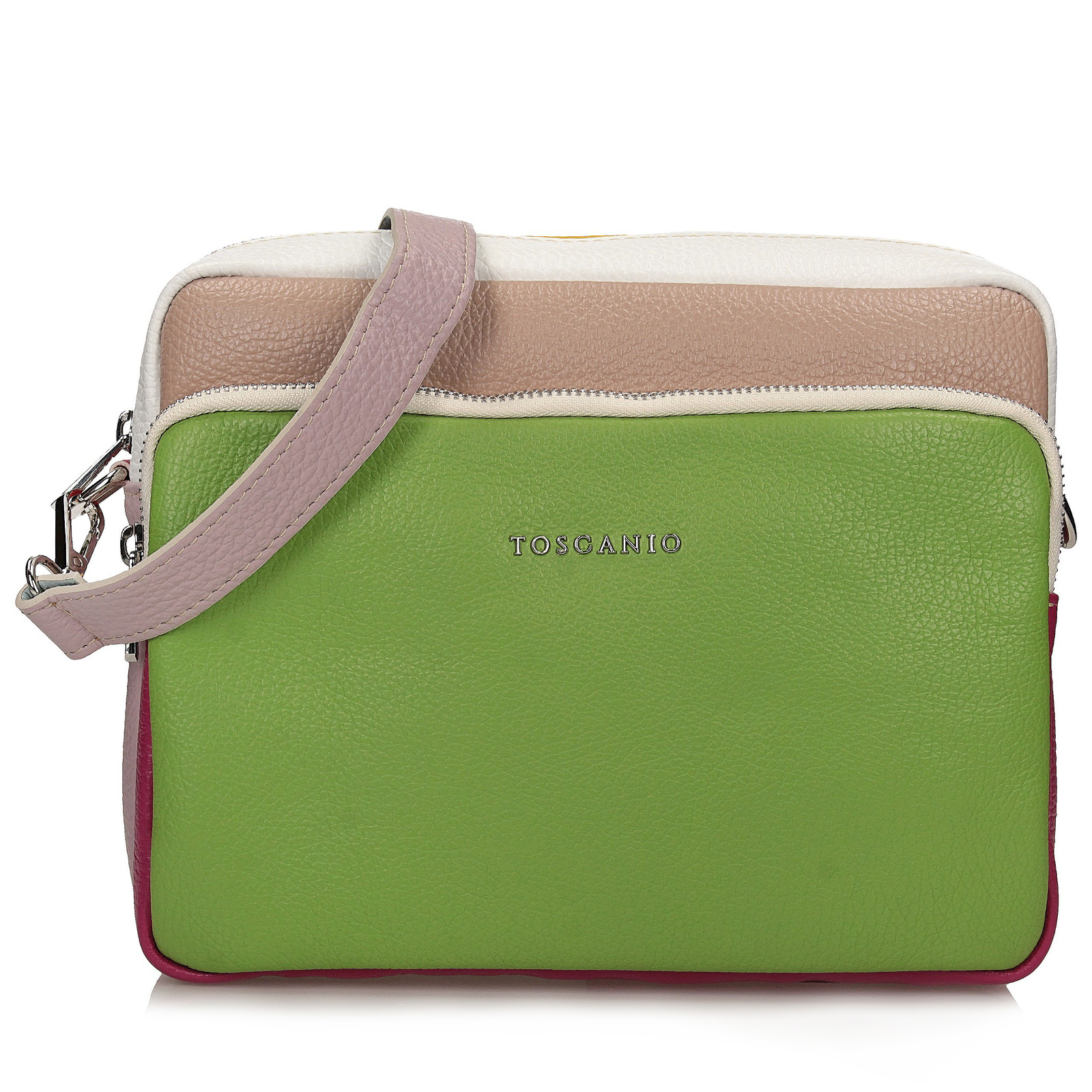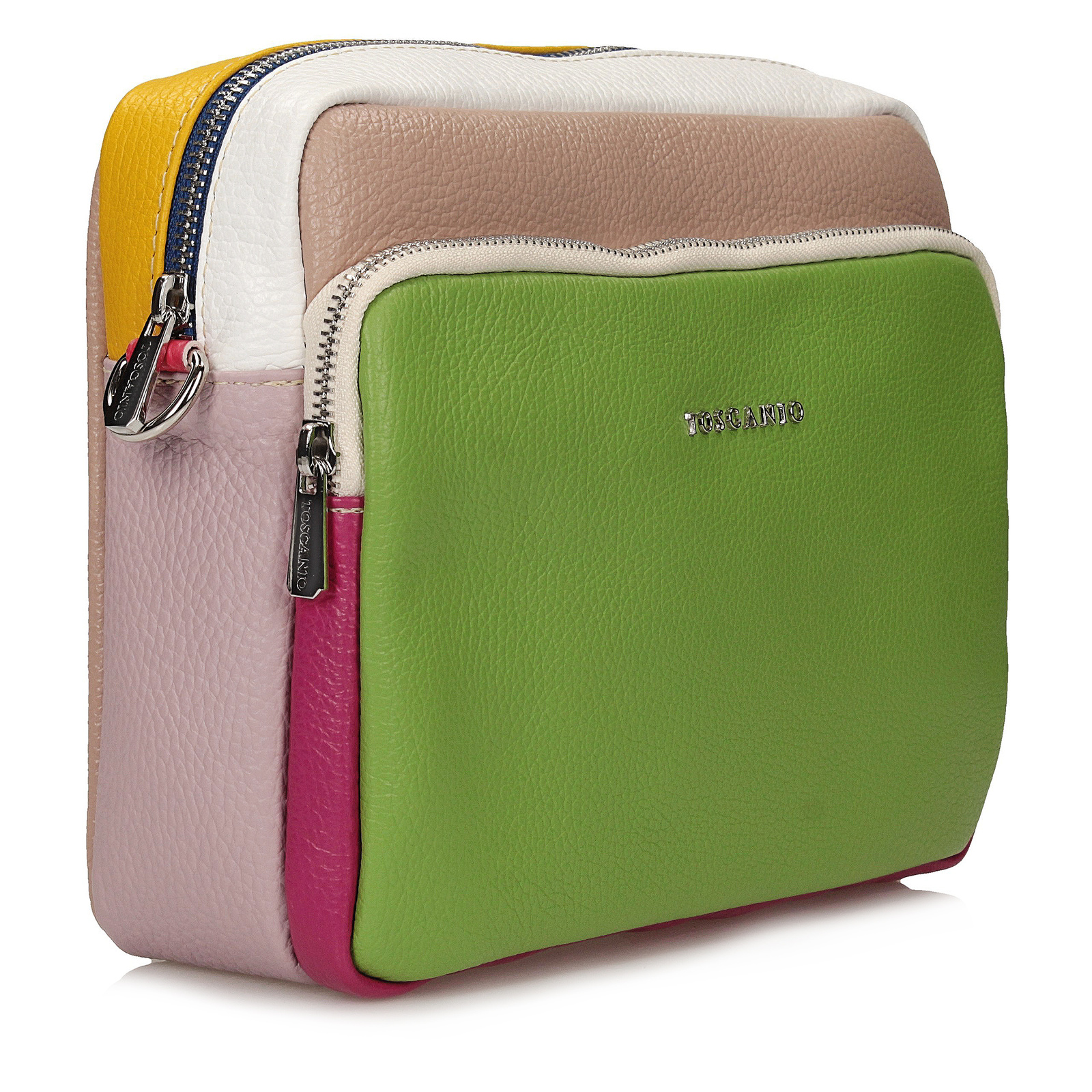 Torebka marki Toscanio wykonana z wysokiej jakości skóry licowej typu groszek to niebanalny model łączący kolorowe elementy – z dominującą częścią w zieleni. Jej kompaktowe wymiary (24 × 23 × 7 cm) sprawiają, że jest poręczna i wygodna w codziennym użytkowaniu, a jednocześnie stylowa i unikalna. Torebka posiada jedną komorę zamykaną na zamek, trzy kieszenie wewnętrzne oraz dwie zewnętrzne, zapewniając dobrą organizację drobiazgów. Wnętrze wyściełane tkaniną, a pasek wykonany ze skóry naturalnej pozwala nosić ją wygodnie na ramieniu. Srebrne detale wykończenia dodają całości elegancji. Model nie mieści formatu A4.