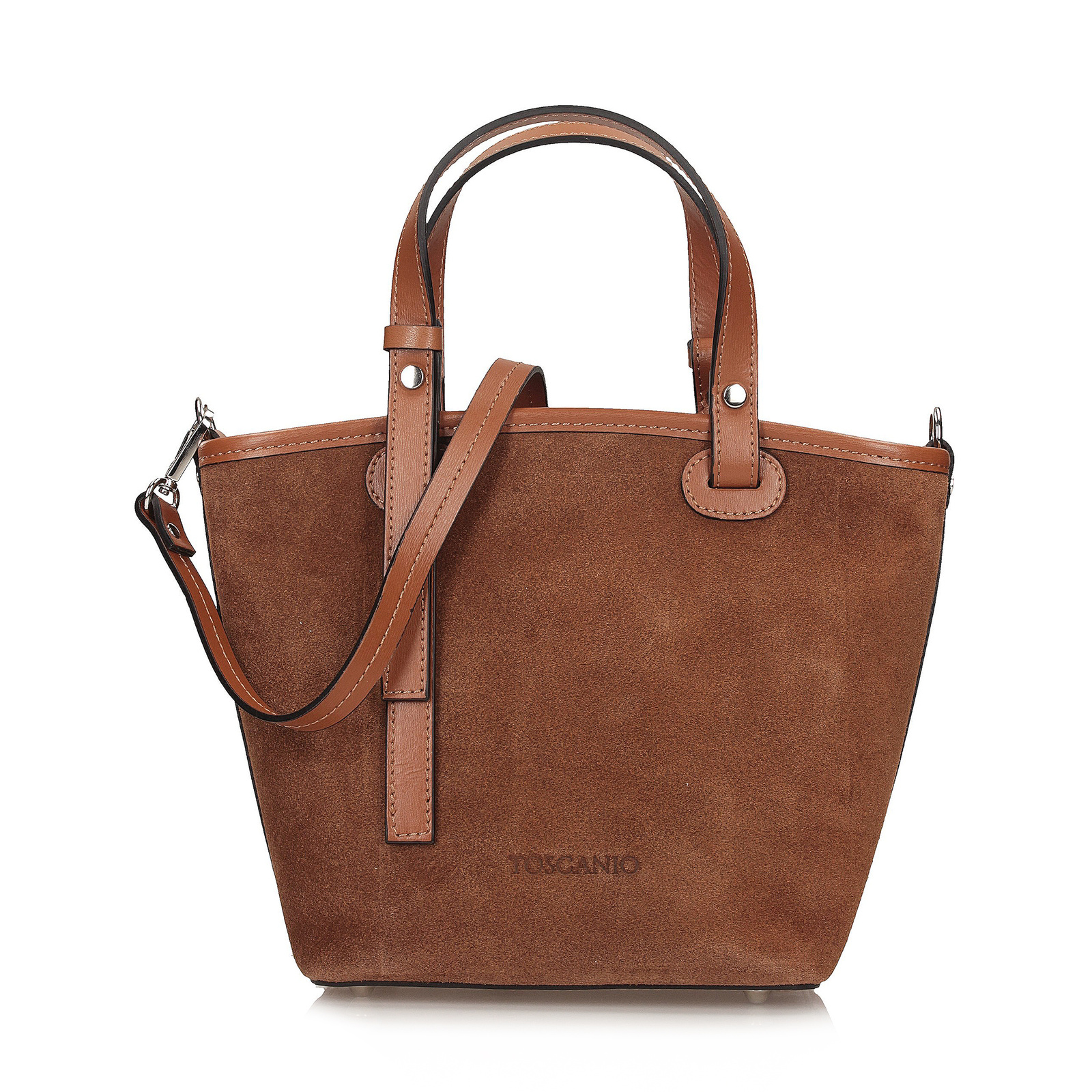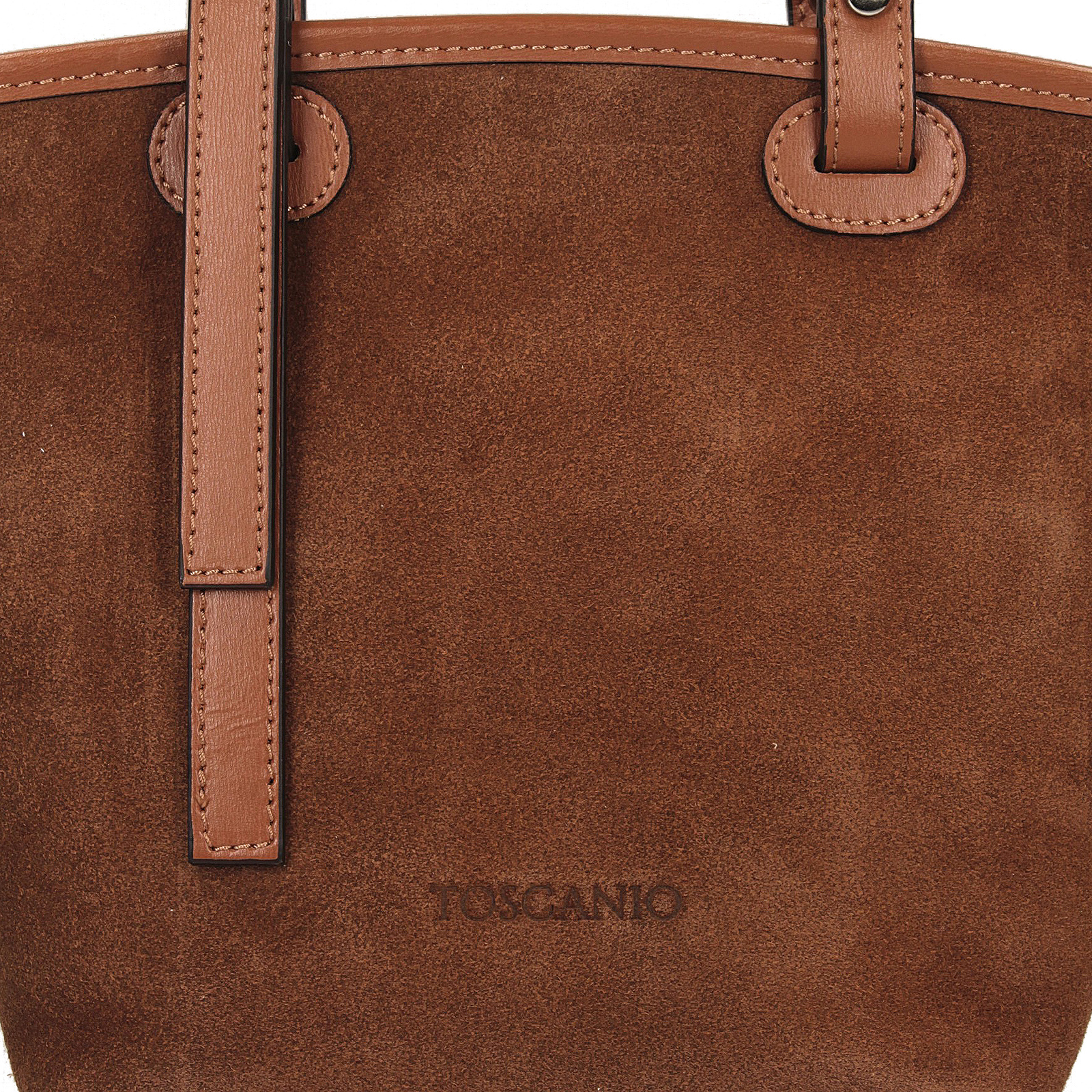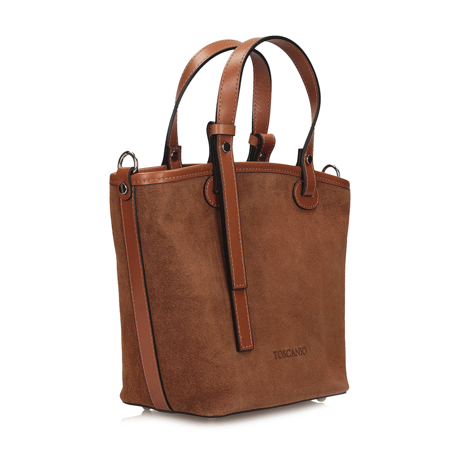 Ruda torebka Toscanio to model o ciepłym, wyrazistym charakterze, wykonany z miękkiej skóry zamszowej w połączeniu z elementami ze skóry naturalnej groszkowanej. Rączka, pasek i obwoluta zostały wykonane z gładkiej skóry, co nadaje całości eleganckiego wykończenia i zapewnia trwałość. Torebka zapinana jest na zamek w srebrnym kolorze, a jej wnętrze wyściełane tkaniną skrywa jedną komorę oraz dwie praktyczne kieszenie, które pomagają utrzymać porządek. Regulowany pasek ze skóry naturalnej umożliwia noszenie zarówno na ramieniu, jak i w formie crossbody. Intensywny rudy odcień pięknie podkreśli jesienne i zimowe stylizacje, ale też doda charakteru prostym, codziennym zestawom.