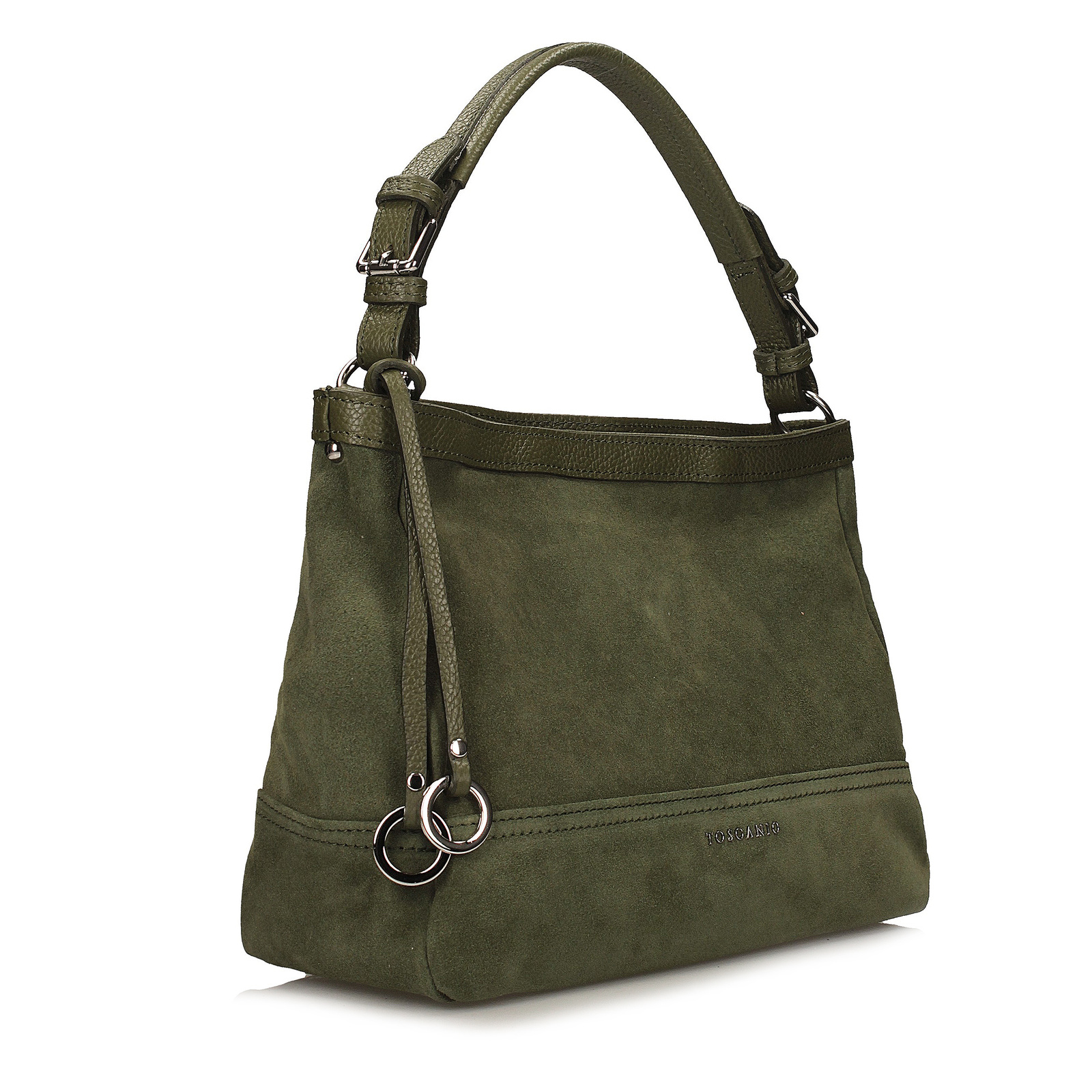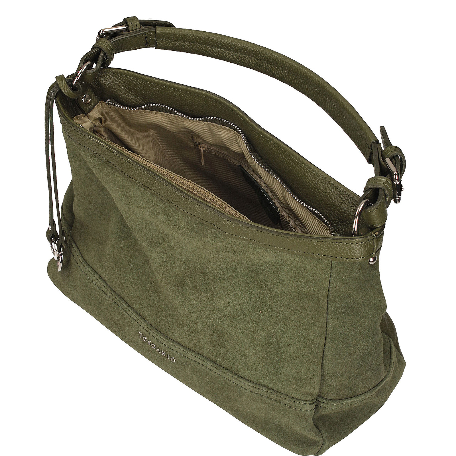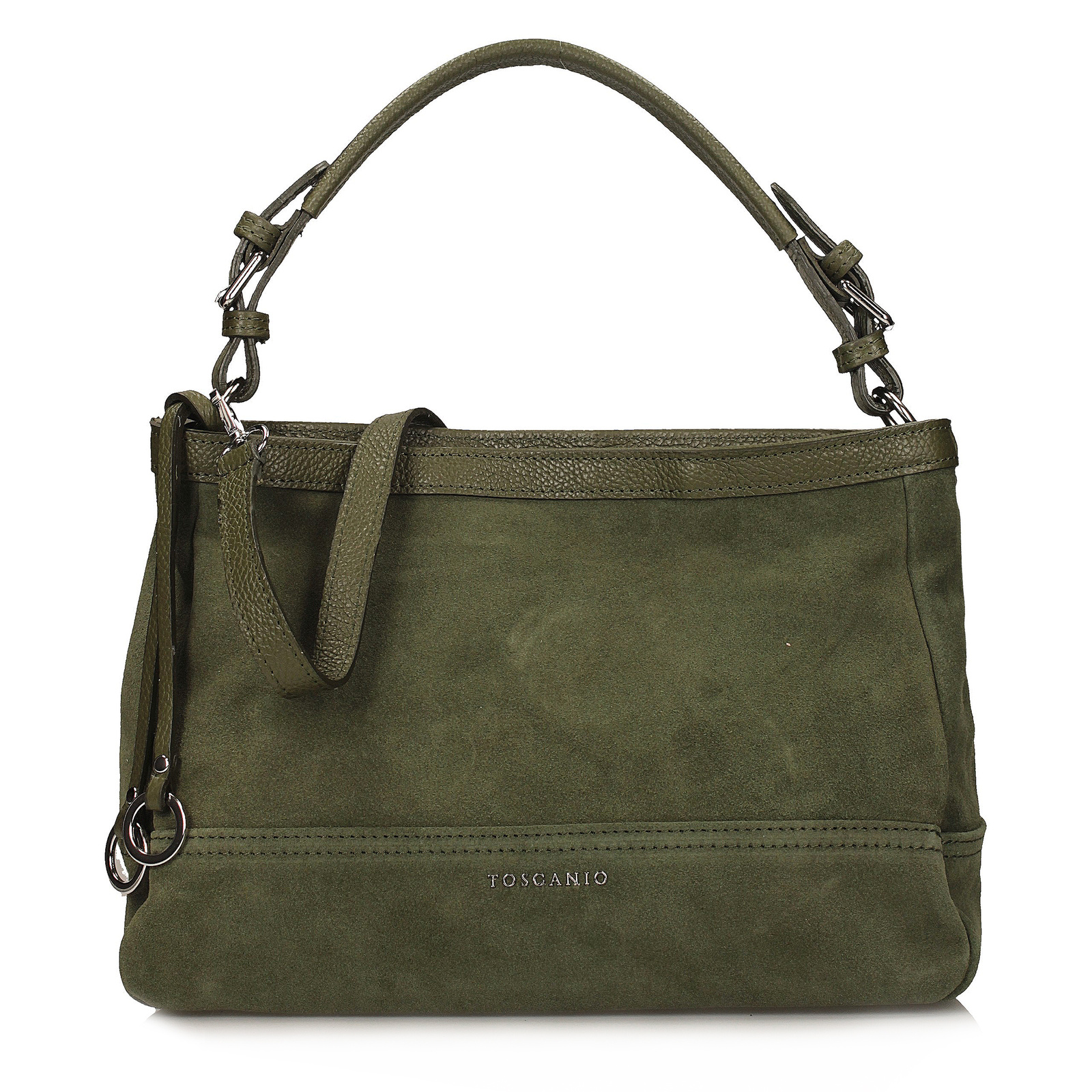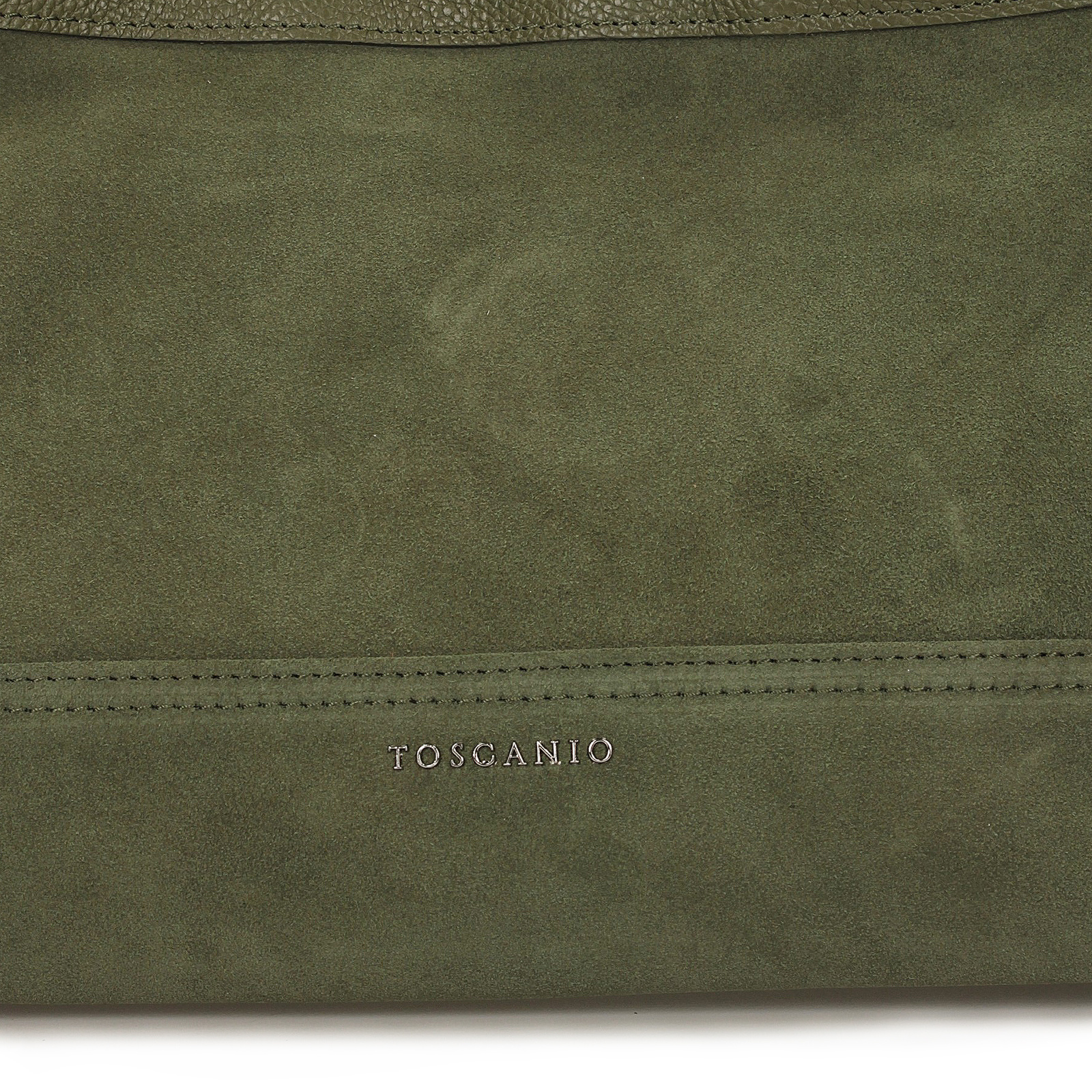Oliwkowo-zielona torebka damska marki Toscanio to wyjątkowy model typu worek, który łączy klasyczną elegancję z praktycznym charakterem. Wykonana z wysokiej jakości skóry naturalnej zamszowej, wyróżnia się miękką fakturą i subtelnym wykończeniem, idealnym na co dzień i do bardziej wyszukanych stylizacji.