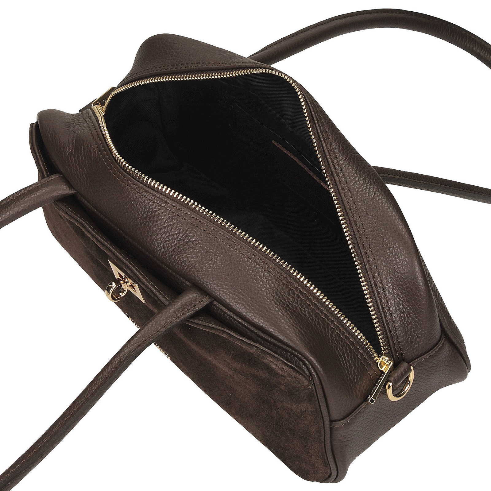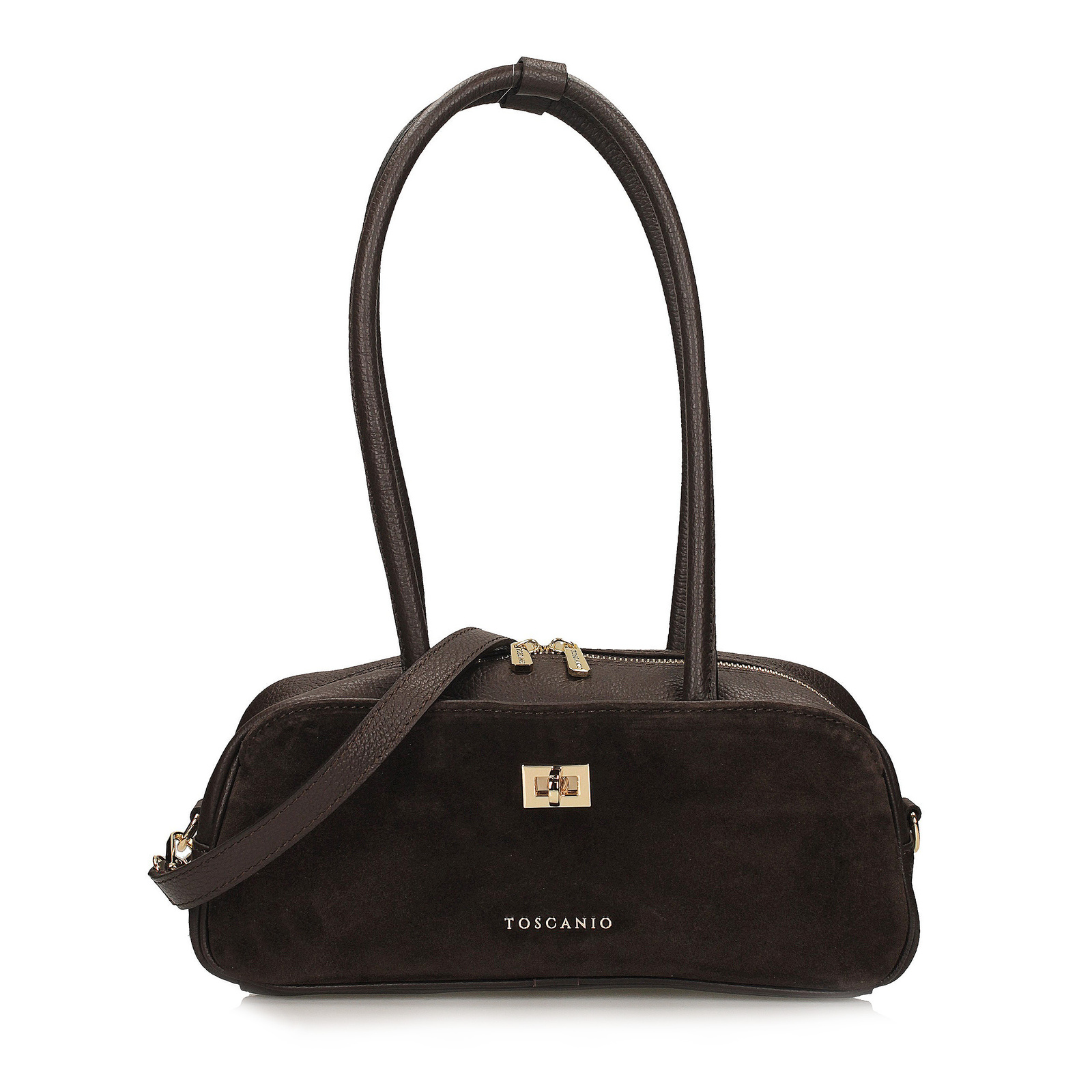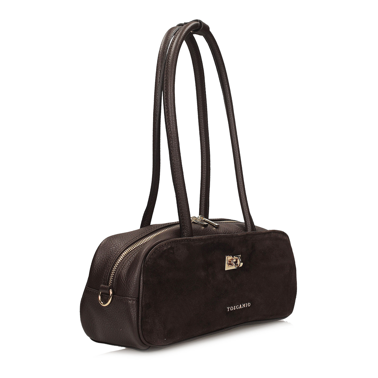 Torebka Toscanio w kolorze ciemnego brązu to elegancka propozycja dla kobiet, które cenią klasykę w nowoczesnym wydaniu. Wykonana z połączenia skóry naturalnej licowej i zamszu, zachwyca subtelnym kontrastem faktur oraz dopracowanym wykończeniem.