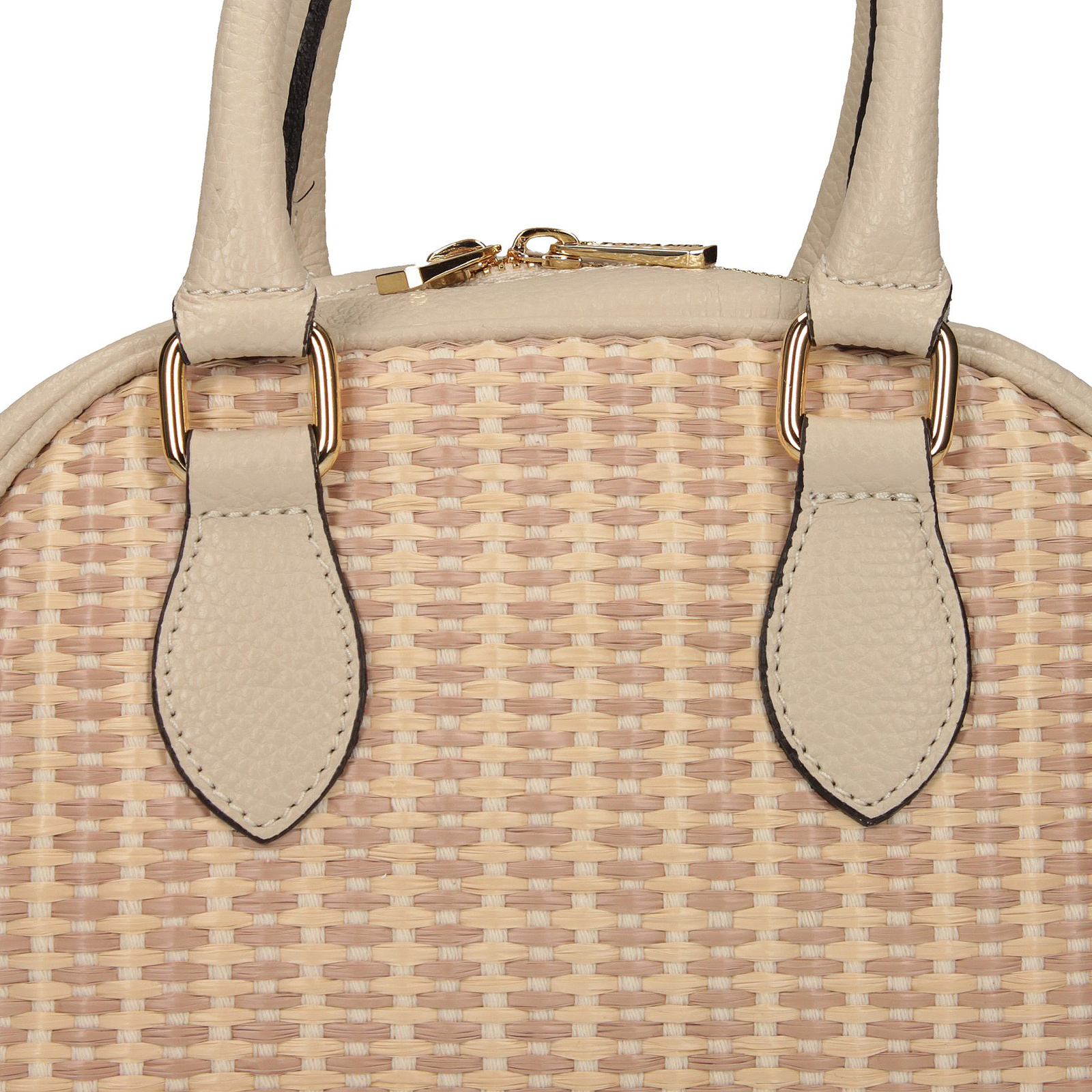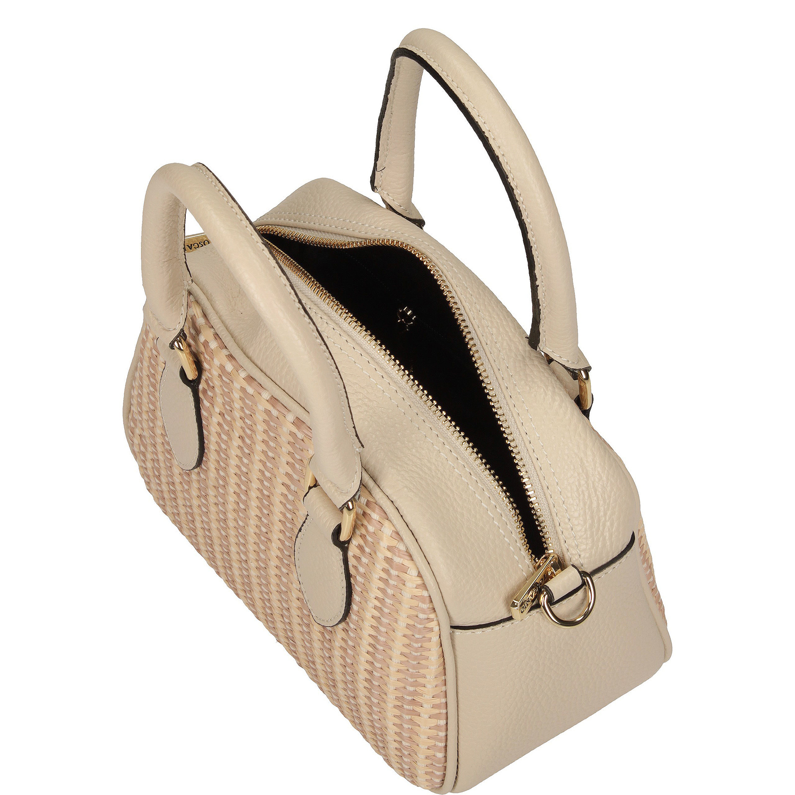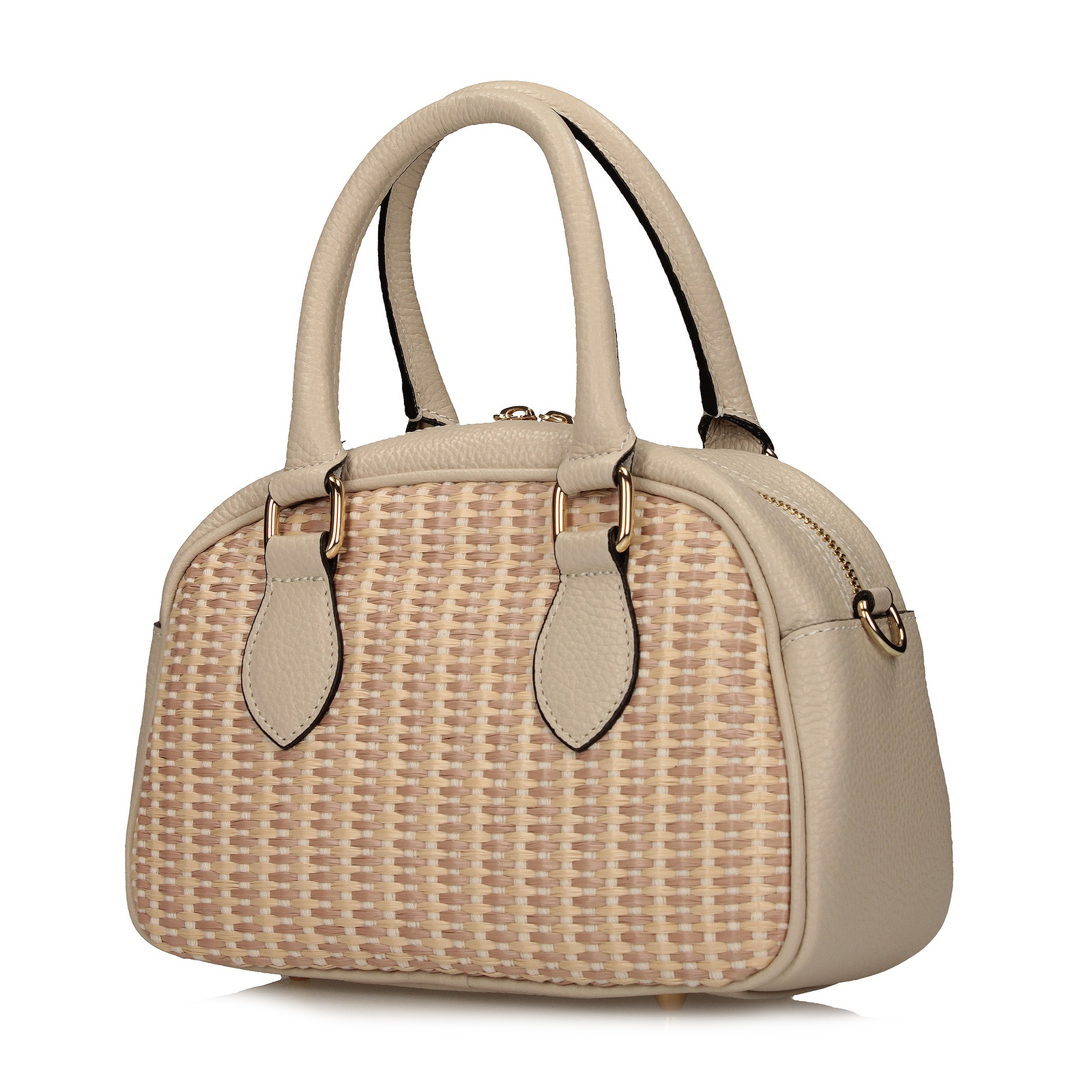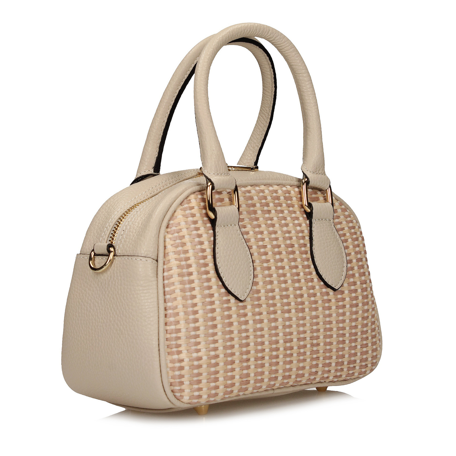 Kremowa listonoszka Toscanio to model, który idealnie łączy naturalny styl z elegancją. Torebka wyróżnia się ozdobnym splotem z rafii, który nadaje jej lekkości i letniego charakteru, a jednocześnie świetnie komponuje się z elementami wykonanymi ze skóry naturalnej. Kompaktowy, ale pojemny format zmieści najpotrzebniejsze drobiazgi, a dzięki regulowanemu paskowi można ją wygodnie nosić na ramieniu lub na skos. Złote detale i subtelna forma czynią ją doskonałym dodatkiem zarówno do miejskich stylizacji, jak i wakacyjnych sukienek.