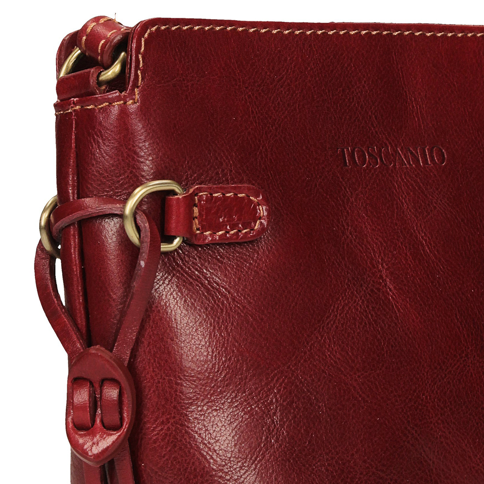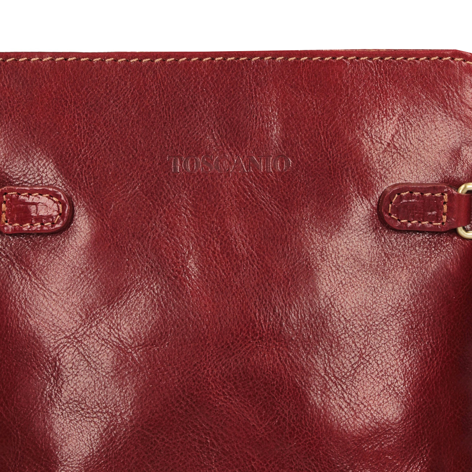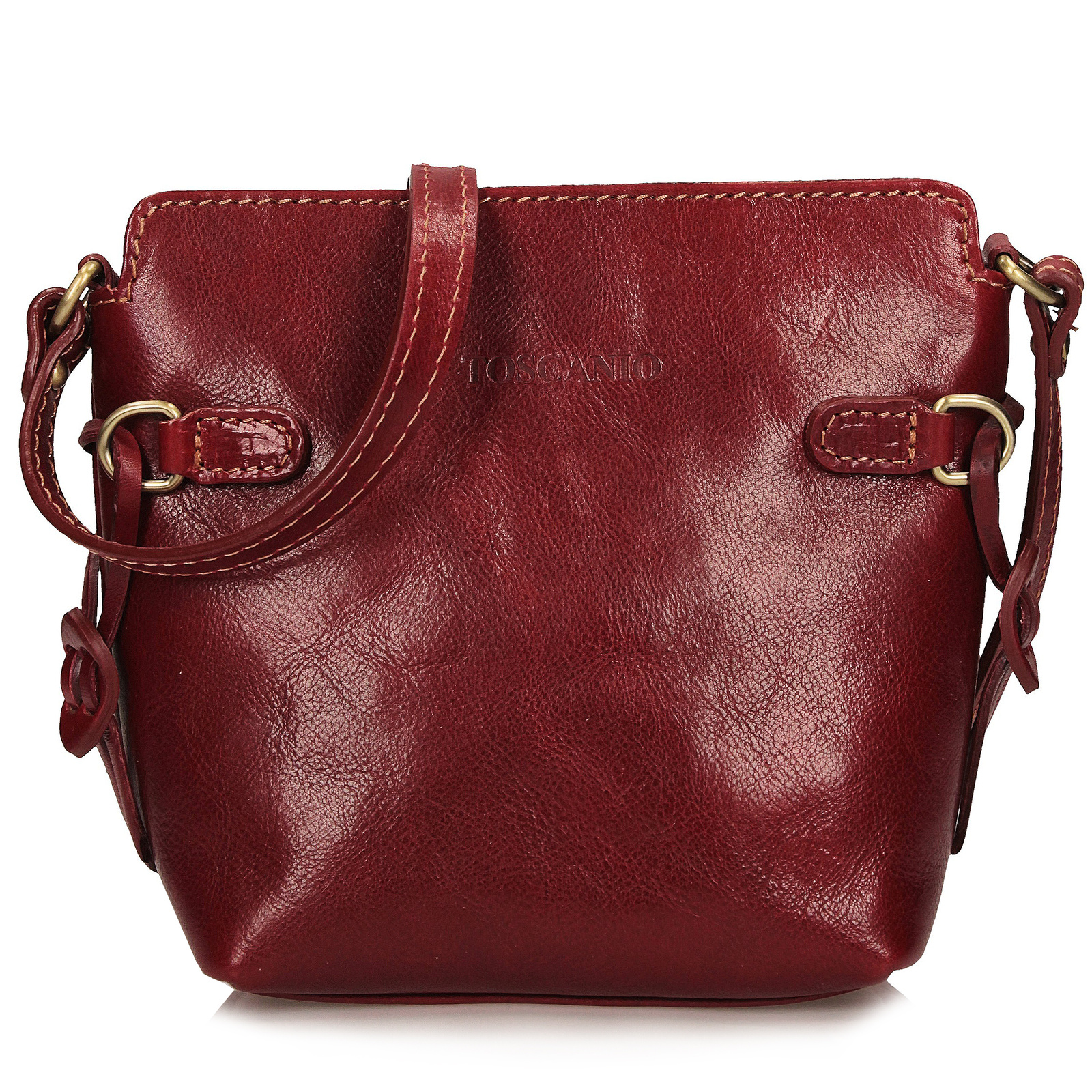 Torebka damska Toscanio w odważnym, czerwonym kolorze została wykonana z wysokiej jakości skóry naturalnej o subtelnym połysku w stylu vintage. Jej kompaktowe wymiary (18 × 17 × 7 cm) czynią ją idealnym dodatkiem na co dzień. Wnętrze z tkaninową podszewką skrywa jedną komorę i kieszeń wewnętrzną. Zamykana na zamek z eleganckim złotym okuciem. Pasek ze skóry naturalnej zapewnia komfort noszenia na ramieniu.