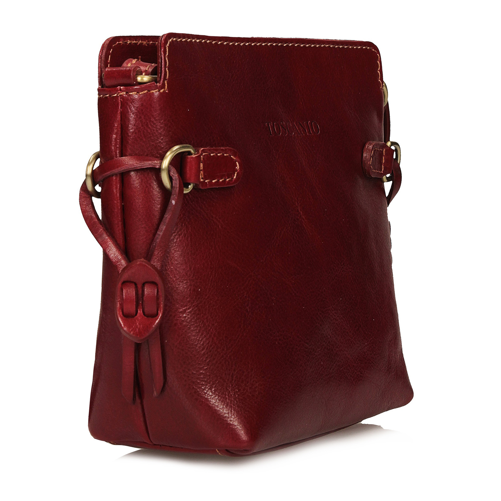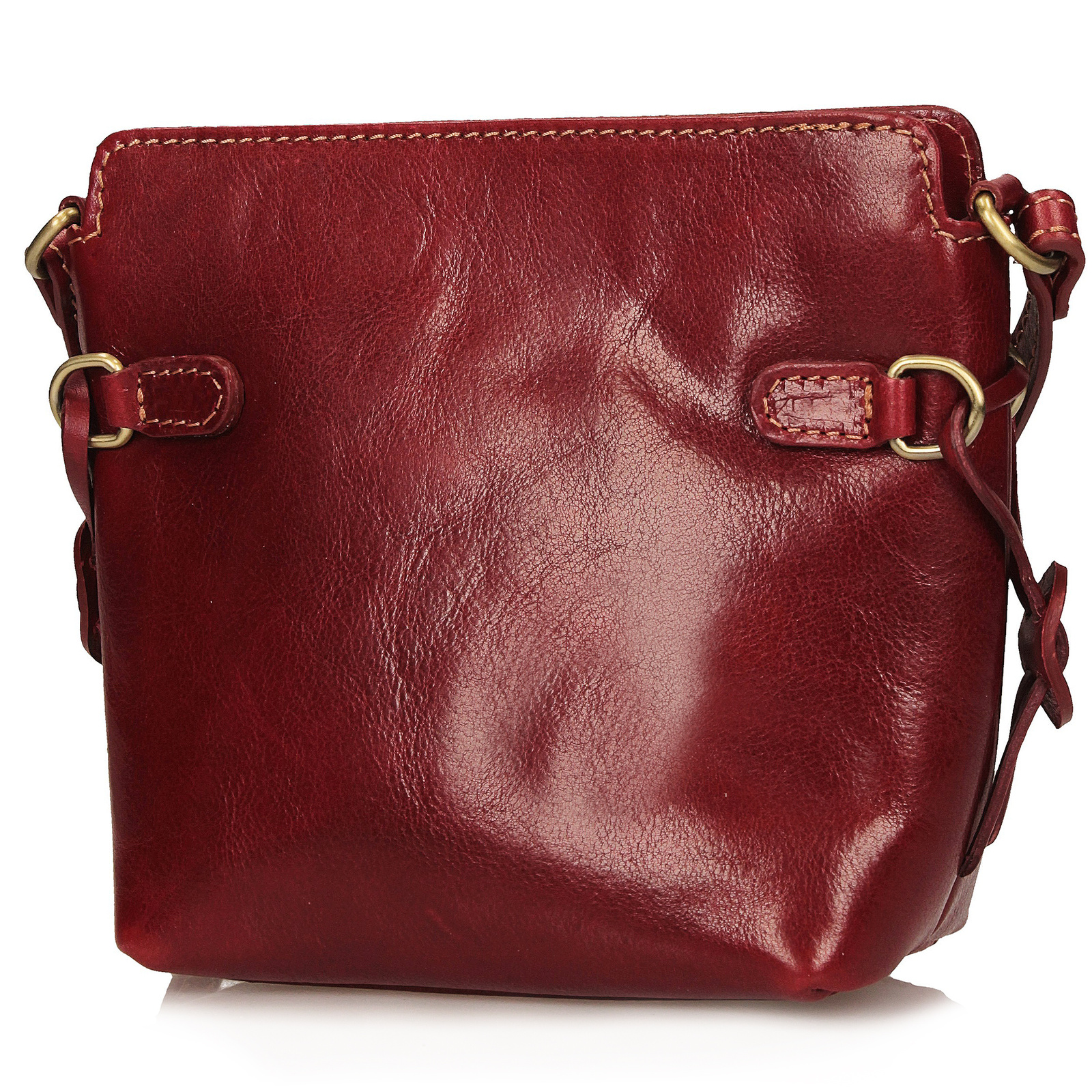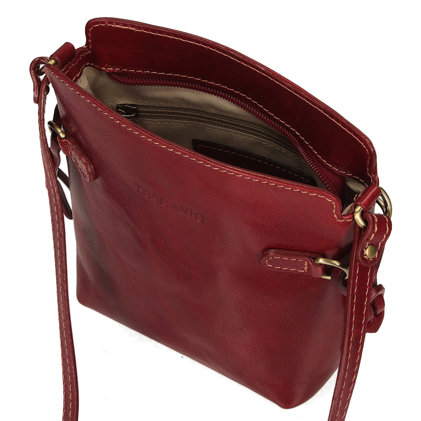 Torebka damska Toscanio w odważnym, czerwonym kolorze została wykonana z wysokiej jakości skóry naturalnej o subtelnym połysku w stylu vintage. Jej kompaktowe wymiary (18 × 17 × 7 cm) czynią ją idealnym dodatkiem na co dzień. Wnętrze z tkaninową podszewką skrywa jedną komorę i kieszeń wewnętrzną. Zamykana na zamek z eleganckim złotym okuciem. Pasek ze skóry naturalnej zapewnia komfort noszenia na ramieniu.