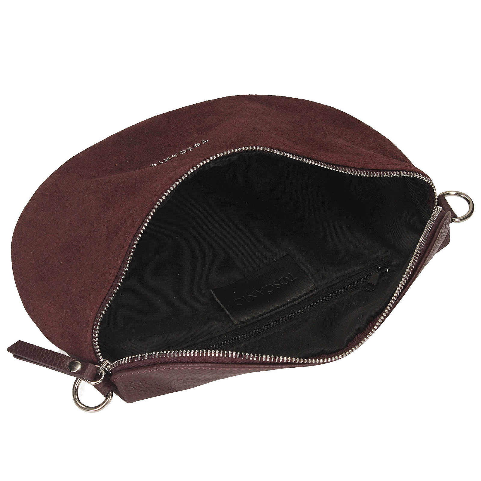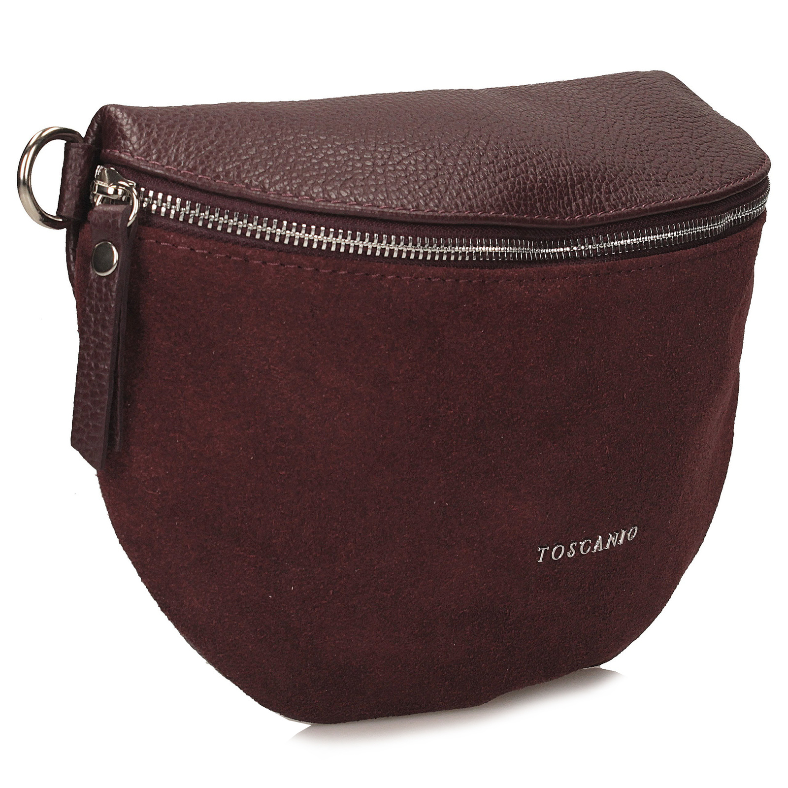 Bordowa nerka Toscanio to stylowy i praktyczny model, wykonany z wysokiej jakości skóry naturalnej. Przód torebki wykończony jest miękką skórą zamszową, natomiast tył wykonany z groszkowanej skóry naturalnej nadaje całości eleganckiego charakteru i trwałości. Model zamykany jest na zamek w srebrnym kolorze, a wnętrze wyściełane tkaniną kryje jedną komorę oraz dodatkową kieszeń na drobiazgi. Regulowany pasek ze skóry naturalnej o długości 115 cm umożliwia wygodne noszenie nerki na biodrze lub na skos, a kompaktowe wymiary sprawiają, że idealnie sprawdzi się w codziennych i casualowych stylizacjach.