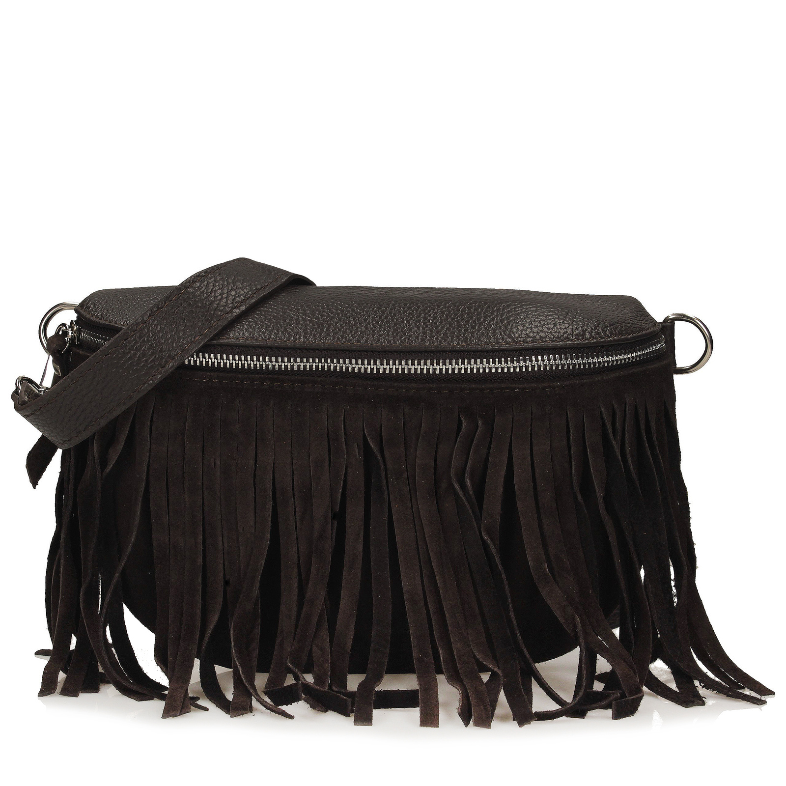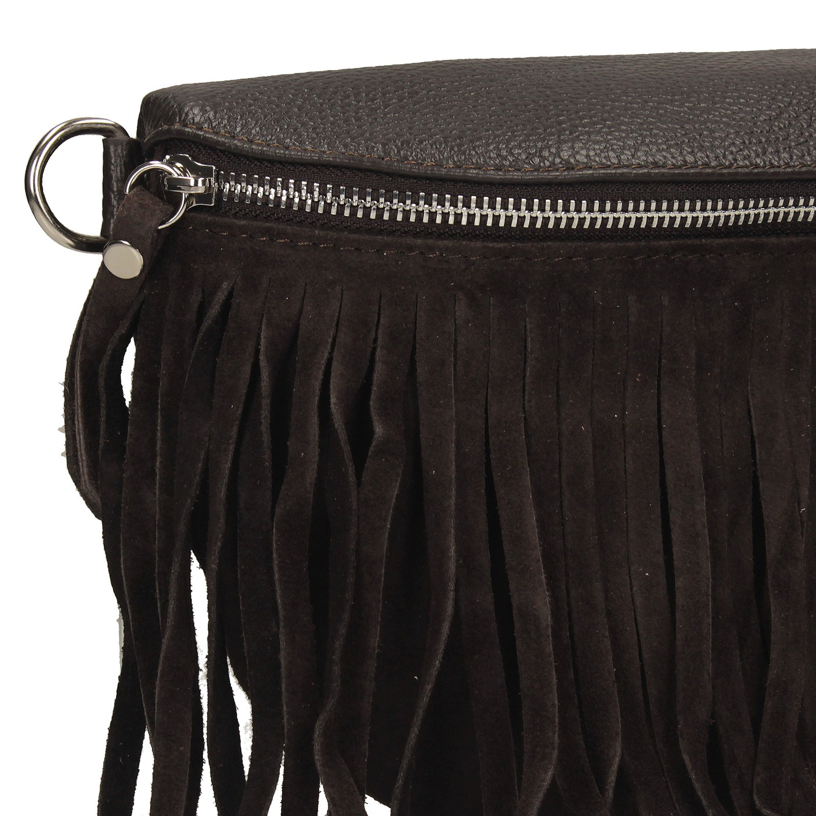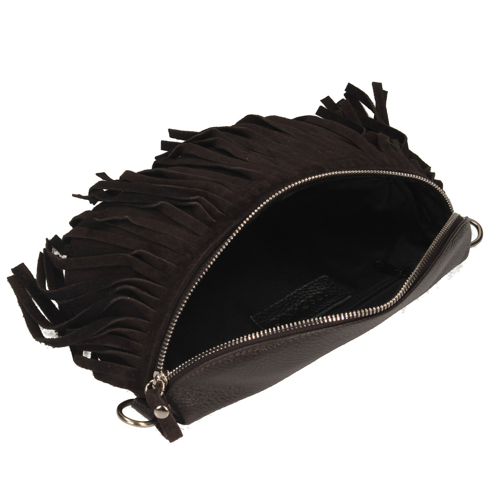 Model posiada jedną praktyczną komorę zapinaną na zamek w kolorze srebra. W środku znajduje się dodatkowa kieszeń, która ułatwia przechowywanie drobiazgów. Charakterystyczne zamszowe frędzle umieszczone przy suwaku dodają całości lekkości i subtelnego boho klimatu, pięknie urozmaicając prostą formę.