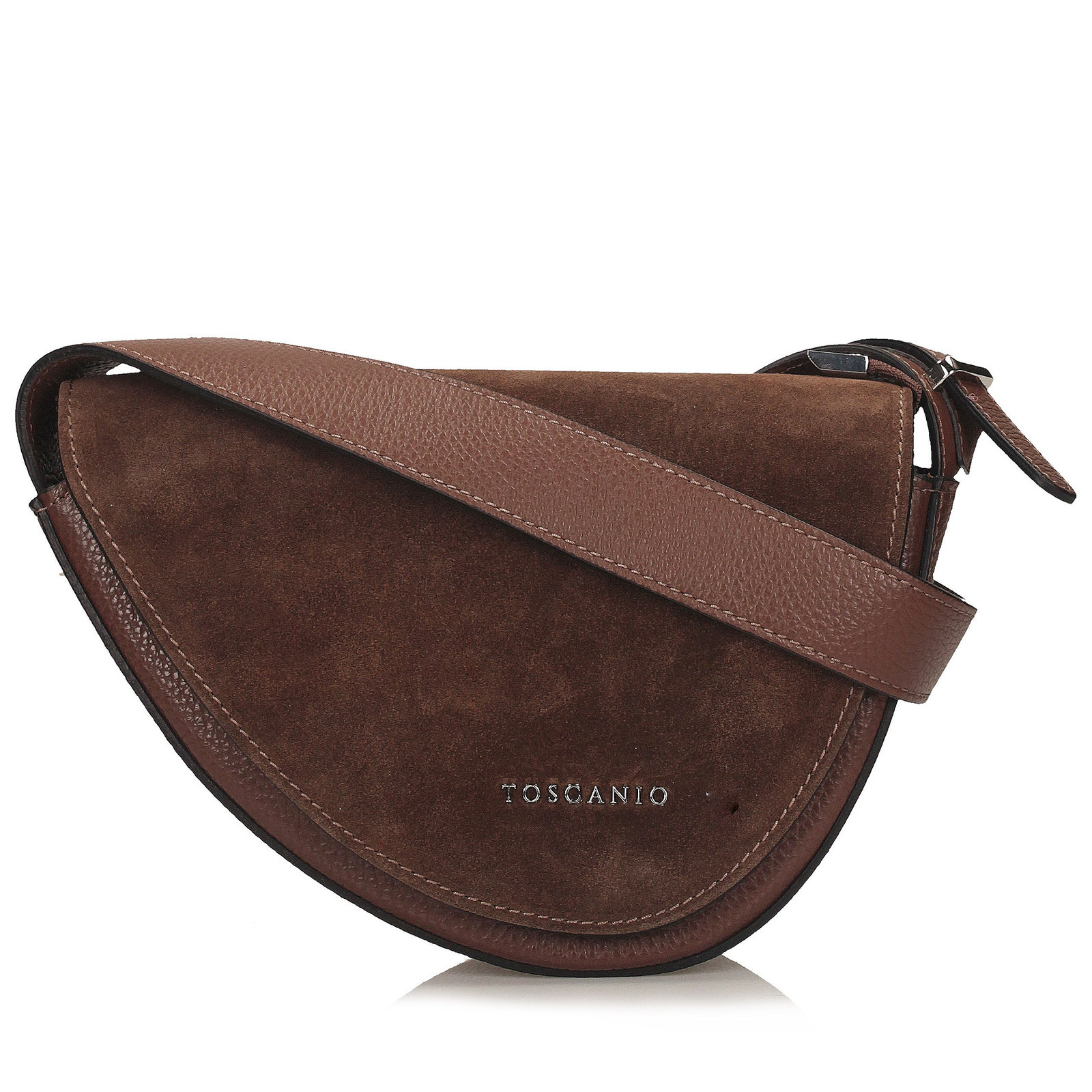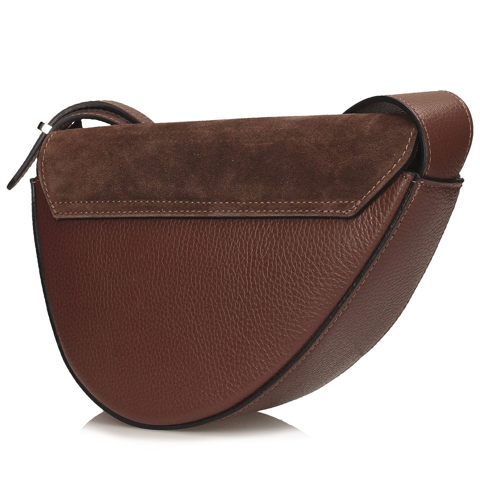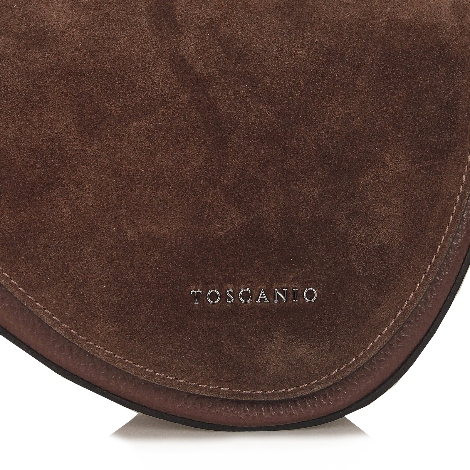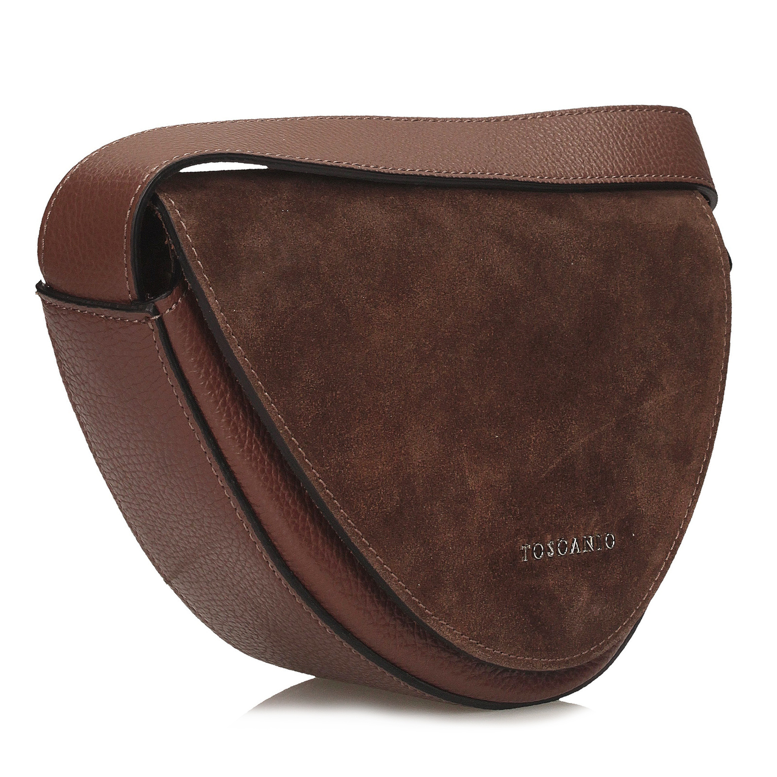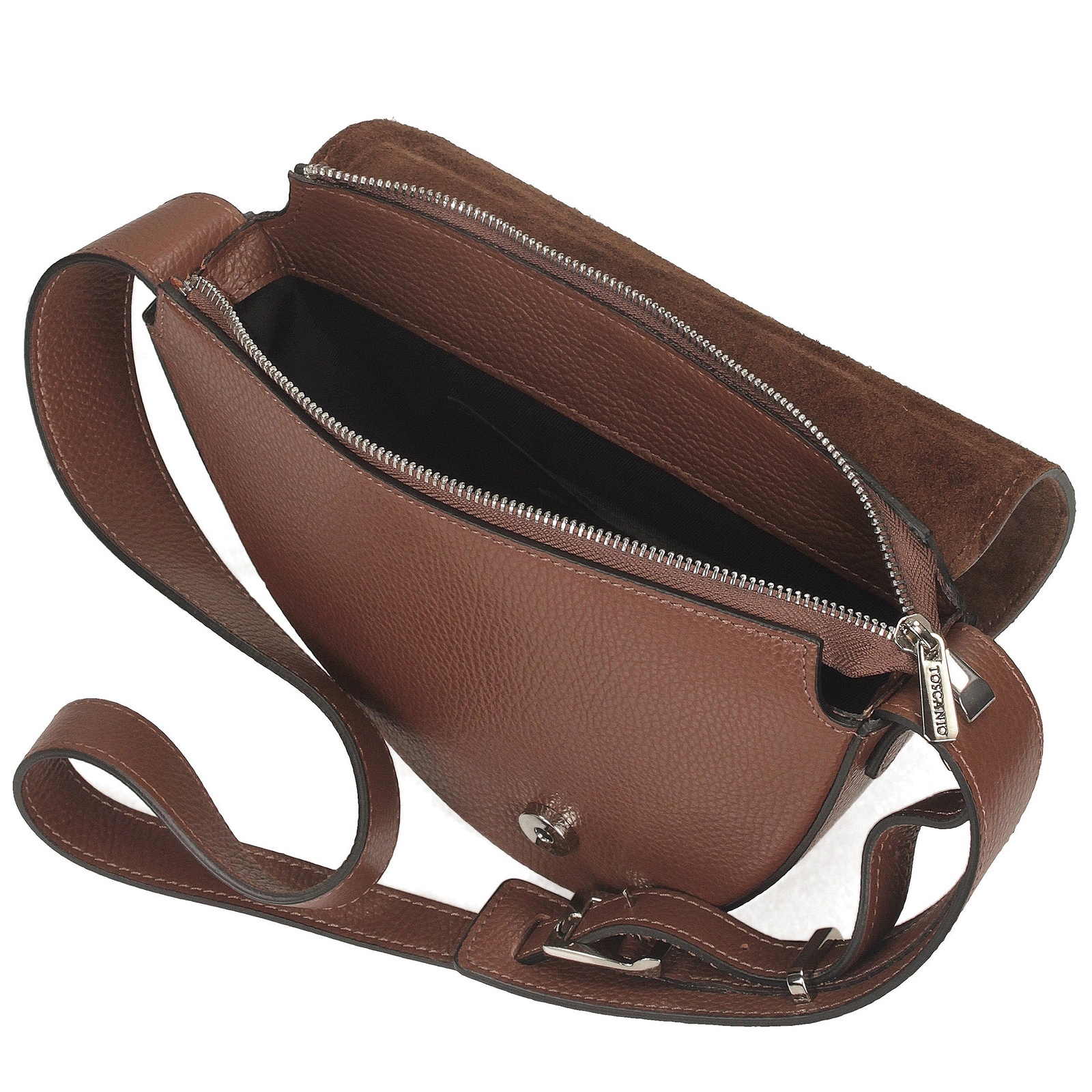 Brązowa listonoszka Toscanio o oryginalnym kształcie delikatnego „V” to model, który wyróżnia się subtelnym, ale wyrazistym designem. Klapka wykonana z miękkiej skóry zamszowej dodaje torebce szlachetnego charakteru i przyciąga wzrok, kontrastując z resztą korpusu wykonaną z groszkowanej skóry naturalnej. Model zamykany jest na zamek błyskawiczny w srebrnym kolorze, a pod klapką znajduje się dodatkowe zabezpieczenie zawartości. Wnętrze wykończone podszewką kryje jedną komorę i kieszeń wewnętrzną, idealną na drobne akcesoria. Długi pasek ze skóry naturalnej (100 cm) umożliwia noszenie torebki na ramieniu lub na skos. Kompaktowa, ale pojemna – świetnie sprawdzi się na co dzień i do bardziej casualowych stylizacji.
