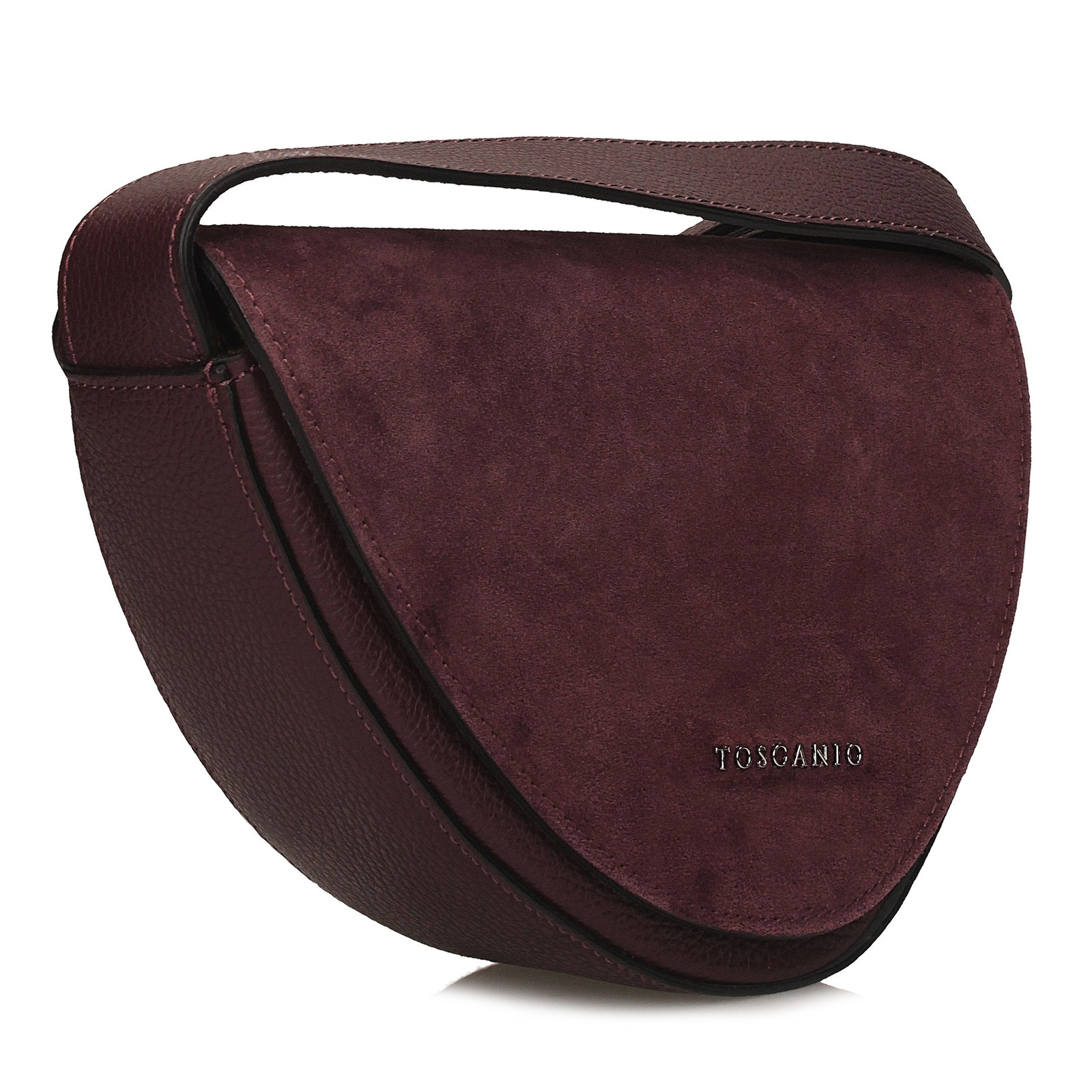 Listonoszka Toscanio w głębokim, bordowym odcieniu to elegancki model o oryginalnym kształcie delikatnego „V”, łączący subtelny design z praktycznością. Klapka wykonana z miękkiej skóry zamszowej dodaje torebce szlachetnego charakteru i efektownie kontrastuje z korpusem z groszkowanej skóry naturalnej. Zamykana na zamek błyskawiczny w srebrnym kolorze, dodatkowo chroniona klapką, gwarantuje bezpieczeństwo przechowywania. Wnętrze wykończone trwałą podszewką skrywa jedną komorę oraz praktyczną kieszeń na drobiazgi. Długi pasek ze skóry naturalnej (100 cm) umożliwia wygodne noszenie na ramieniu lub w formie crossbody. Głęboki, bordowy odcień nadaje modelowi szykownego, jesienno-zimowego charakteru, idealnego do klasycznych i eleganckich stylizacji.