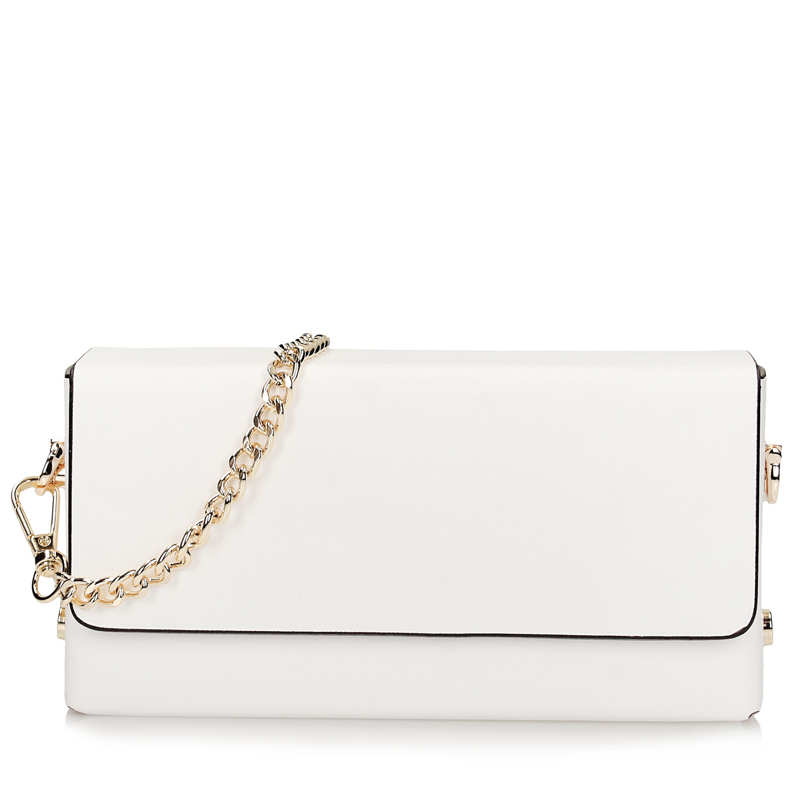 Elegancka kopertówka Toscanio w klasycznym białym kolorze to model o wyrazistej, pudełkowej formie, wykonany ze sztywnej skóry naturalnej. Minimalistyczny fason uzupełnia złote zapięcie na magnes oraz delikatny, metalowy łańcuszek, który dodaje całości szyku i umożliwia noszenie torebki na ramieniu. Wnętrze również wykończone skórą naturalną, zapewnia trwałość i stylowy charakter. Idealna propozycja na wyjątkowe okazje – od wesel po eleganckie wieczorne wyjścia.
