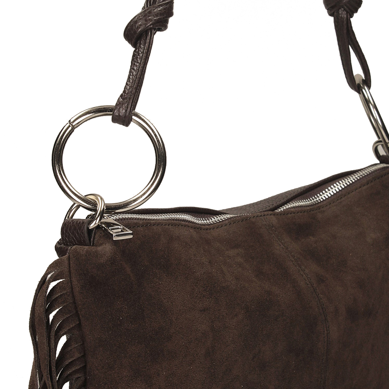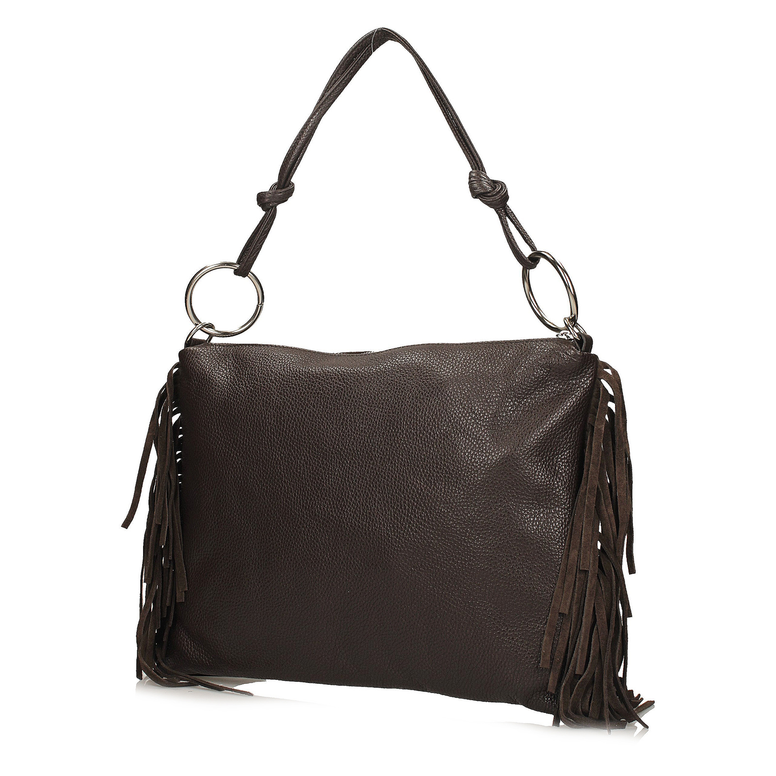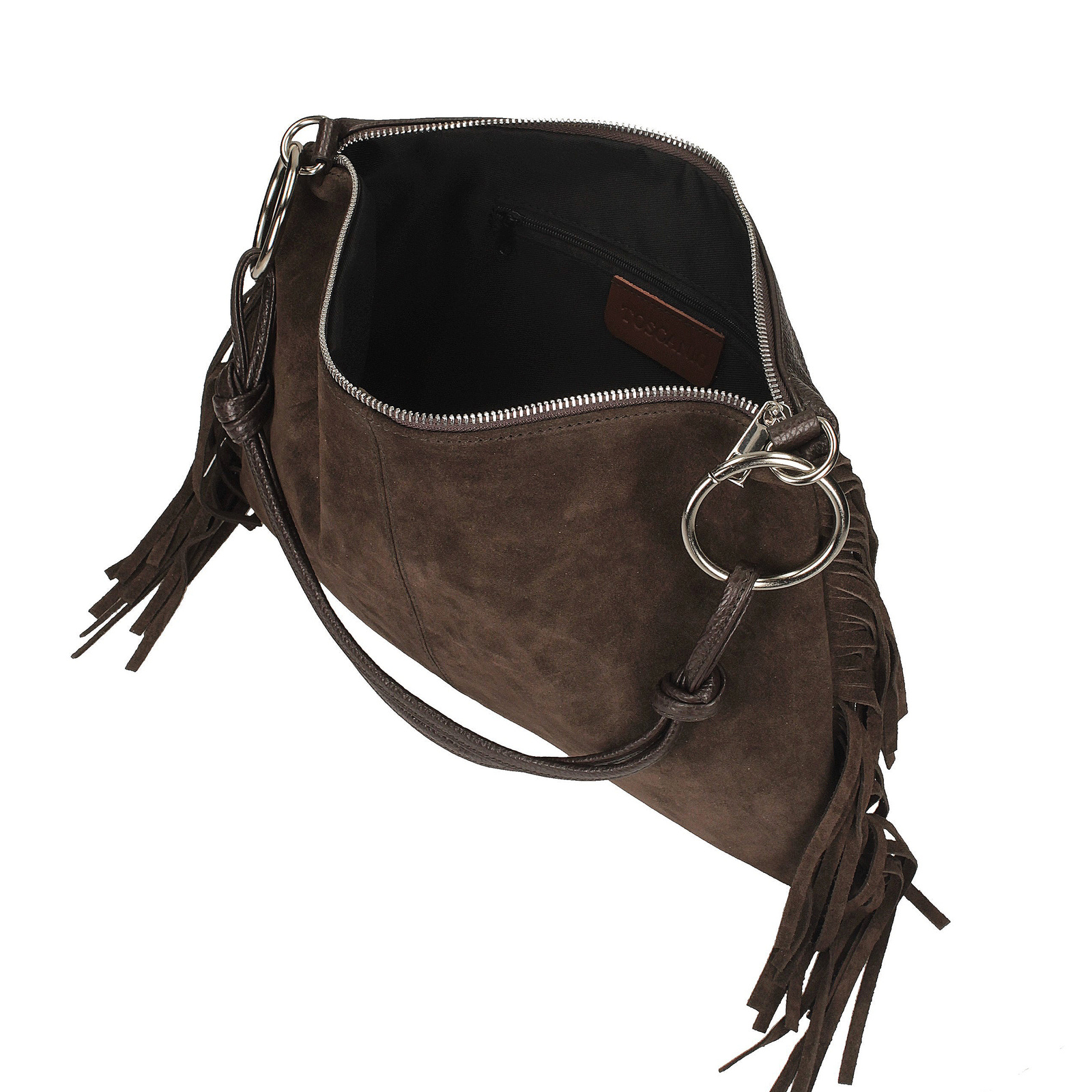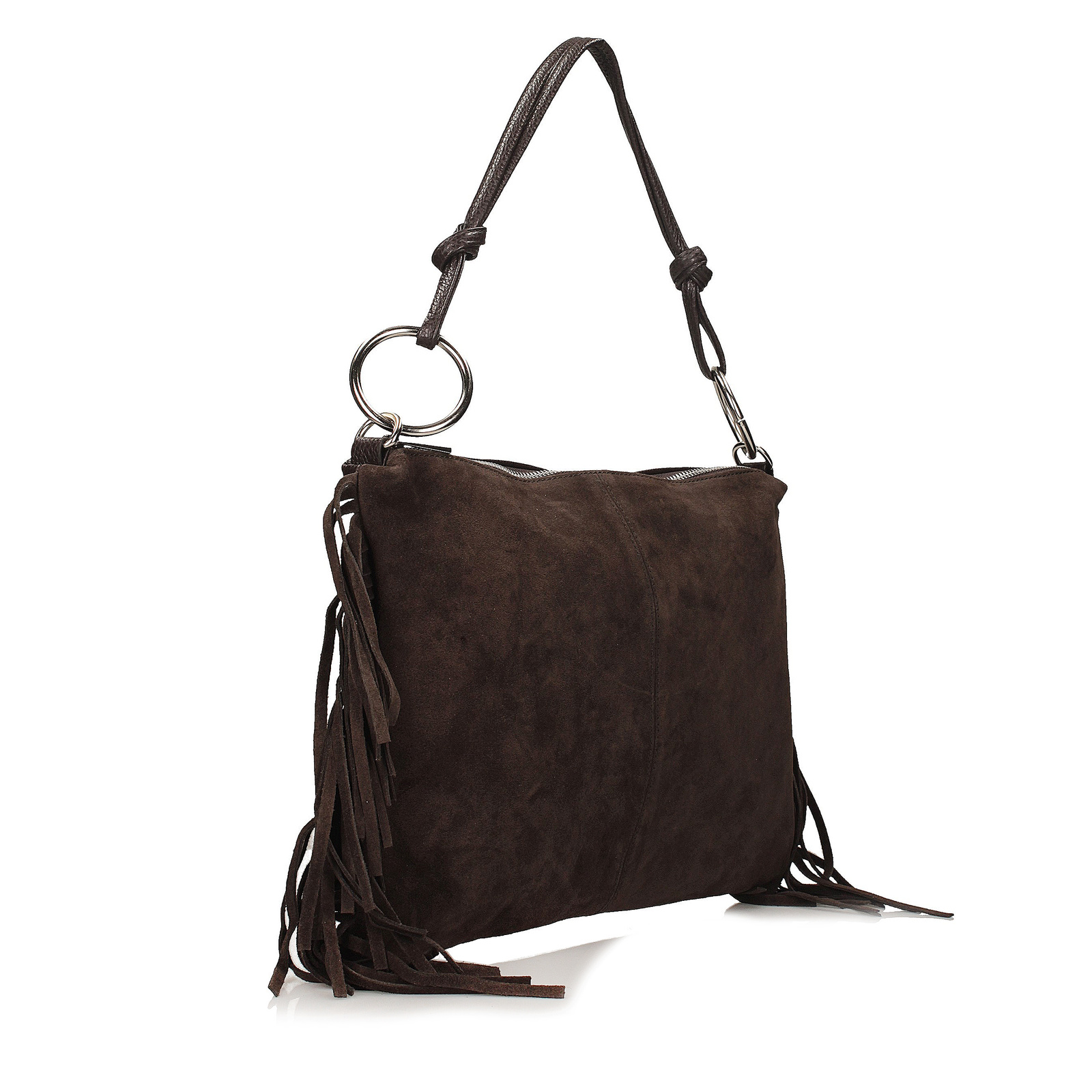 Brązowa listonoszka marki Toscanio to połączenie klasyki i stylu boho w eleganckim wydaniu. Przód torebki wykonano z miękkiej skóry zamszowej, która nadaje jej subtelnej elegancji, natomiast tył został uszyty ze skóry naturalnej o groszkowanej fakturze, zapewniającej trwałość i nowoczesny charakter. Po bokach całość zdobią długie frędzle, które wprowadzają lekkość i swobodny klimat. Torebka zapinana jest na zamek w kolorze srebrnym, a w środku, wykończonym tkaniną, znajduje się jedna komora oraz praktyczna kieszonka na drobiazgi. To model, który świetnie sprawdzi się zarówno na co dzień, jak i w stylizacjach w duchu boho-chic.