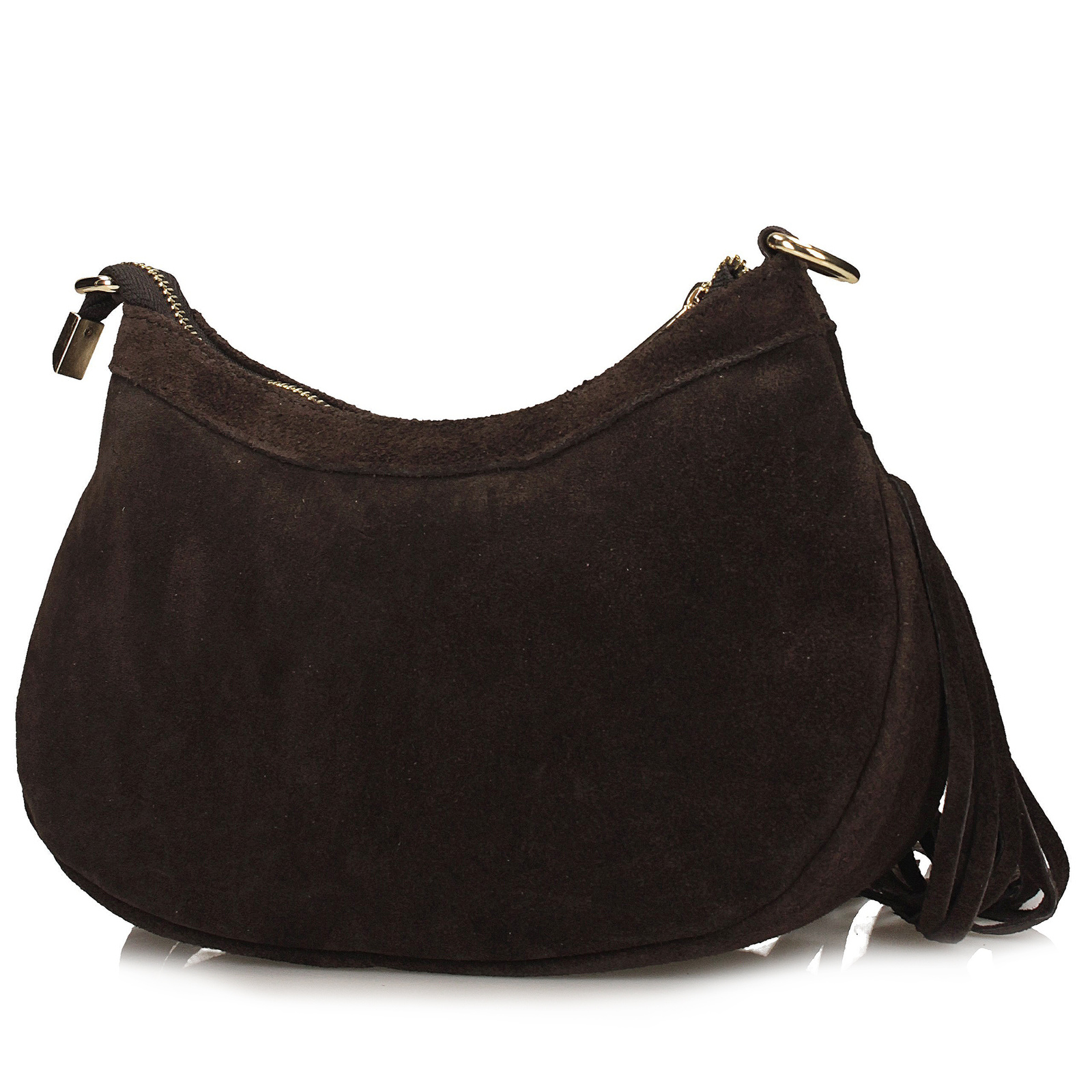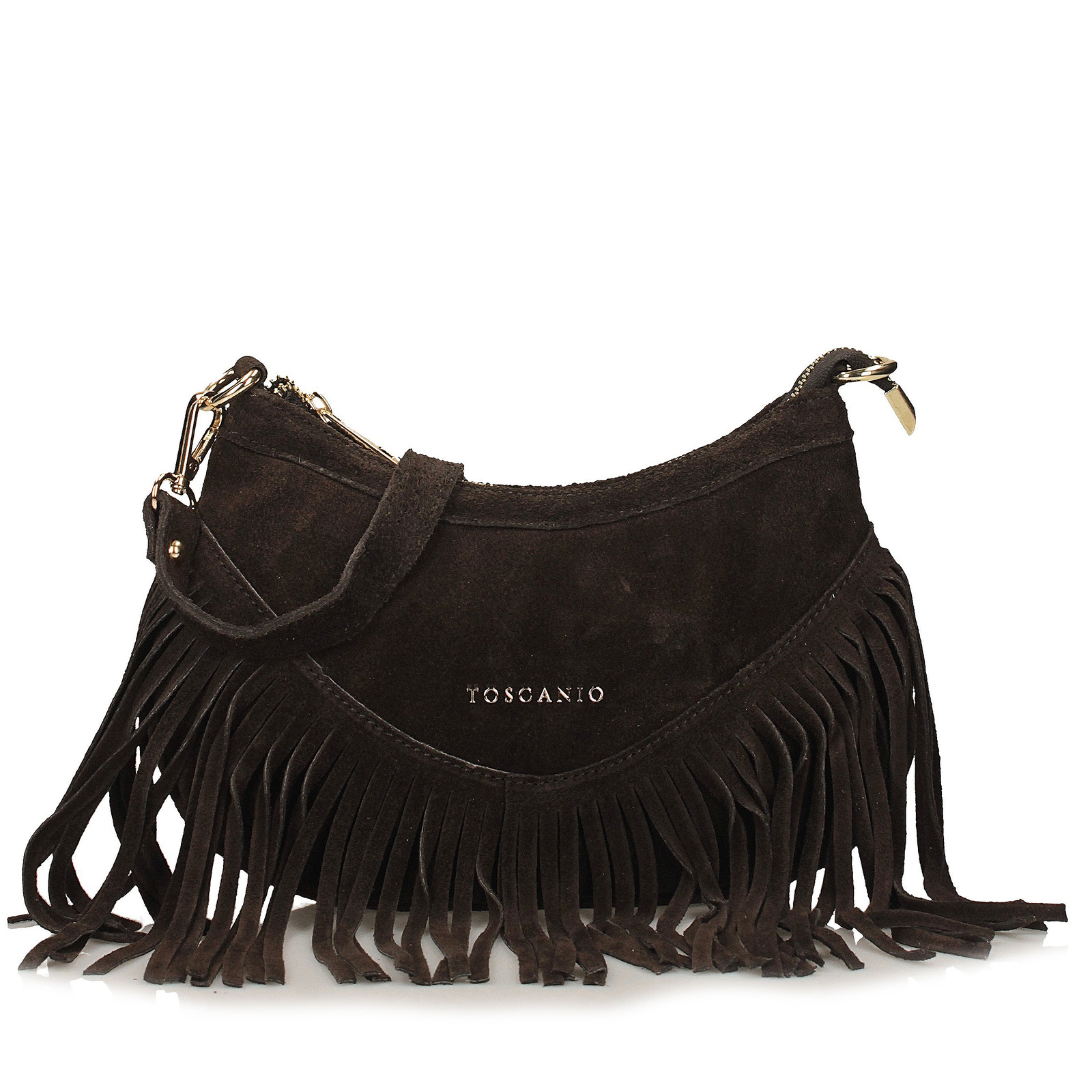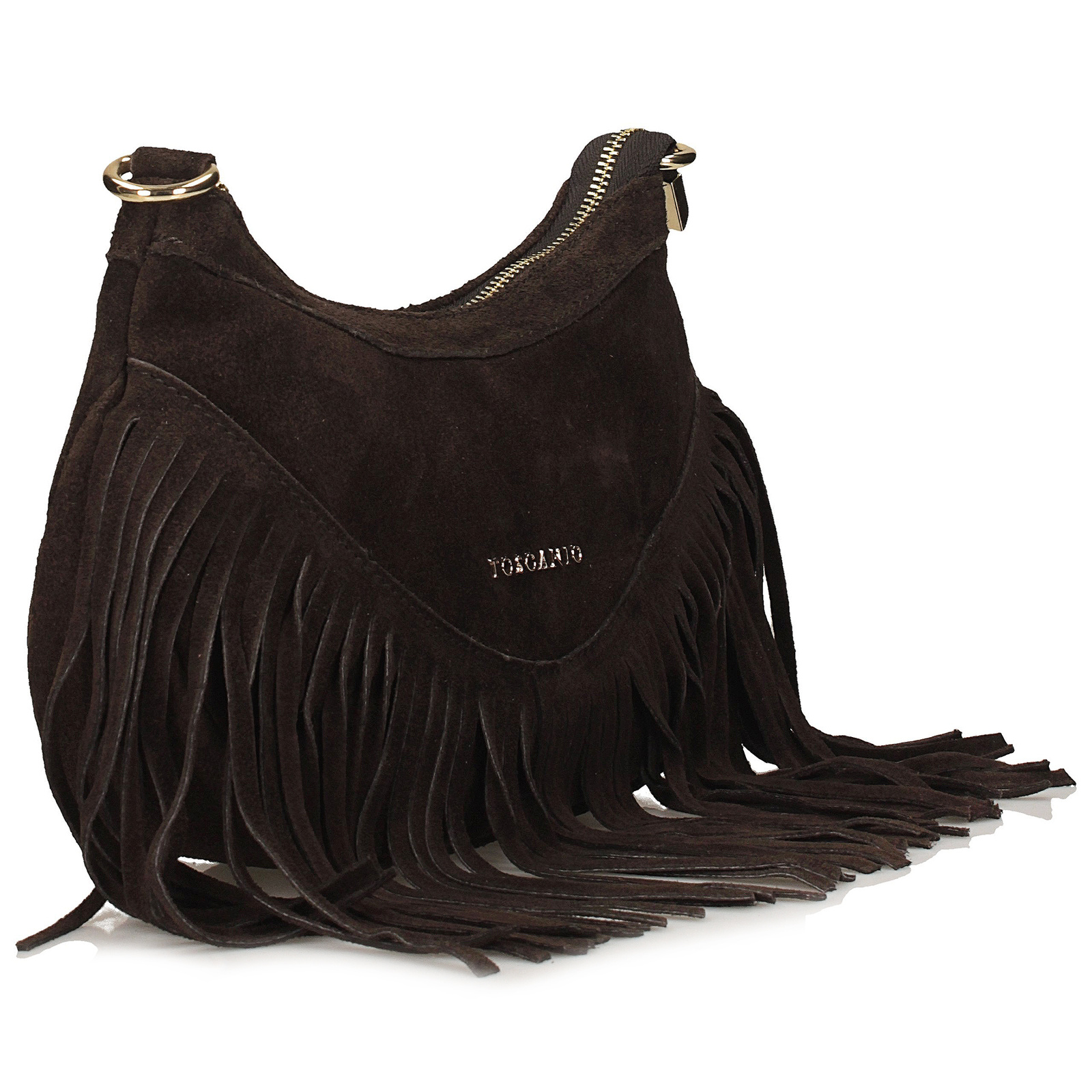 Brązowa listonoszka marki Toscanio to propozycja, która łączy naturalny charakter skóry zamszowej z modnym, swobodnym stylem. W całości wykonana z miękkiego zamszu, zachwyca elegancką fakturą i ponadczasowym kolorem. Dolną część torebki zdobią długie frędzle, które dodają całości lekkości i wprowadzają odrobinę klimatu boho. Model zapinany jest na zamek w złotym kolorze, a wewnątrz znajduje się przestronna komora wykończona tkaniną oraz praktyczna kieszonka. Regulowany pasek ze skóry naturalnej (110 cm) umożliwia komfortowe noszenie zarówno na ramieniu, jak i na skos. Torebka będzie idealnym dodatkiem do codziennych stylizacji, w których liczy się zarówno wygoda, jak i modny akcent.