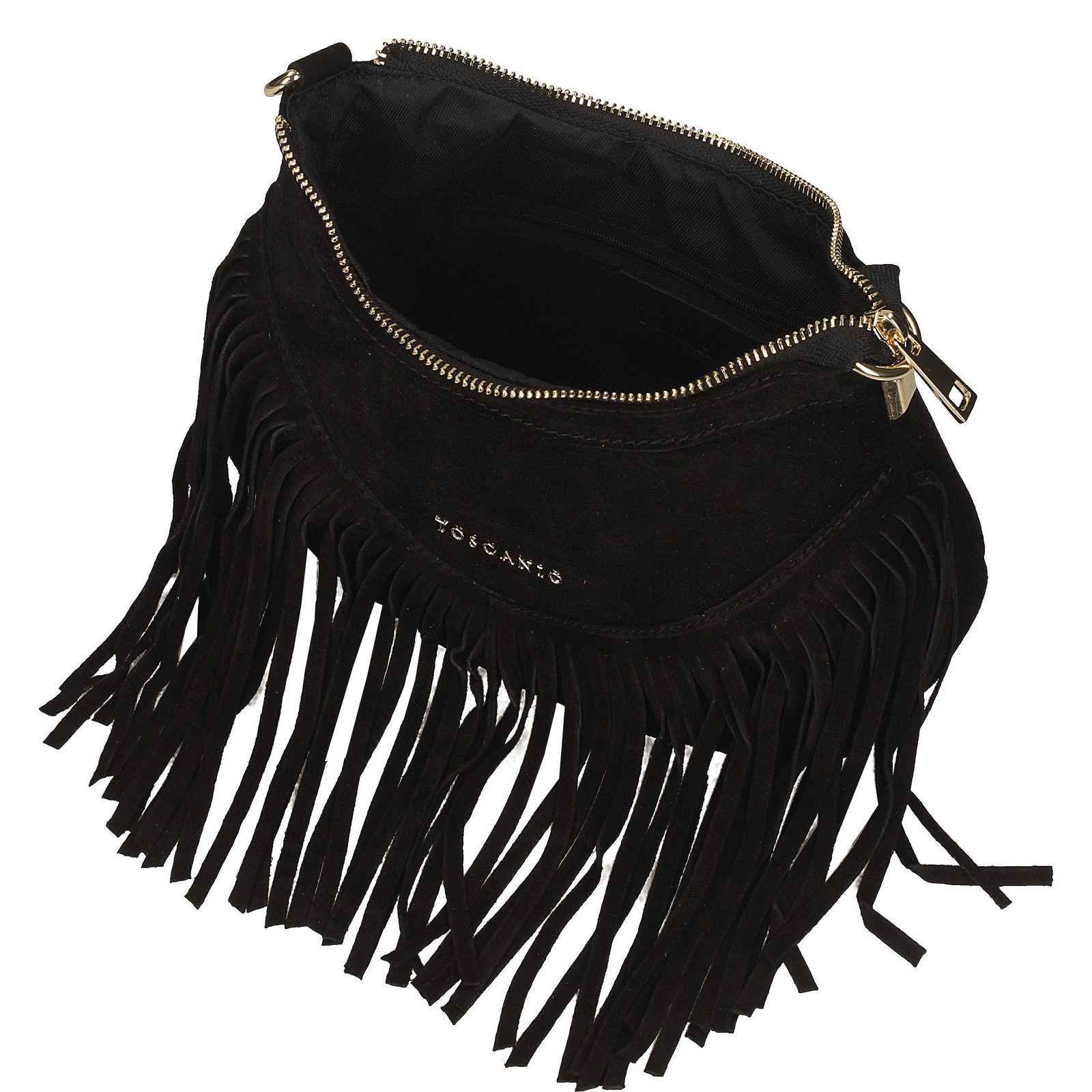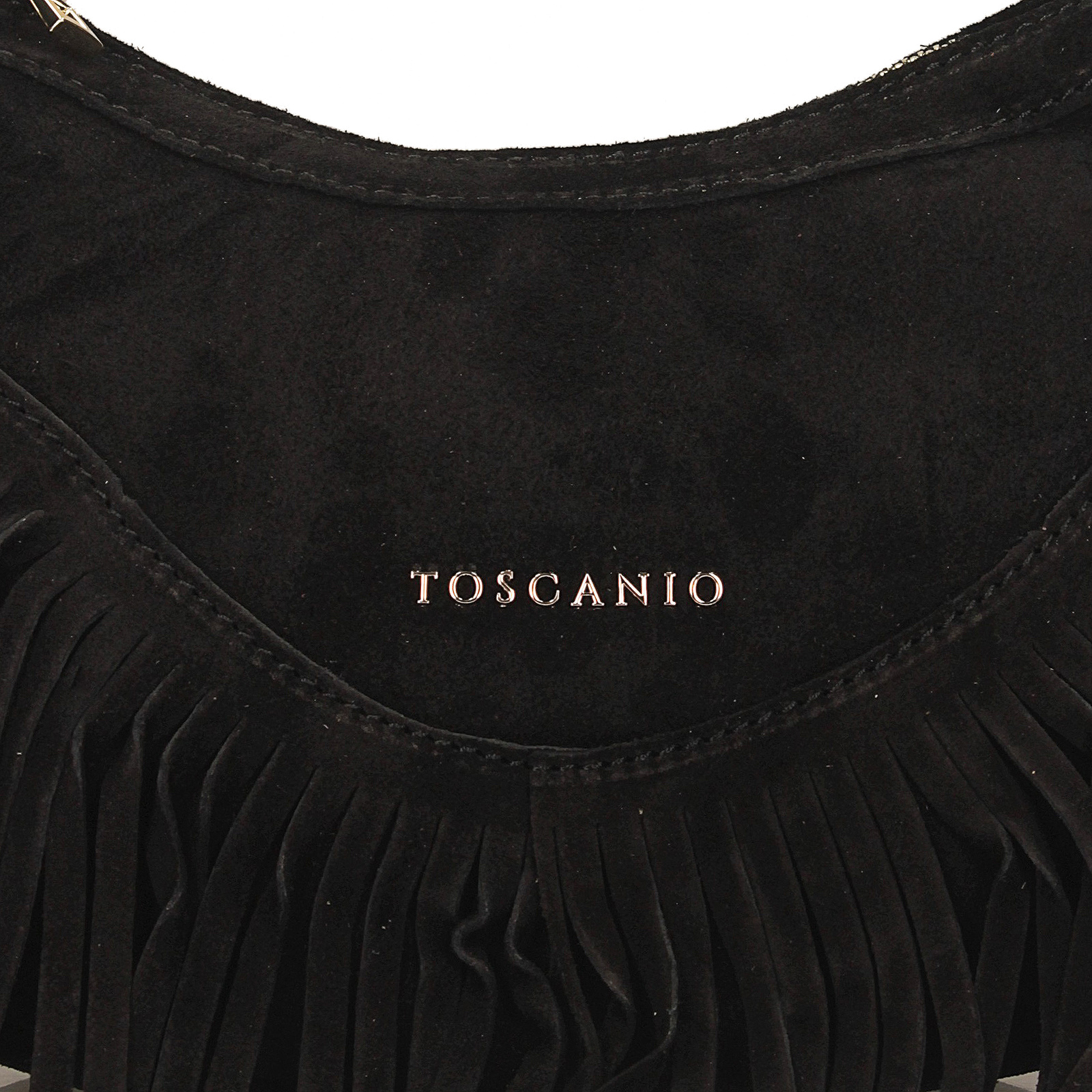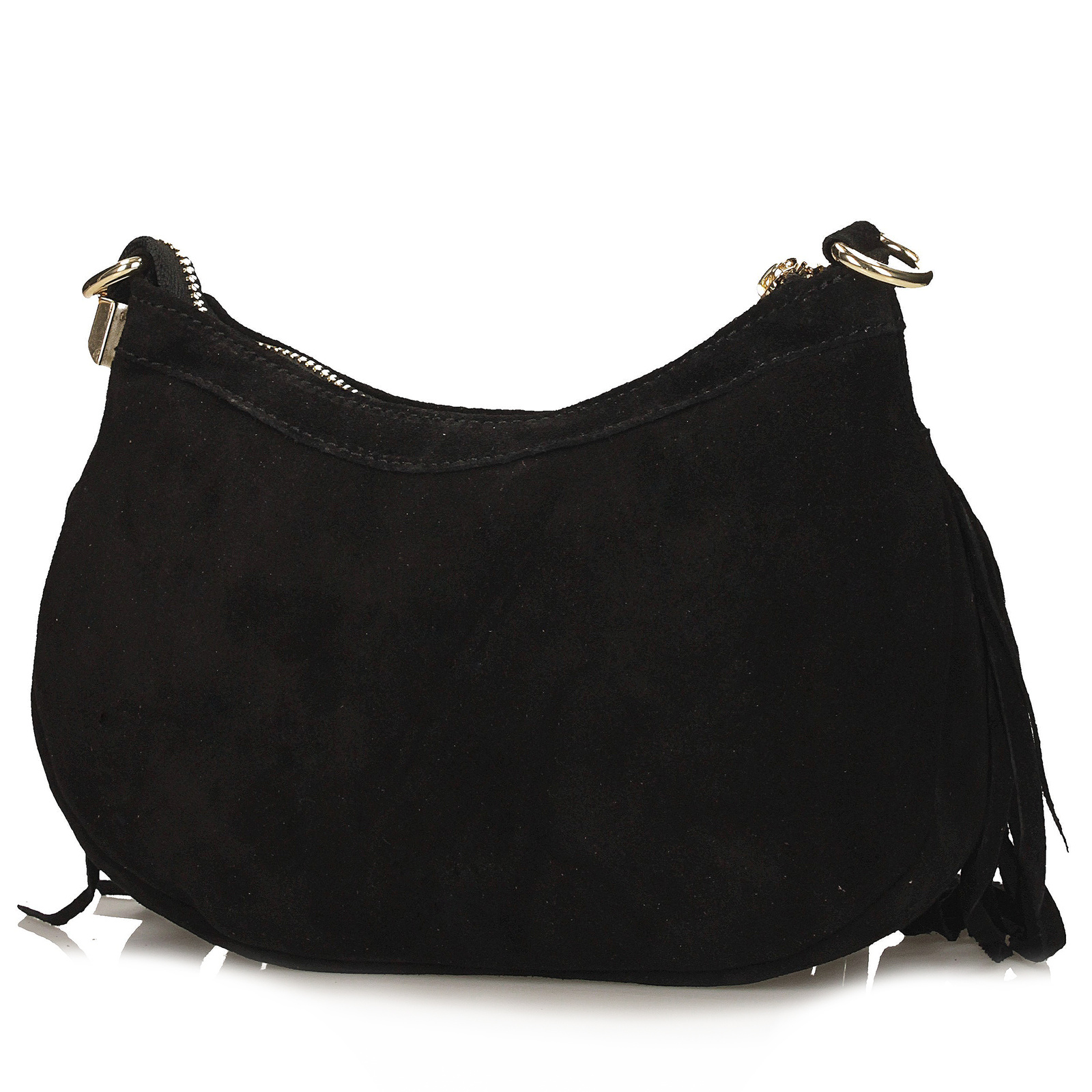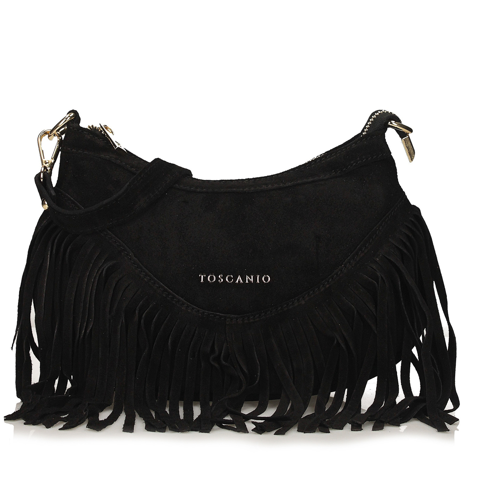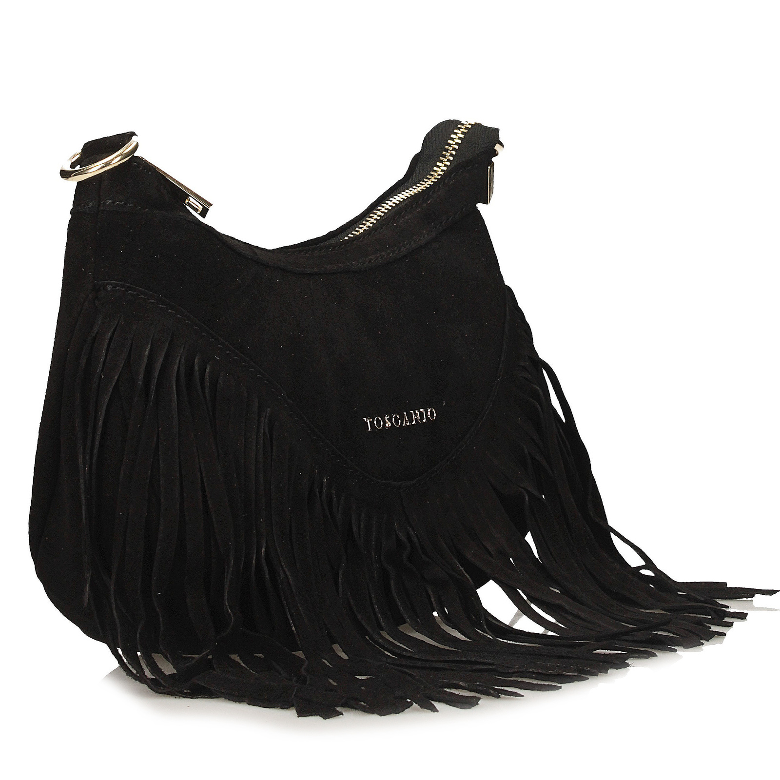 Czarna listonoszka marki Toscanio to propozycja, która łączy naturalny charakter skóry zamszowej z modnym, swobodnym stylem. W całości wykonana z miękkiego zamszu, zachwyca elegancką fakturą i ponadczasowym kolorem. Dolną część torebki zdobią długie frędzle, które dodają całości lekkości i wprowadzają odrobinę klimatu boho. Model zapinany jest na zamek w złotym kolorze, a wewnątrz znajduje się przestronna komora wykończona tkaniną oraz praktyczna kieszonka. Regulowany pasek ze skóry naturalnej (110 cm) umożliwia komfortowe noszenie zarówno na ramieniu, jak i na skos. Torebka będzie idealnym dodatkiem do codziennych stylizacji, w których liczy się zarówno wygoda, jak i modny akcent.