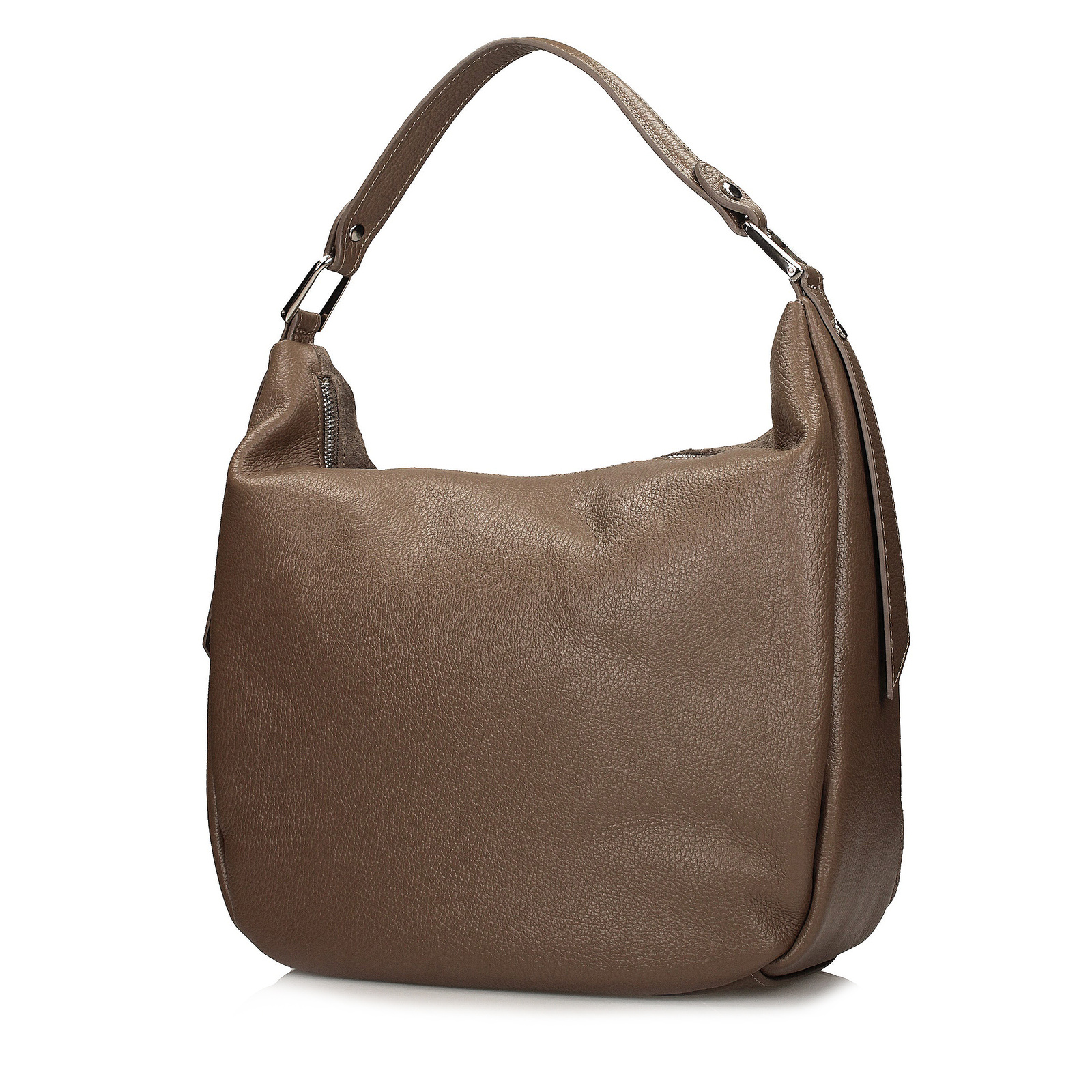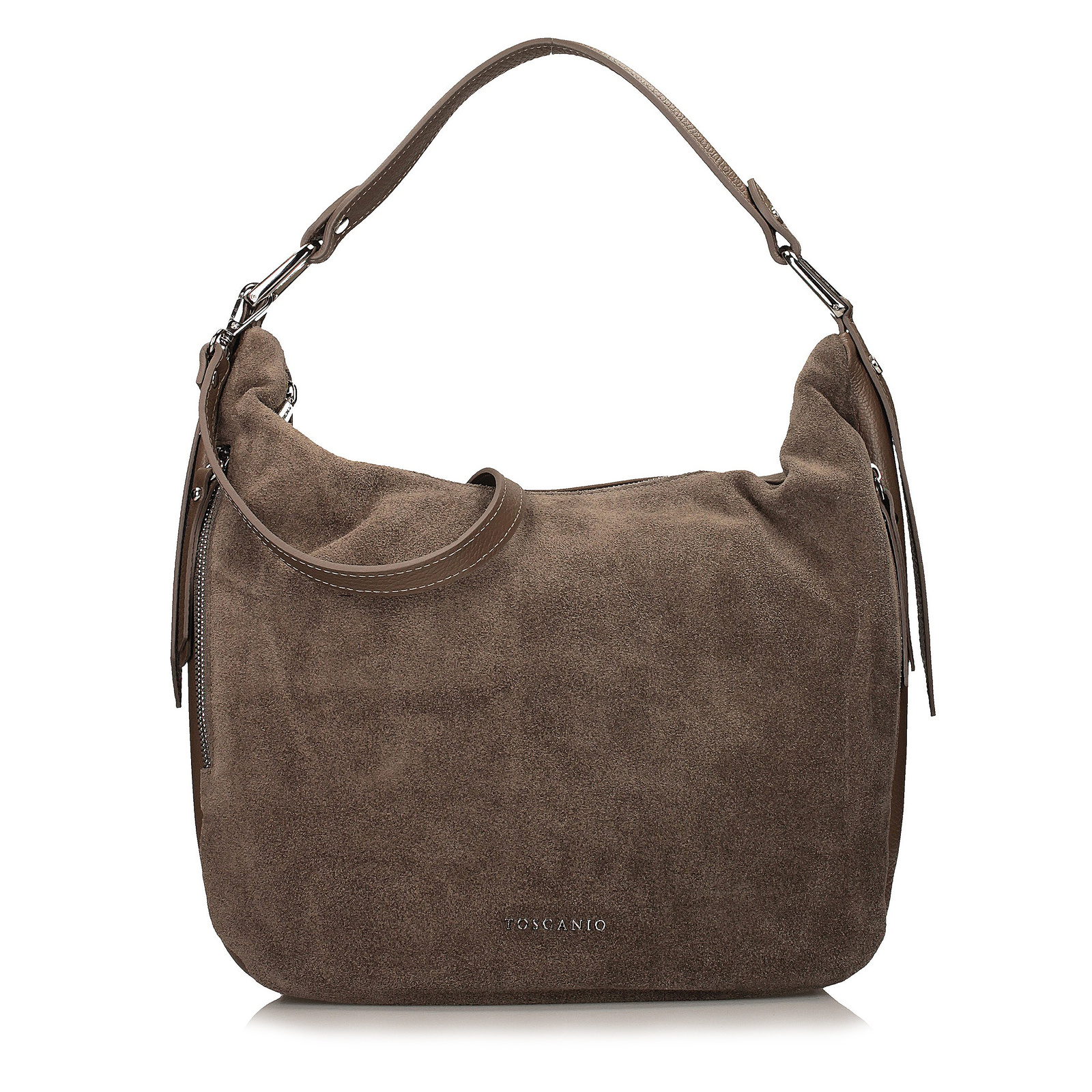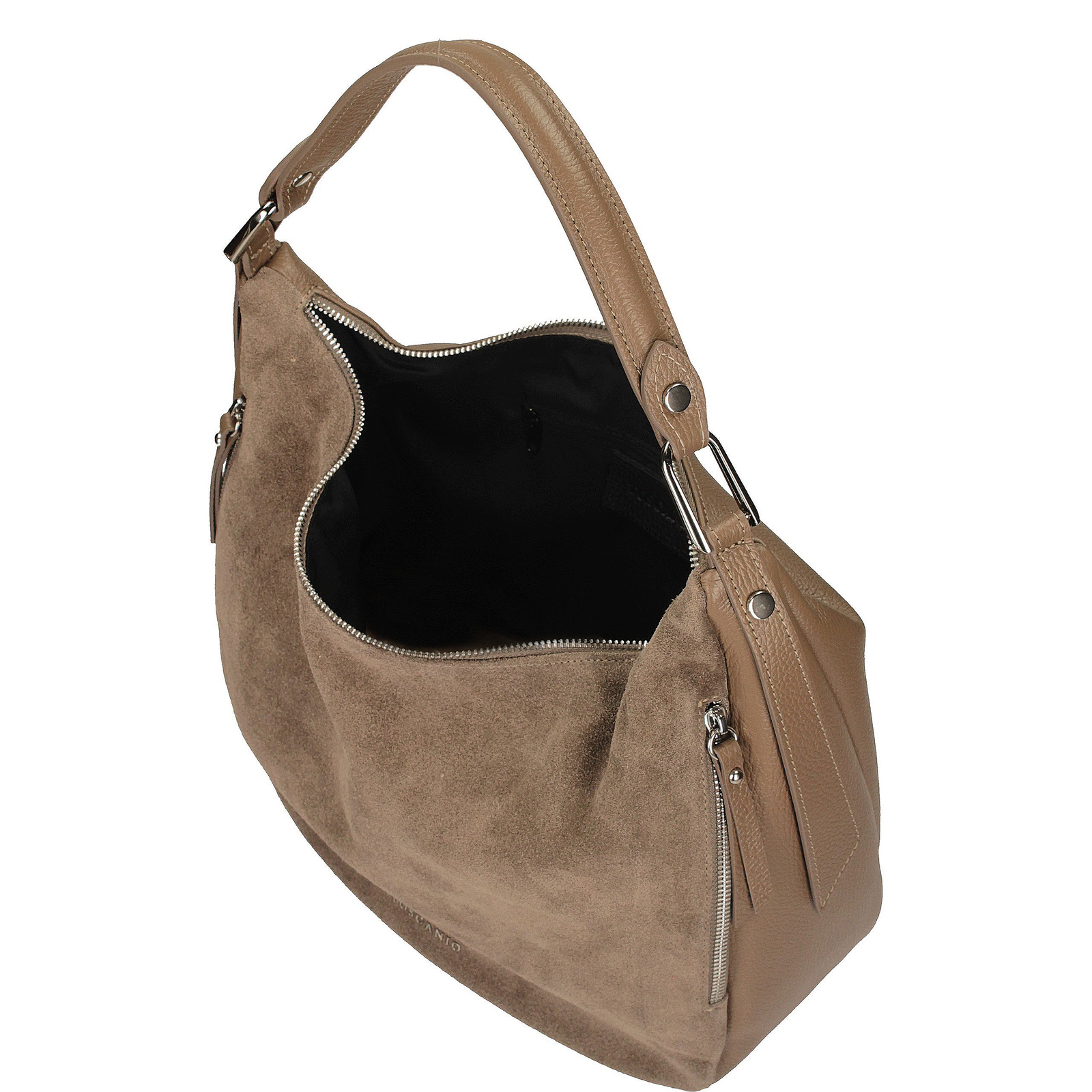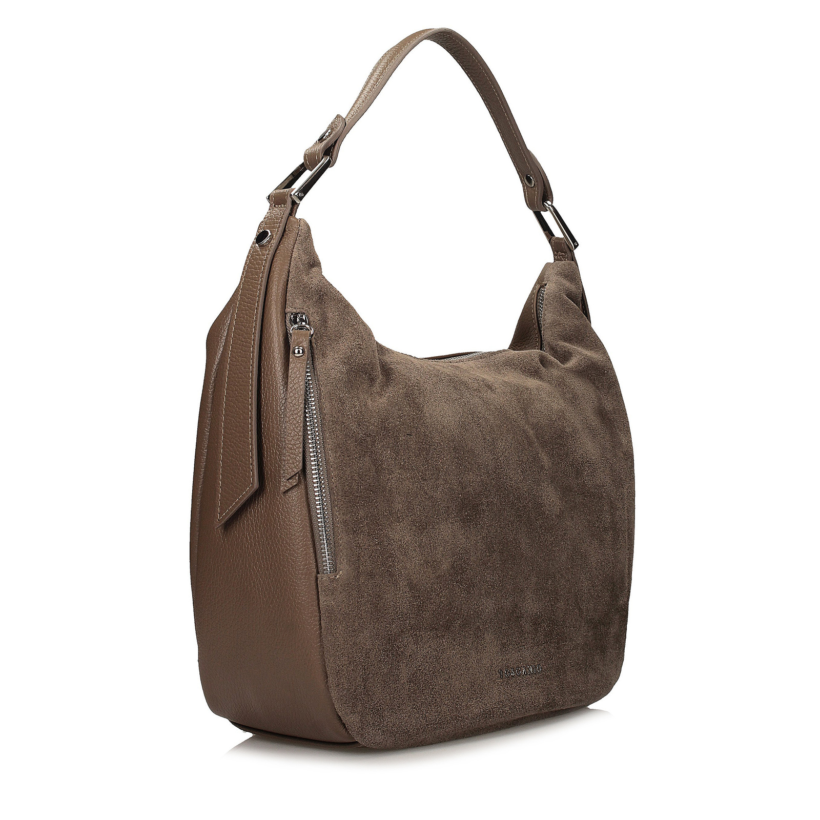 Worek marki Toscanio w kolorze ciemnego beżu to elegancka i funkcjonalna propozycja dla kobiet ceniących połączenie stylu z wygodą. Torebka została wykonana ze skóry naturalnej – przód zdobi miękka skóra zamszowa, natomiast tył to skóra licowa o groszkowanej fakturze, co podkreśla jej unikalny charakter. Model zapinany jest na zamek w kolorze srebrnym i bez problemu mieści format A4, dzięki czemu doskonale sprawdzi się zarówno na co dzień, jak i w pracy. Wnętrze wyłożone tkaniną kryje jedną komorę oraz praktyczną kieszeń, a dodatkowym atutem są dwie zewnętrzne kieszenie umieszczone po bokach. Torebka posiada wygodne uszy o długości 40 cm oraz dopinany pasek (120 cm), który umożliwia noszenie jej również na skos. Uniwersalny odcień ciemnego beżu sprawia, że łatwo dopasować ją do wielu stylizacji – od casualowych po bardziej eleganckie.