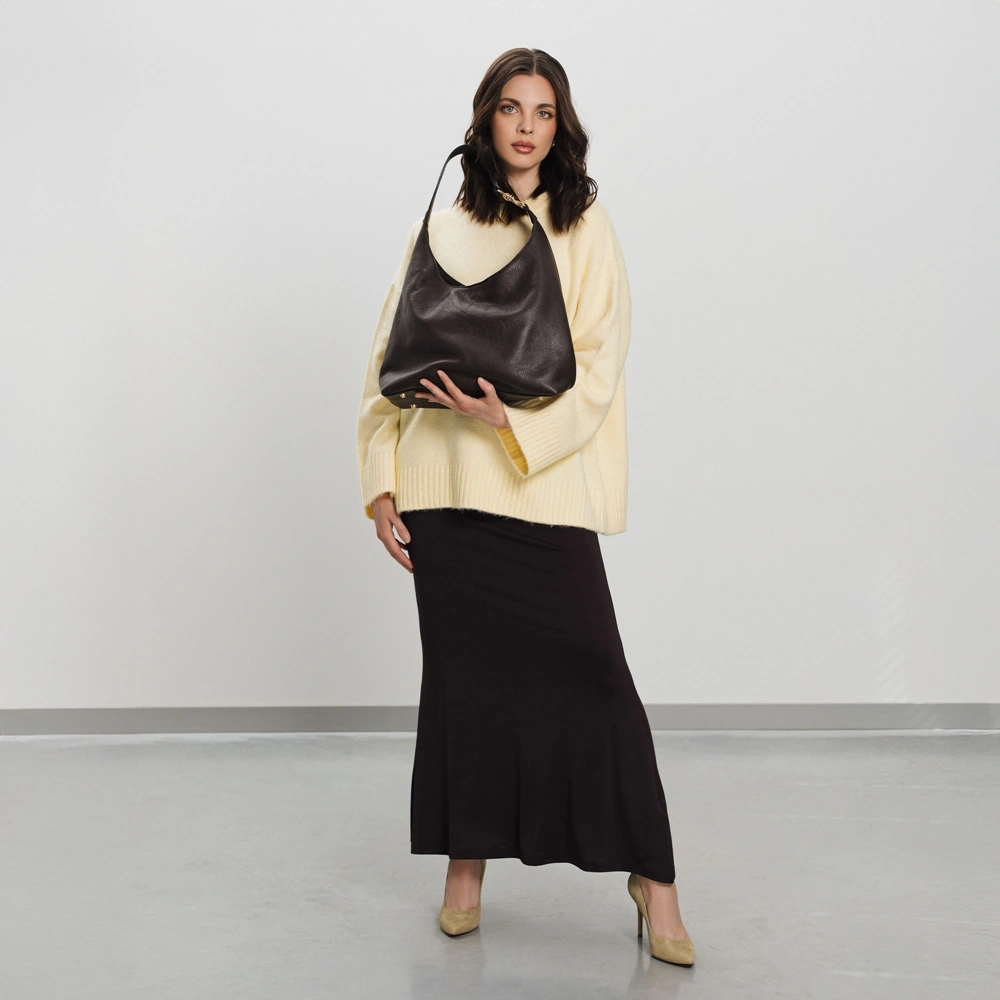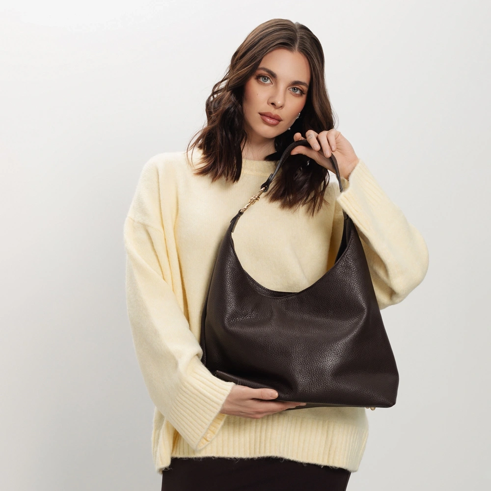 Brązowa torebka worek Toscanio to klasyczny model, który zachwyca prostotą i elegancją. Wykonana z wysokiej jakości skóry naturalnej, łączy minimalistyczny fason z subtelnym, ozdobnym akcentem – na uszach torby znajduje się złota pętelka, która dodaje całości szyku i oryginalności.