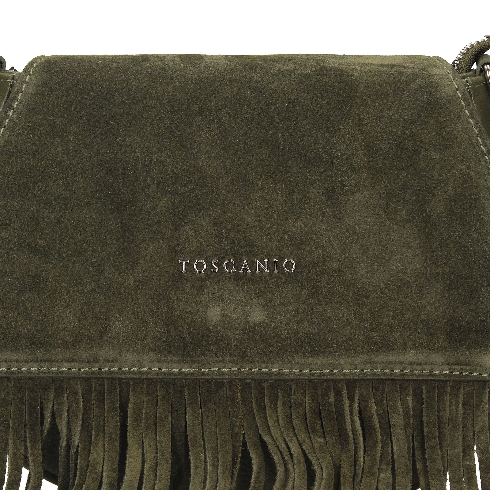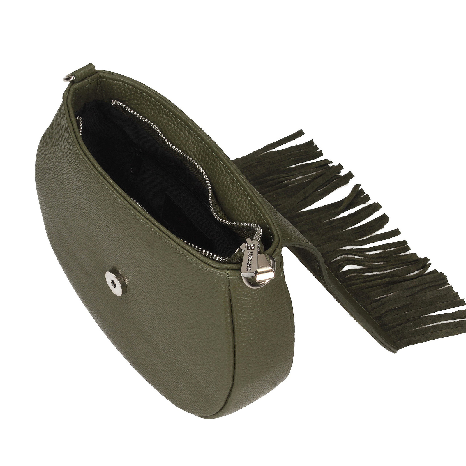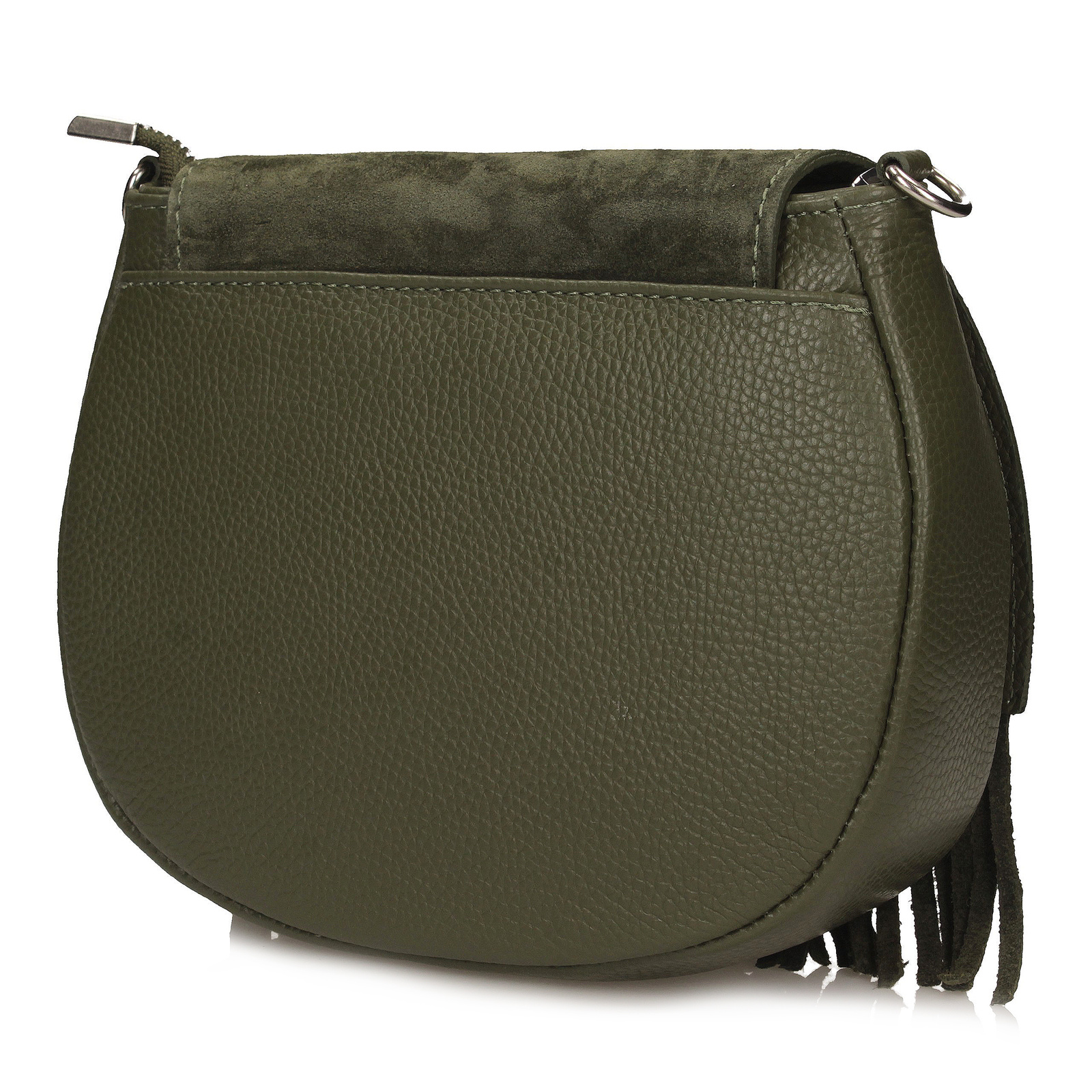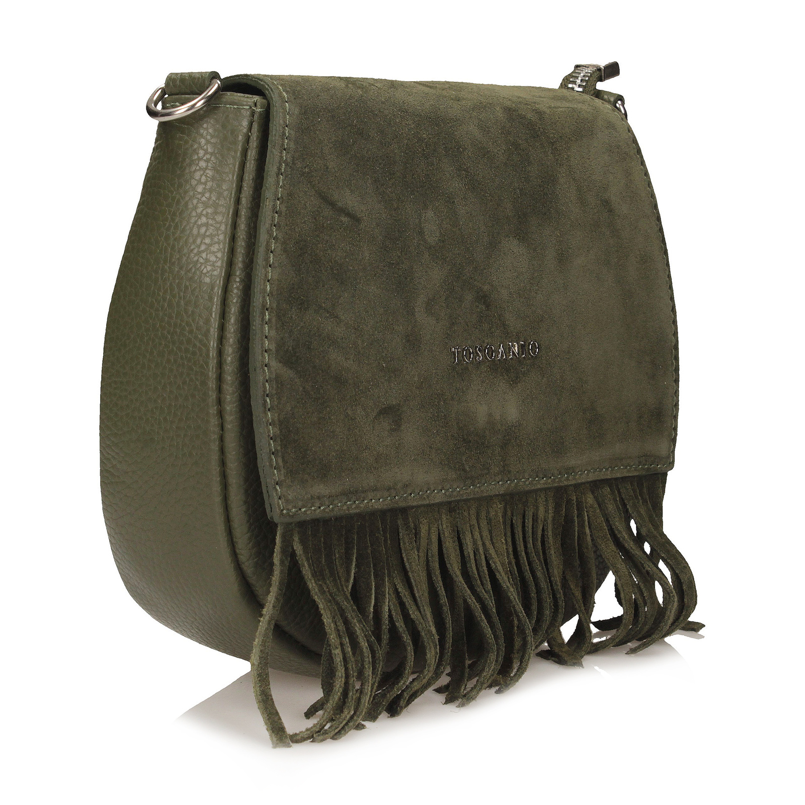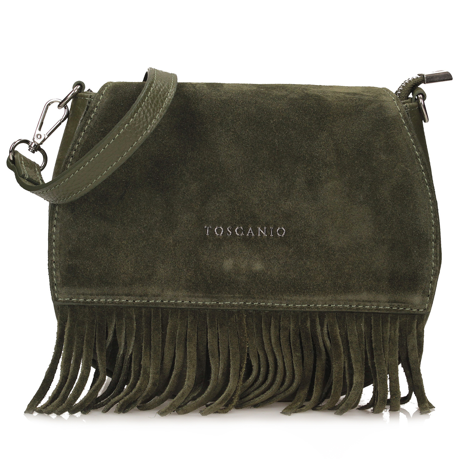 Zielona listonoszka Toscanio wykonana z wysokiej jakości skóry naturalnej zamszowej to propozycja o klasycznym kroju z nutą boho. U dołu klapki znajdują się ozdobne frędzle, które nadają całości lekkości i charakteru. Torebka ma jedną komorę zamykaną na zamek, wewnątrz dodatkową kieszeń, a całość uzupełniają srebrne detale. Regulowany pasek ze skóry naturalnej zapewnia wygodę noszenia i dopasowanie do różnych stylizacji.