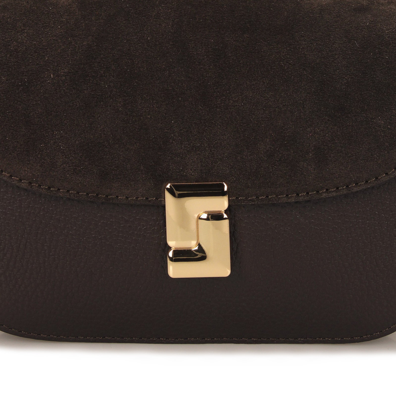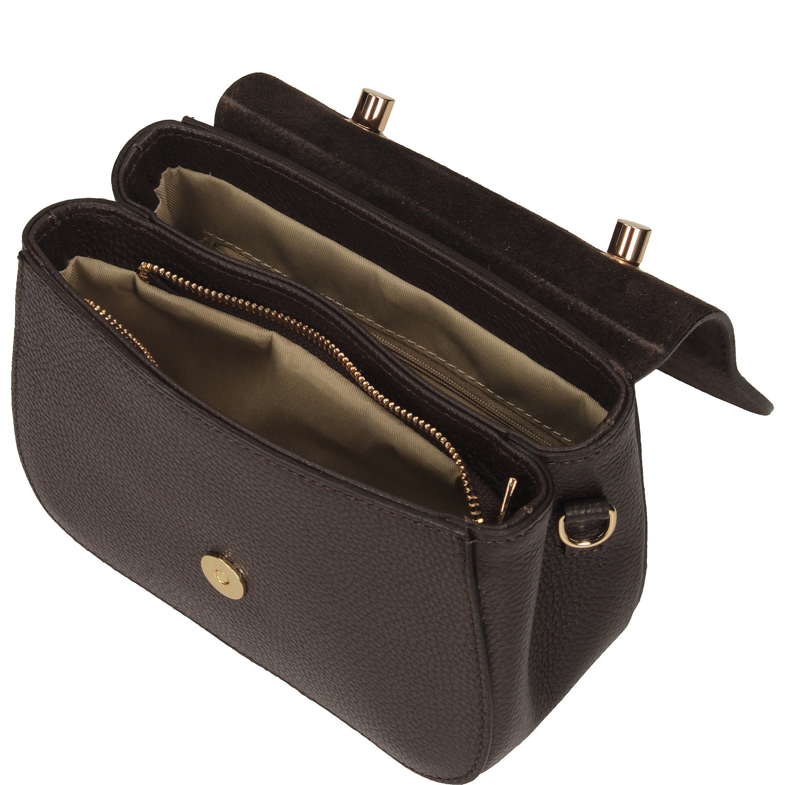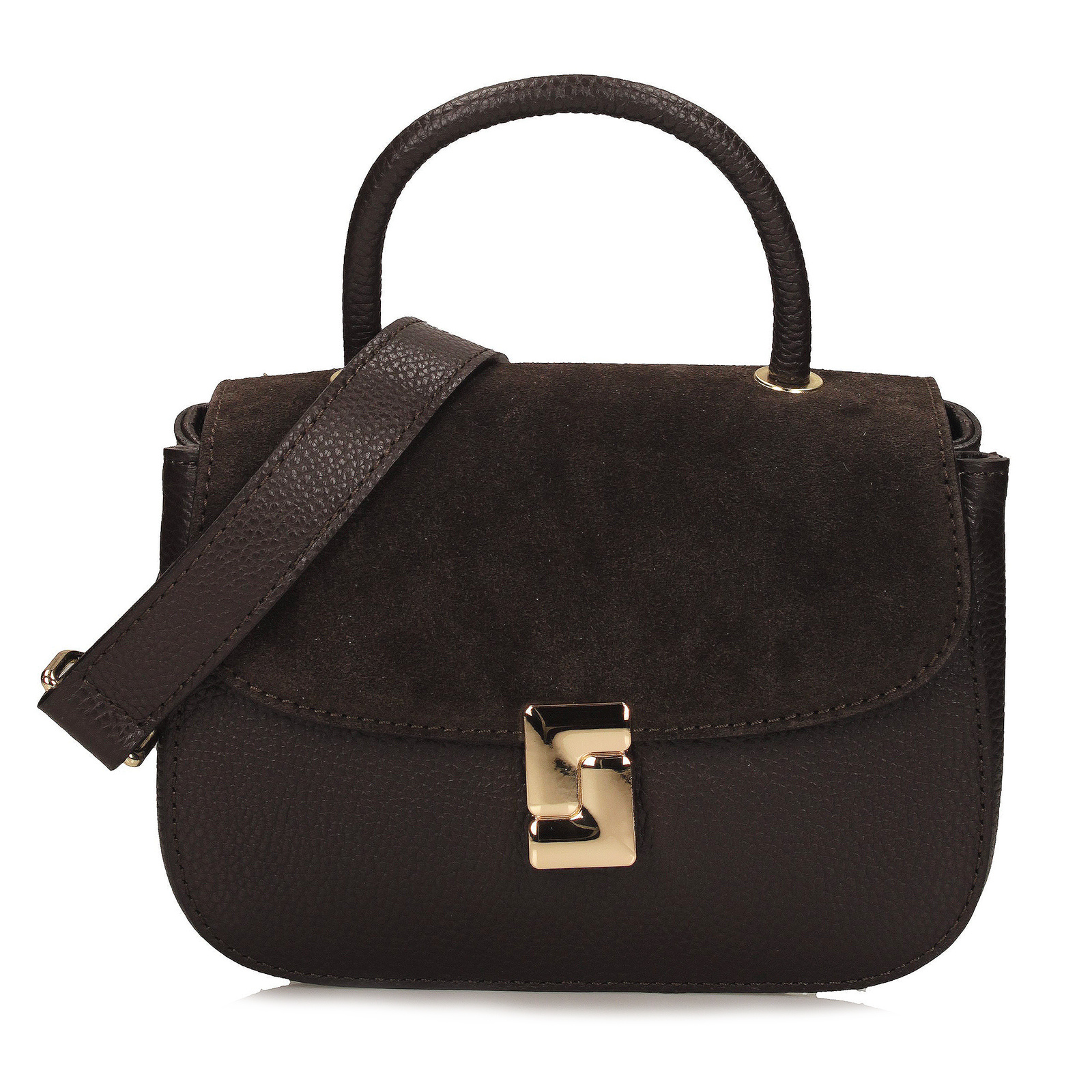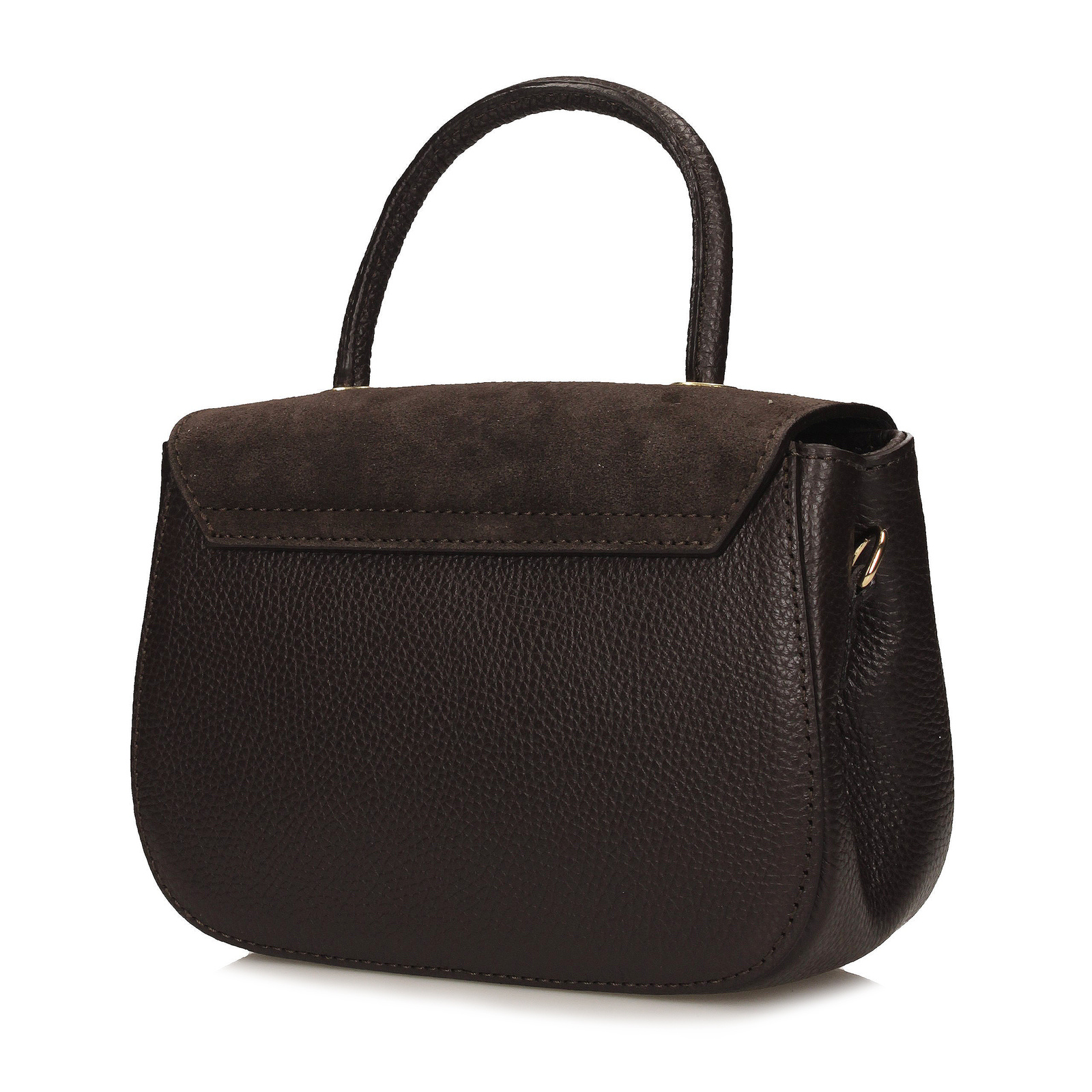Toscanio w odcieniu klasycznego brązu to listonoszka, która łączy zmysłową elegancję z praktyczną formą. Klapka została wykonana z miękkiego zamszu, który pięknie kontrastuje z licową, naturalną skórą tworzącą pozostałą część torebki. Całość dopełnia złote, ozdobne zapięcie na magnes, subtelnie podkreślające charakter modelu. W środku znajdują się dwie osobne komory, z czego jedna zamykana na zamek, oraz dodatkowa kieszeń, dzięki czemu wnętrze jest dobrze zorganizowane i wygodne na co dzień. Torebka ma kompaktowe proporcje — 15 cm wysokości, 21 cm szerokości i 7 cm głębokości — oraz długi, skórzany pasek o długości 110 cm, który pozwala nosić ją komfortowo na ramieniu lub przez ramię. Wnętrze zostało wykończone trwałą tkaniną, a metalowe elementy utrzymano w ciepłym, złotym odcieniu. To model, który sprawdzi się zarówno w codziennych stylizacjach, jak i przy bardziej eleganckich wyjściach.