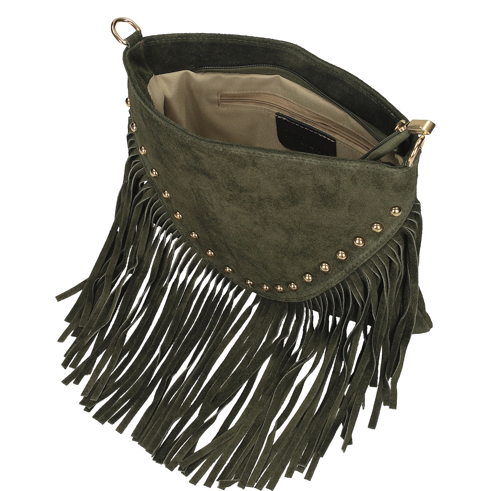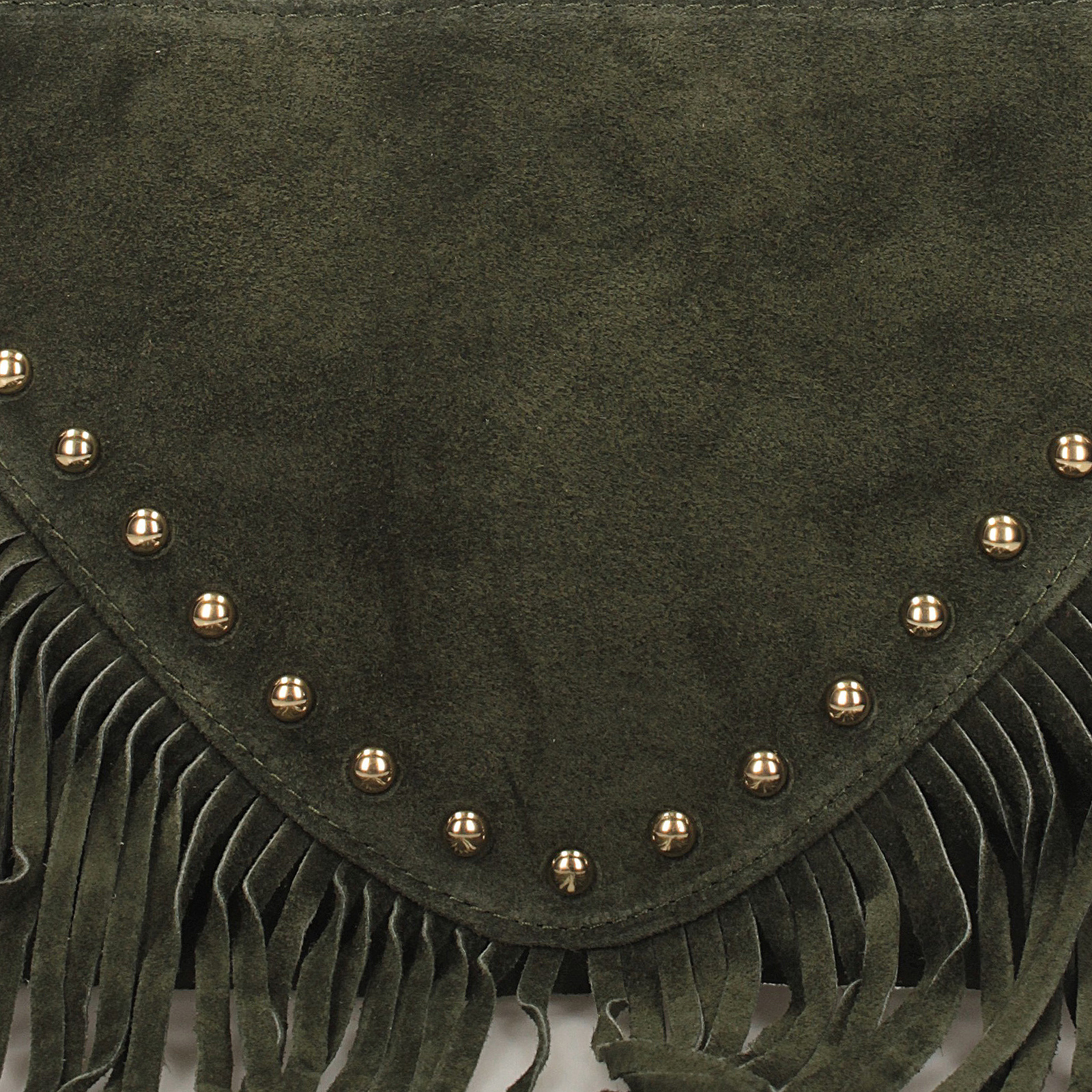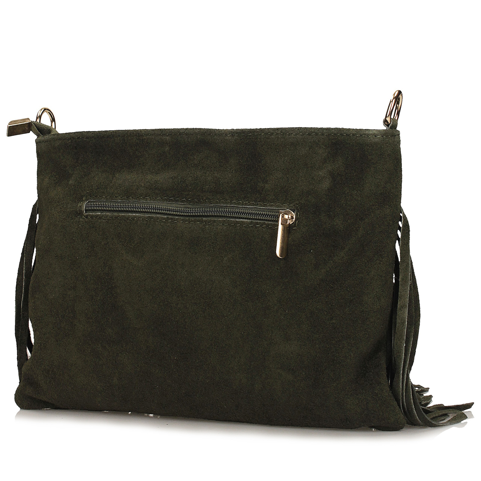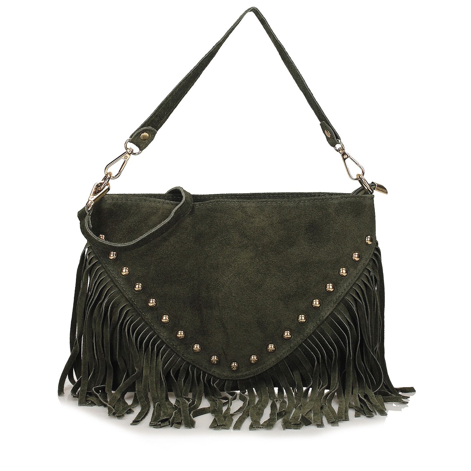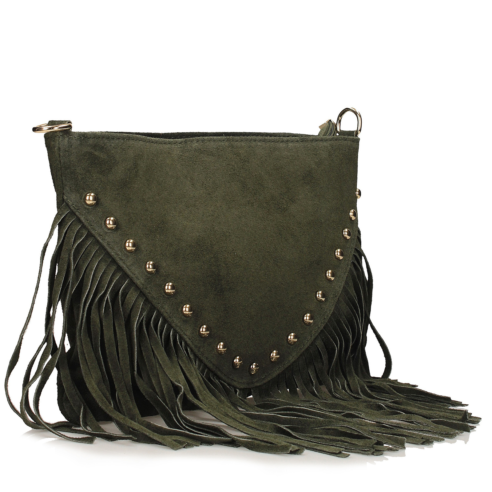 Listonoszka Toscanio w kolorze zielonym to połączenie klasycznej elegancji z modnym, boho charakterem. Wykonana z naturalnej skóry zamszowej, przyciąga uwagę dzięki złotym dżetom oraz efektownym frędzlom, które zdobią przednią klapę. To torebka idealna dla kobiet, które cenią niepowtarzalny styl i wysoką jakość.