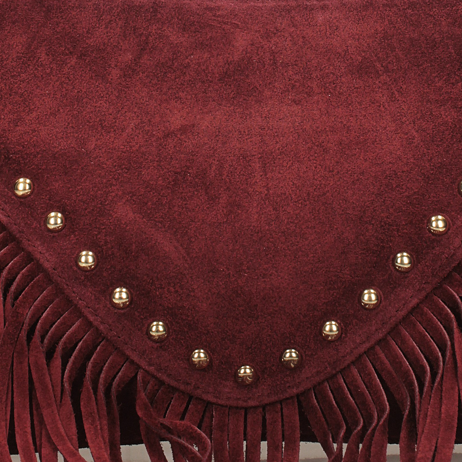Listonoszka Toscanio w kolorze bordowym to elegancki dodatek, który wyróżnia się oryginalnym charakterem. Wykonana z naturalnej skóry zamszowej, posiada ozdobną klapę z efektownymi złotymi dżetami oraz frędzlami, które nadają jej lekko rockowego stylu. Idealna na co dzień i na specjalne okazje.