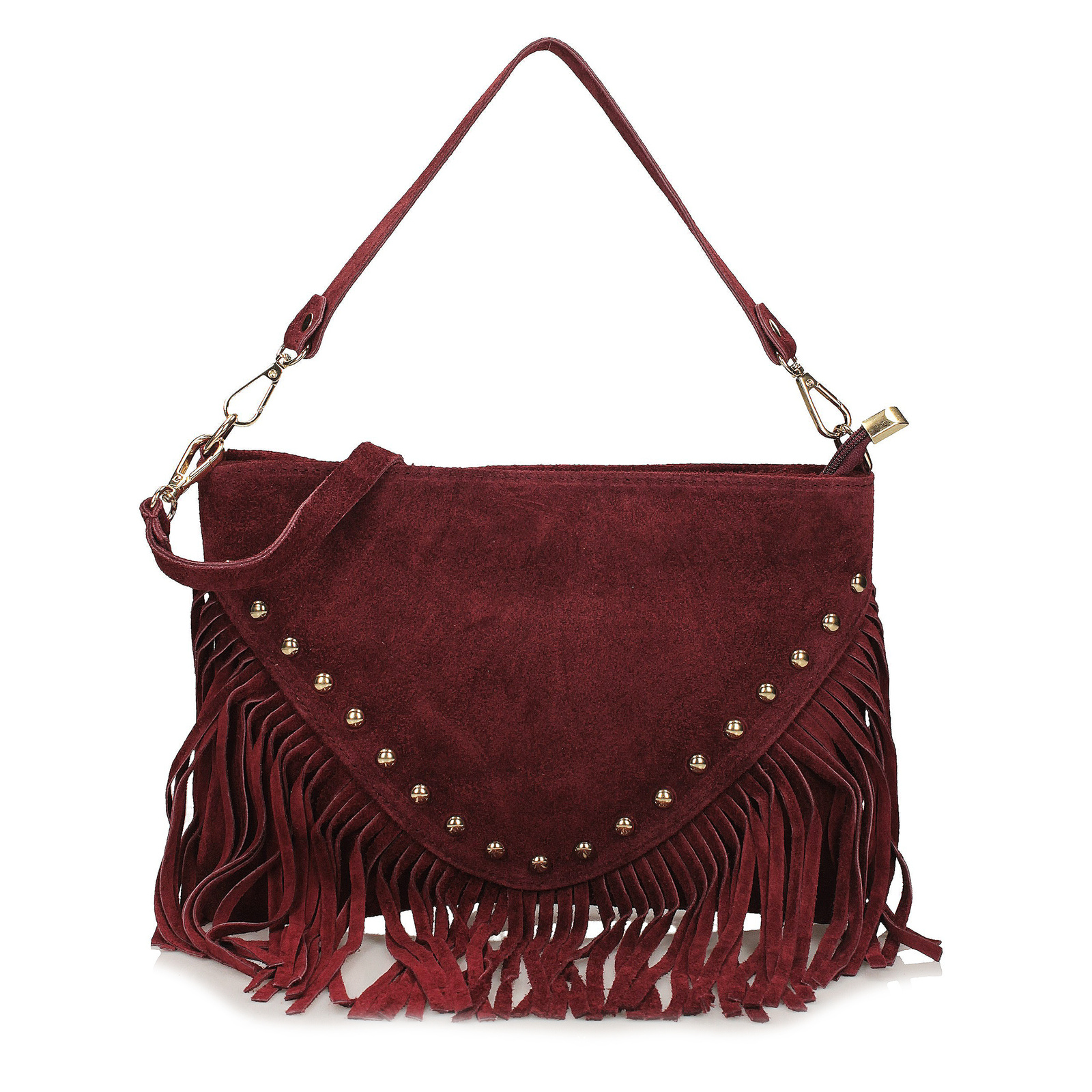 Bordowa listonoszka Toscanio to świetny wybór dla kobiet, które chcą dodać swojej stylizacji charakteru. Połączenie klasycznego kroju z ozdobnymi frędzlami i złotymi akcentami sprawia, że torebka jest zarówno praktyczna, jak i efektowna.