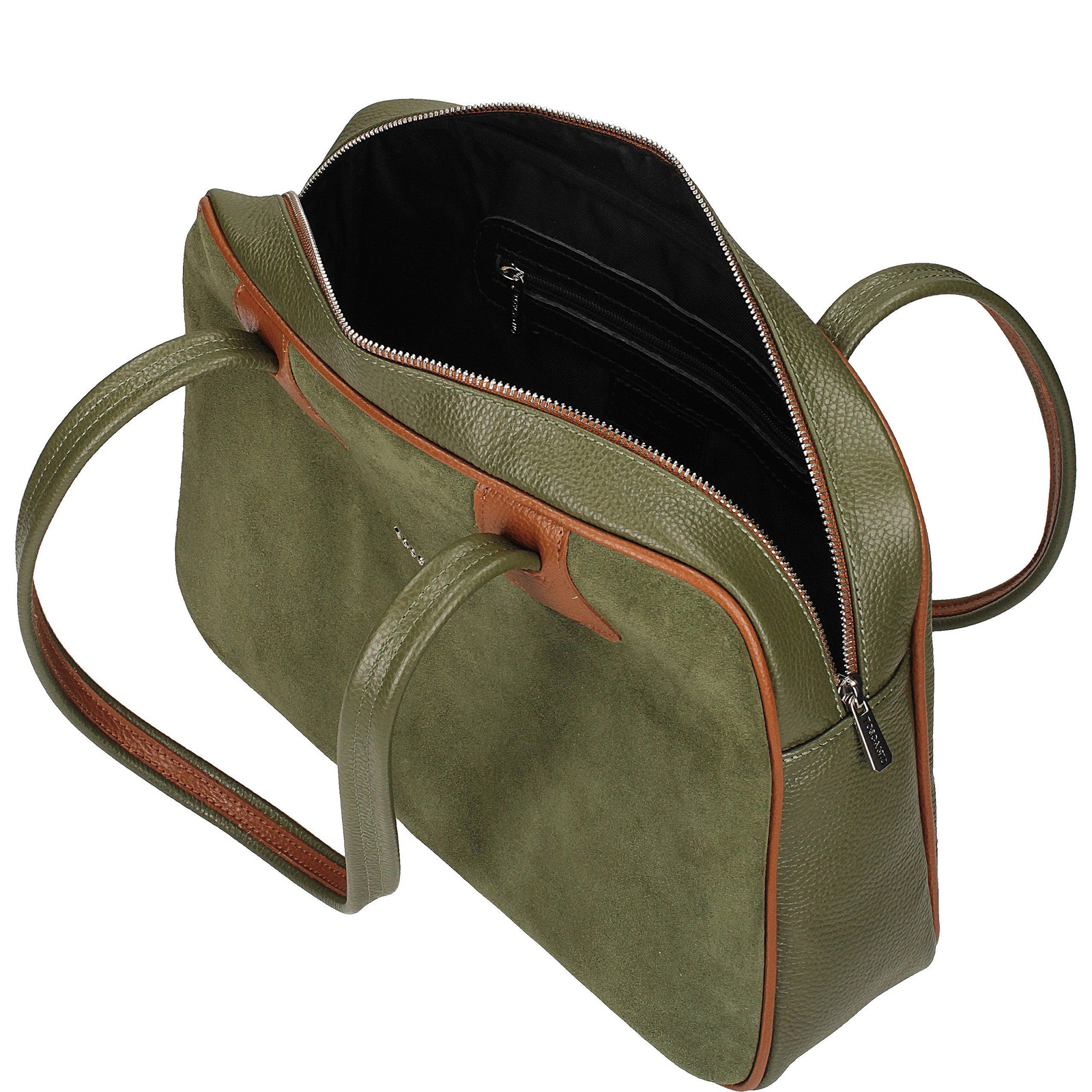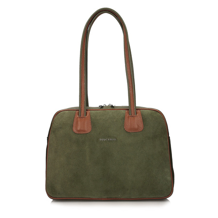 Elegancka torebka Toscanio w kolorze zielonym z rudymi wykończeniami to idealne połączenie klasyki i niebanalnego stylu. Wykonana z wysokiej jakości skóry naturalnej zamszowej, zachwyca miękką strukturą i starannym wykonaniem. Subtelne, rude detale nadają jej wyjątkowego charakteru i sprawiają, że wyróżnia się wśród klasycznych modeli.