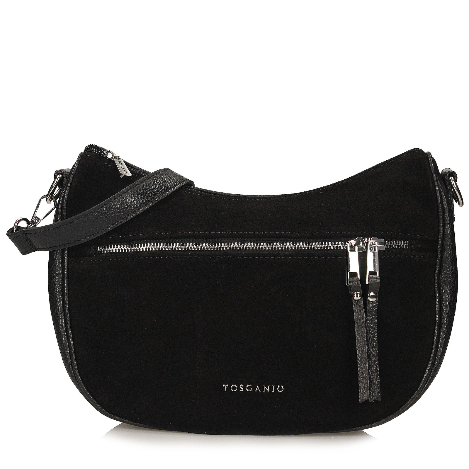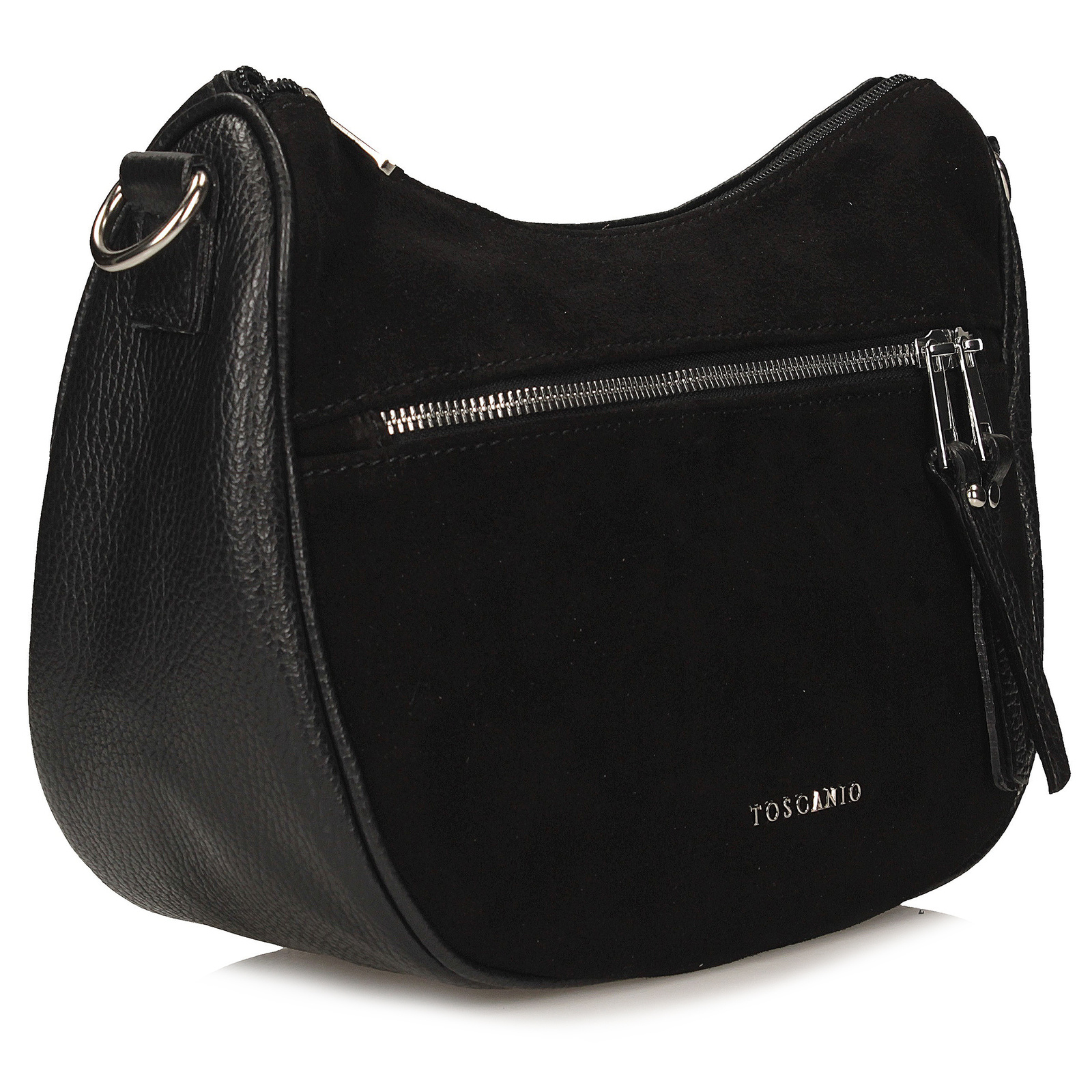 Elegancka listonoszka marki Toscanio to propozycja dla kobiet, które cenią ponadczasowy styl połączony z nutą nowoczesności. Wykonana z wysokiej jakości skóry naturalnej, wzbogacona o przedni panel z czarnego zamszu, prezentuje się wyjątkowo szykownie i uniwersalnie.