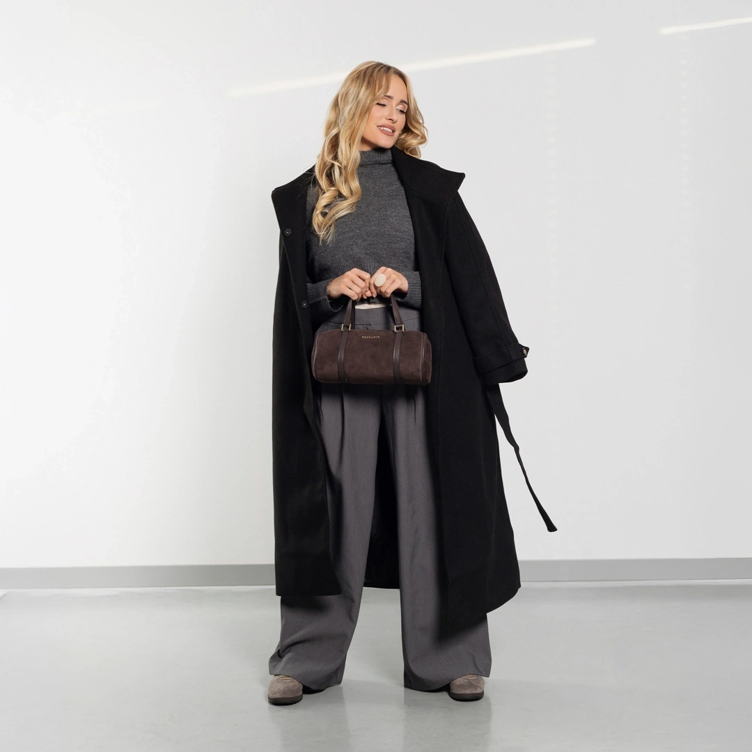 Ten wyjątkowy kuferek Toscanio to połączenie elegancji i oryginalnej formy. Torebka ma kształt walca i została wykonana ze skóry naturalnej zamszowej, uzupełnionej elementami ze skóry licowej, co nadaje jej nietuzinkowego charakteru.