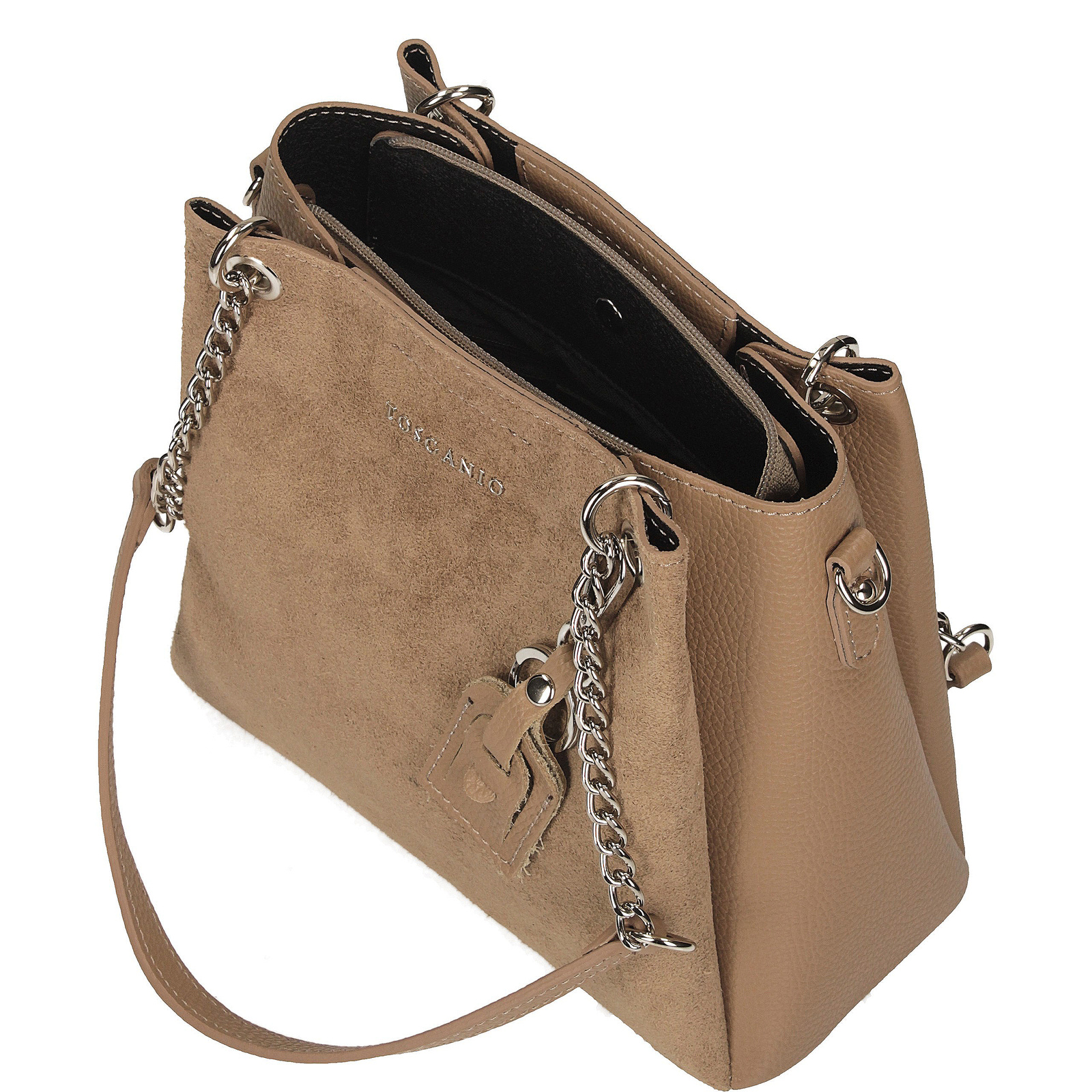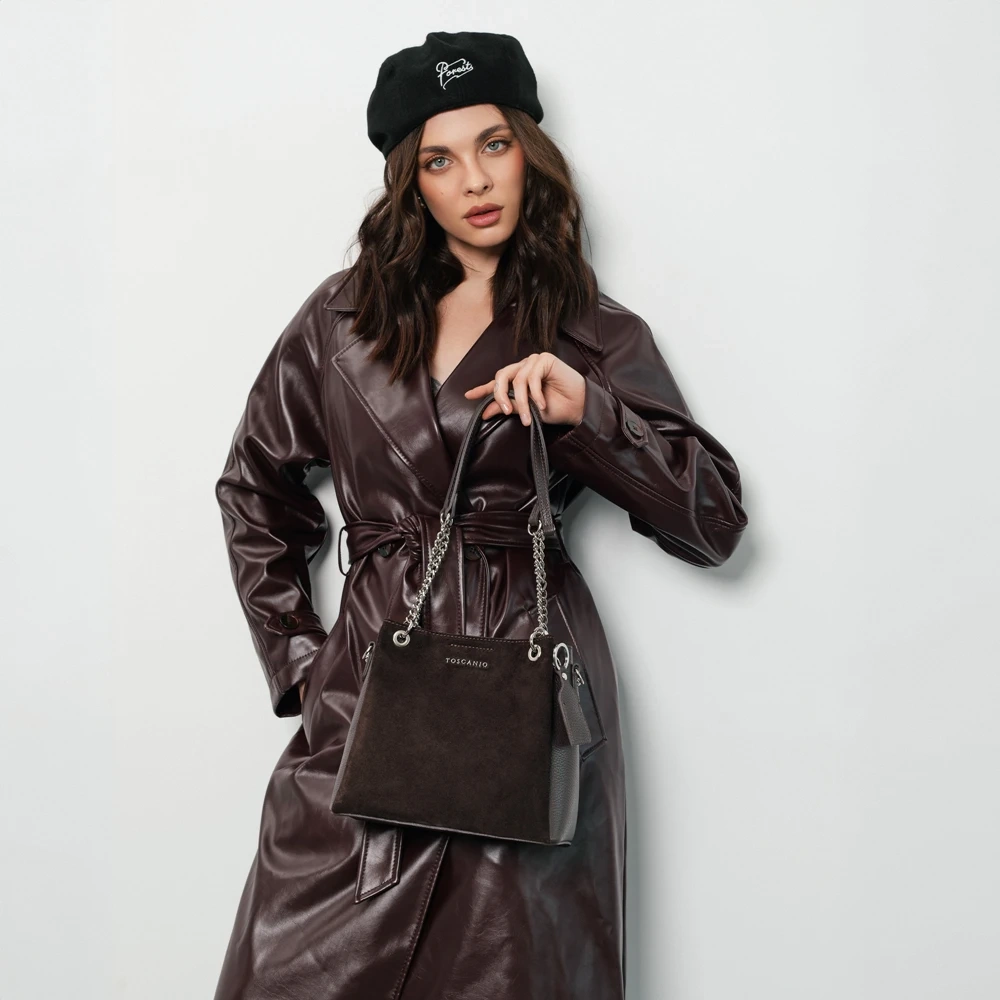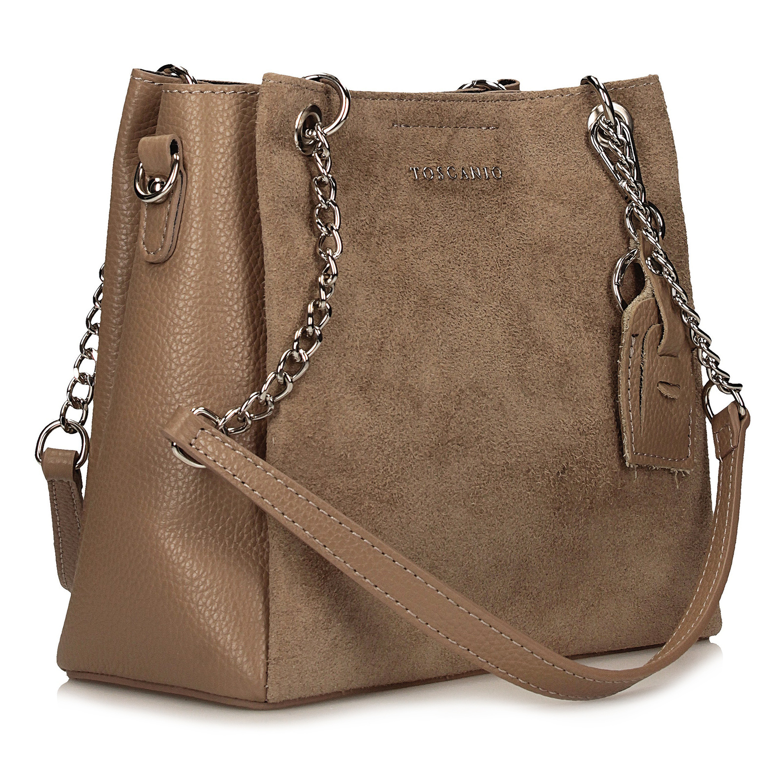 Ciemnobeżowy kuferek marki Toscanio to propozycja dla kobiet, które cenią ponadczasową elegancję połączoną z praktycznym charakterem. Wykonany z wysokiej jakości skóry naturalnej, wyróżnia się klasyczną formą oraz panelem z miękkiej skóry zamszowej na przedniej części, który dodaje mu wyjątkowego uroku i modnej głębi.