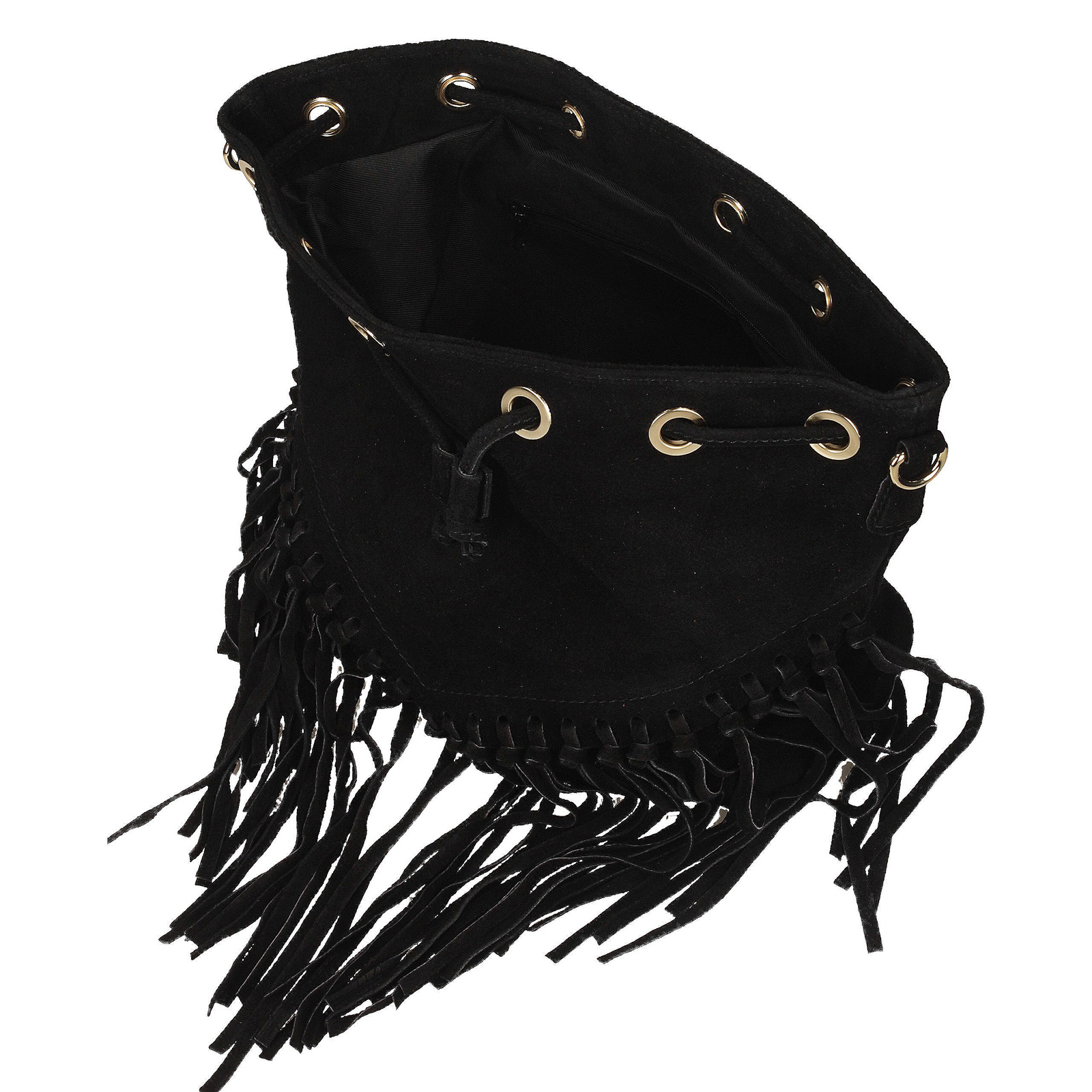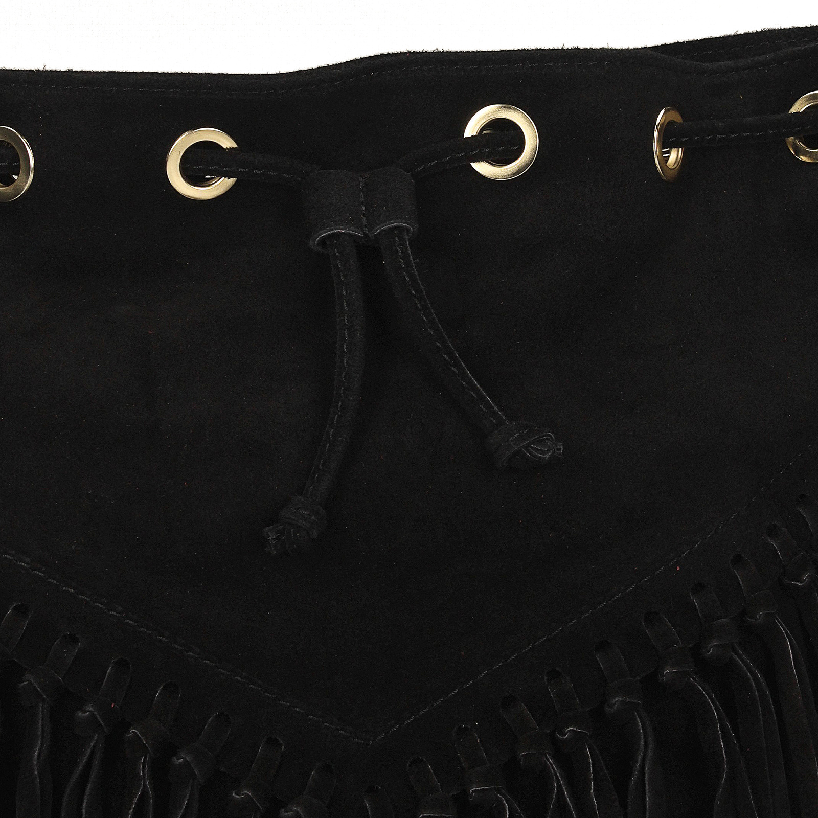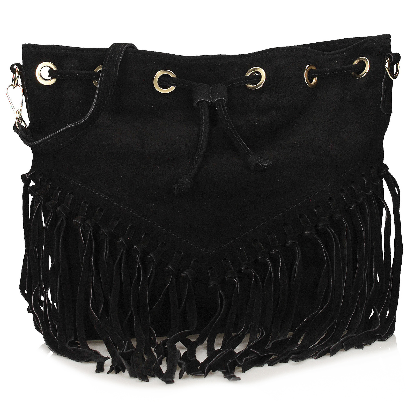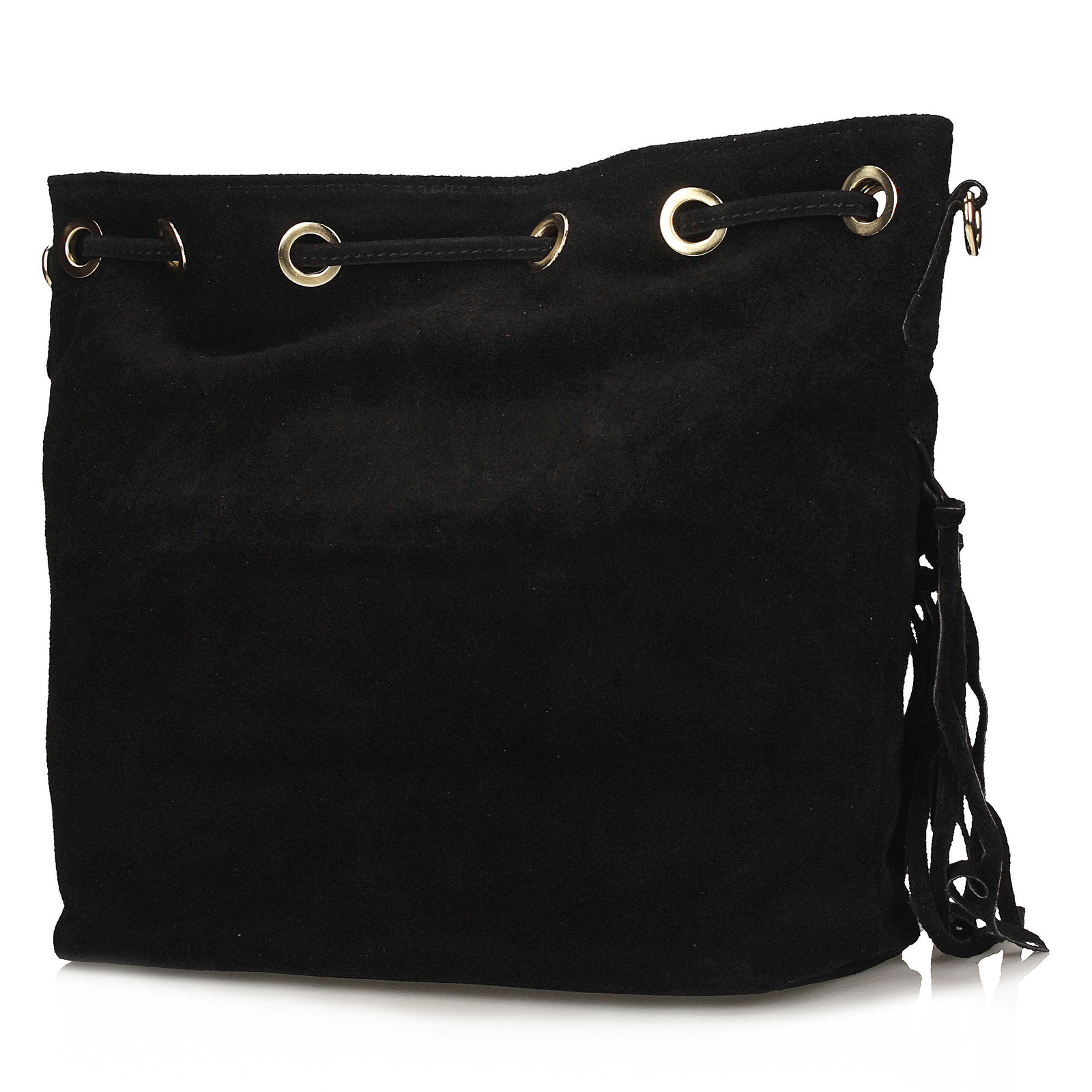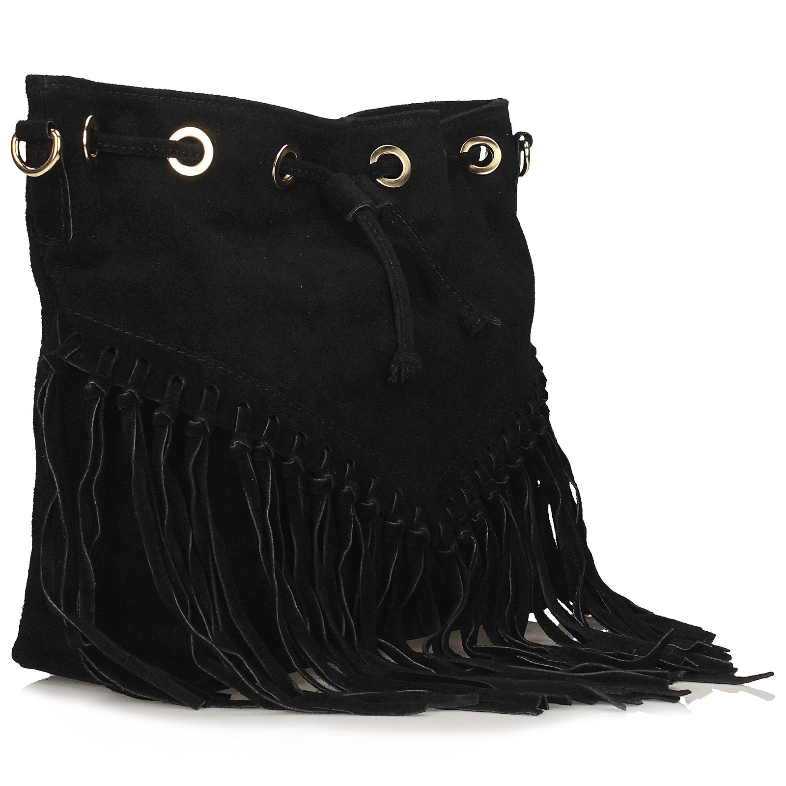 Listonoszka Toscanio w kolorze czarnym to wyjątkowy model stworzony z myślą o kobietach ceniących oryginalny design i wygodę. W całości wykonana ze skóry naturalnej zamszowej, wyróżnia się miękką fakturą oraz efektownymi frędzlami, które swobodnie opadają, nadając jej modnego charakteru w stylu boho.